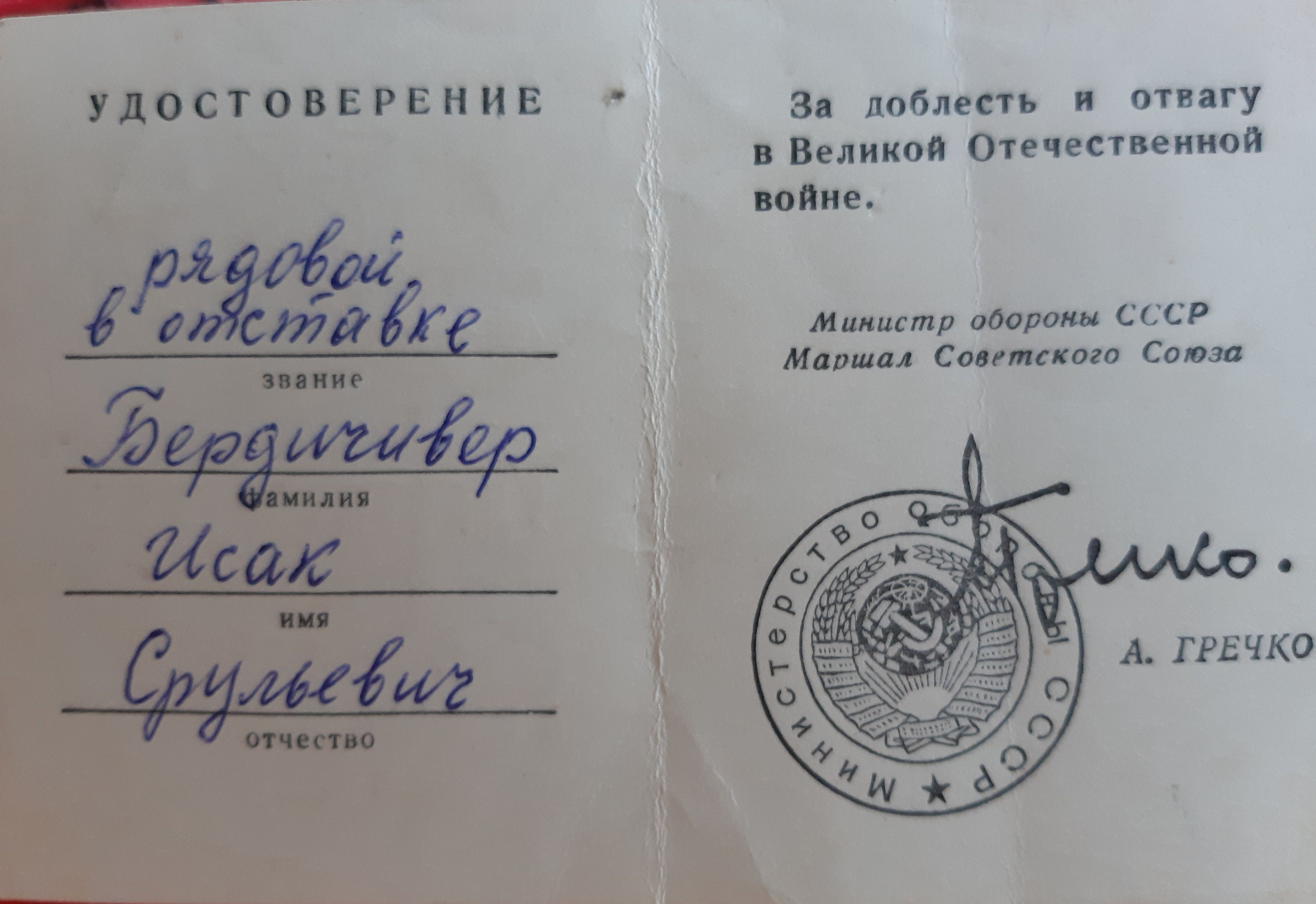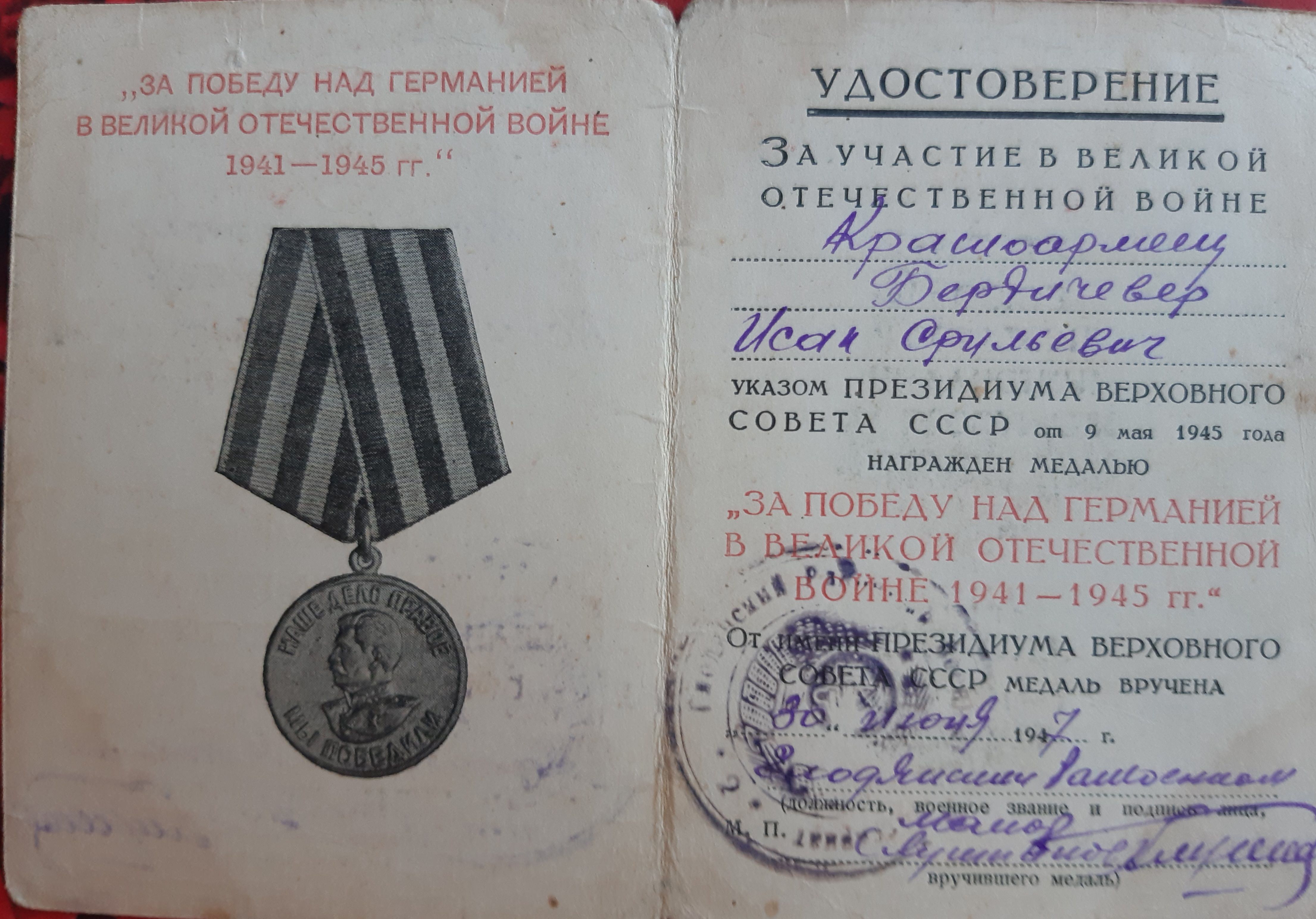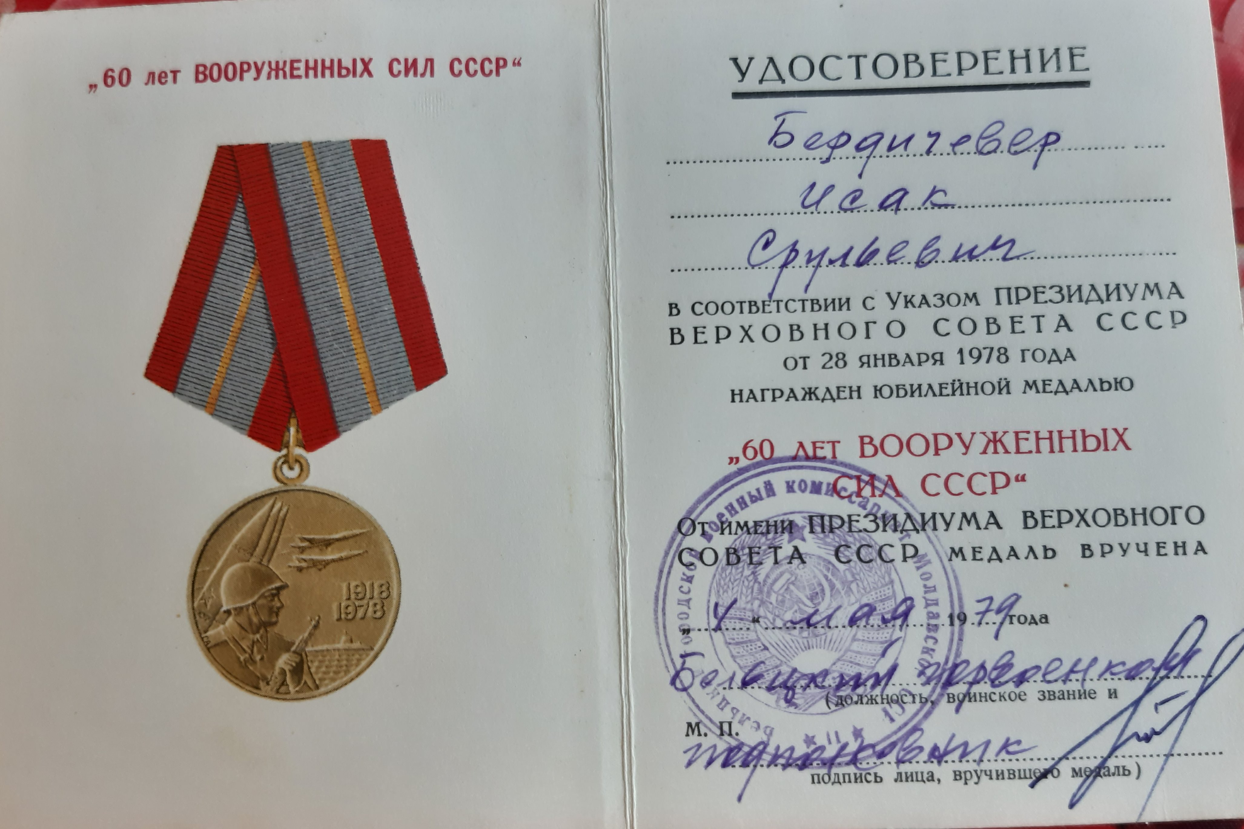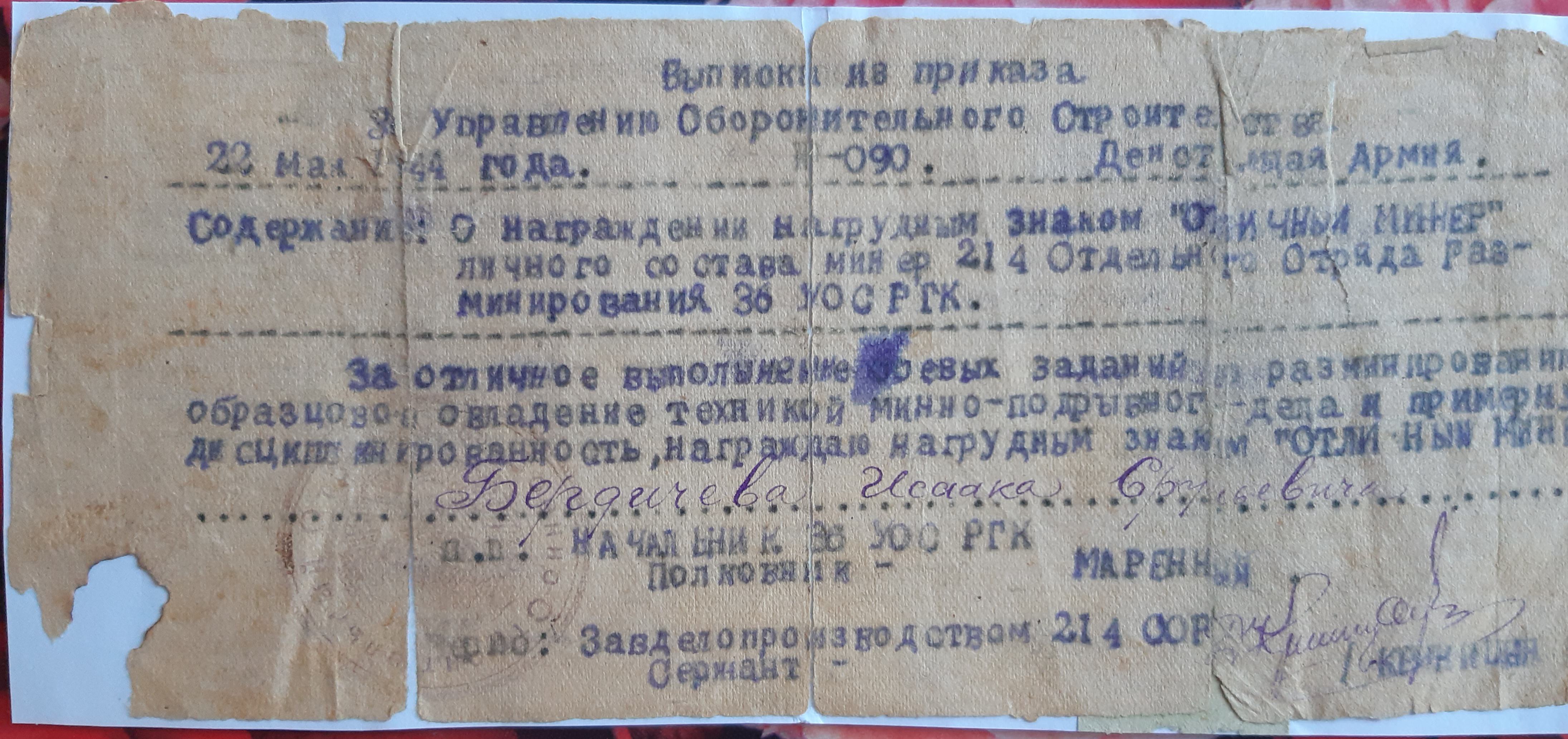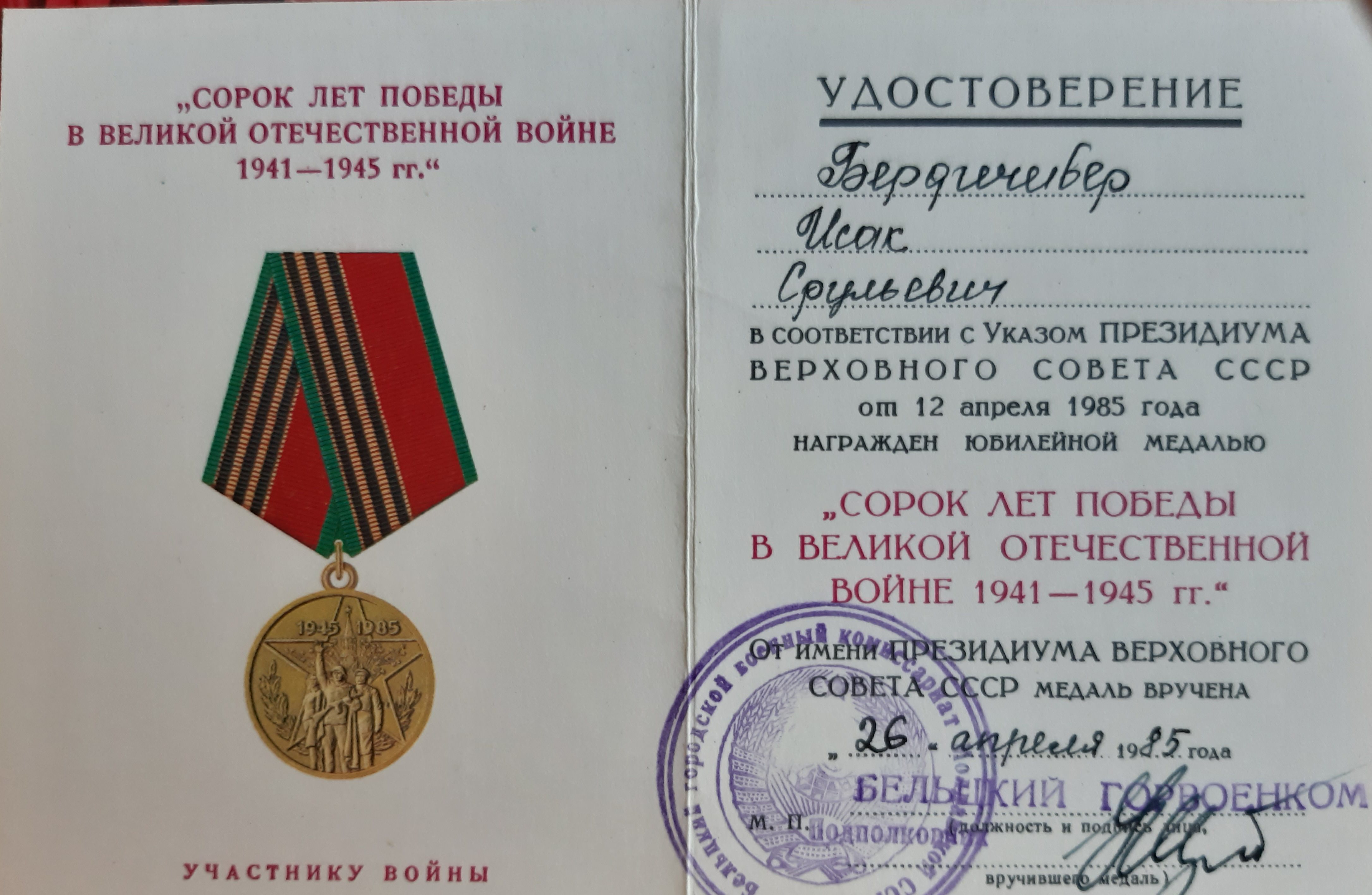 Мой отец Исак Бердичевер в октябре 41-го был призван в армию. 3-х месячное обучение на сапёра-подрывника и фронт. Cапёр -подрывник 214-го отдельного сапёрного батальона Второго Украинского фронта, oн прошёл войну от Сталинграда до Вены. Освобождал в составе 2 Украинского Фронта, Украину, Молдавию, Румынию, Венгрию и Австрию. Награждён орденами и медалями. Но самыми дорогими для него были: нагрудный знак "Отличный сапёр", которым он был награждён одним из первых в Красной армии, и медаль "За оборону Сталинграда".