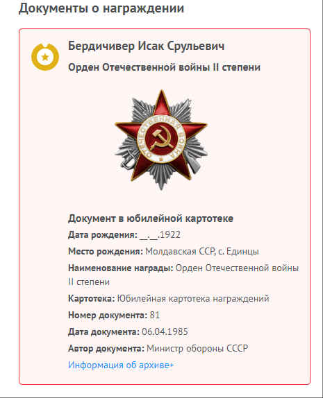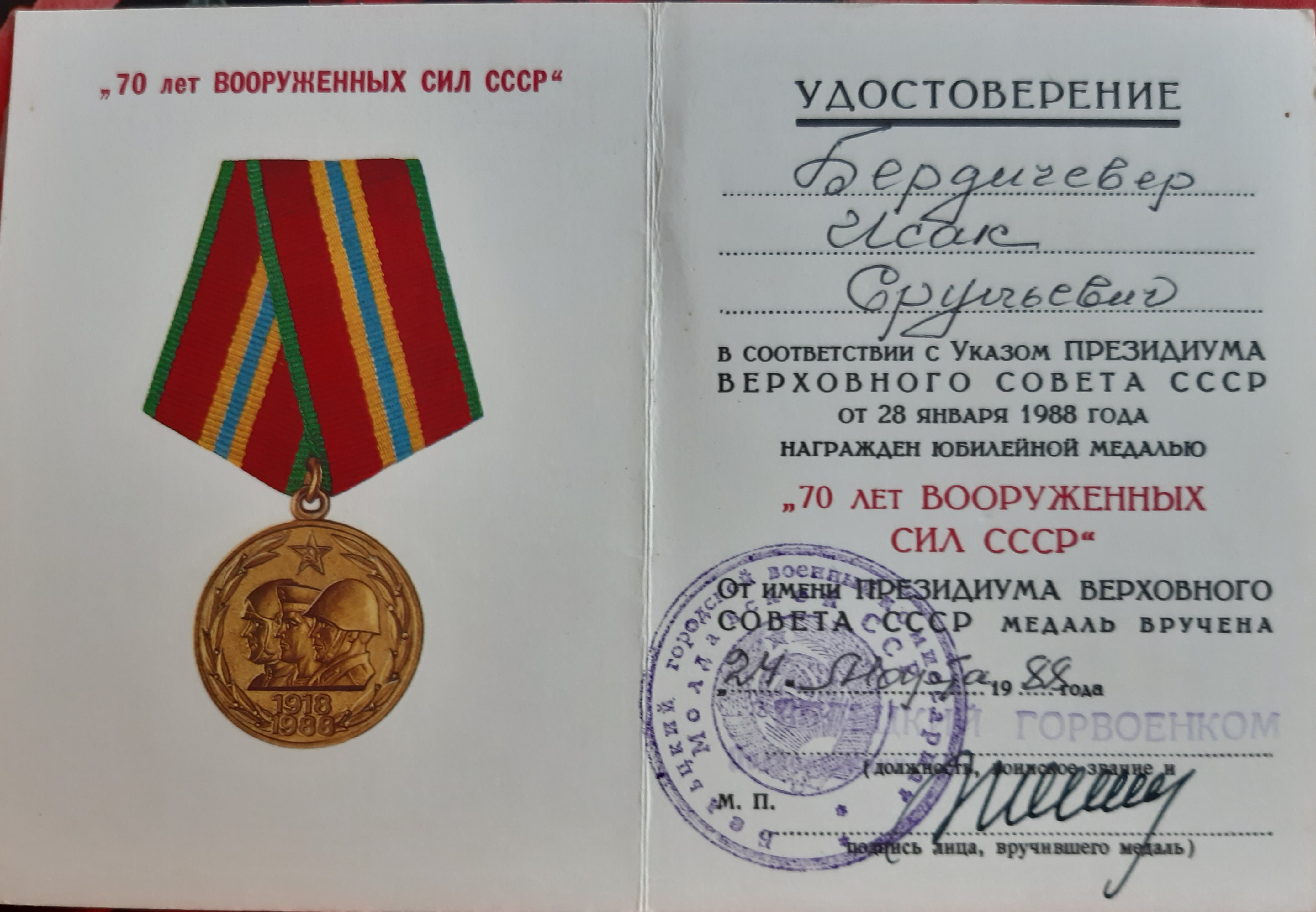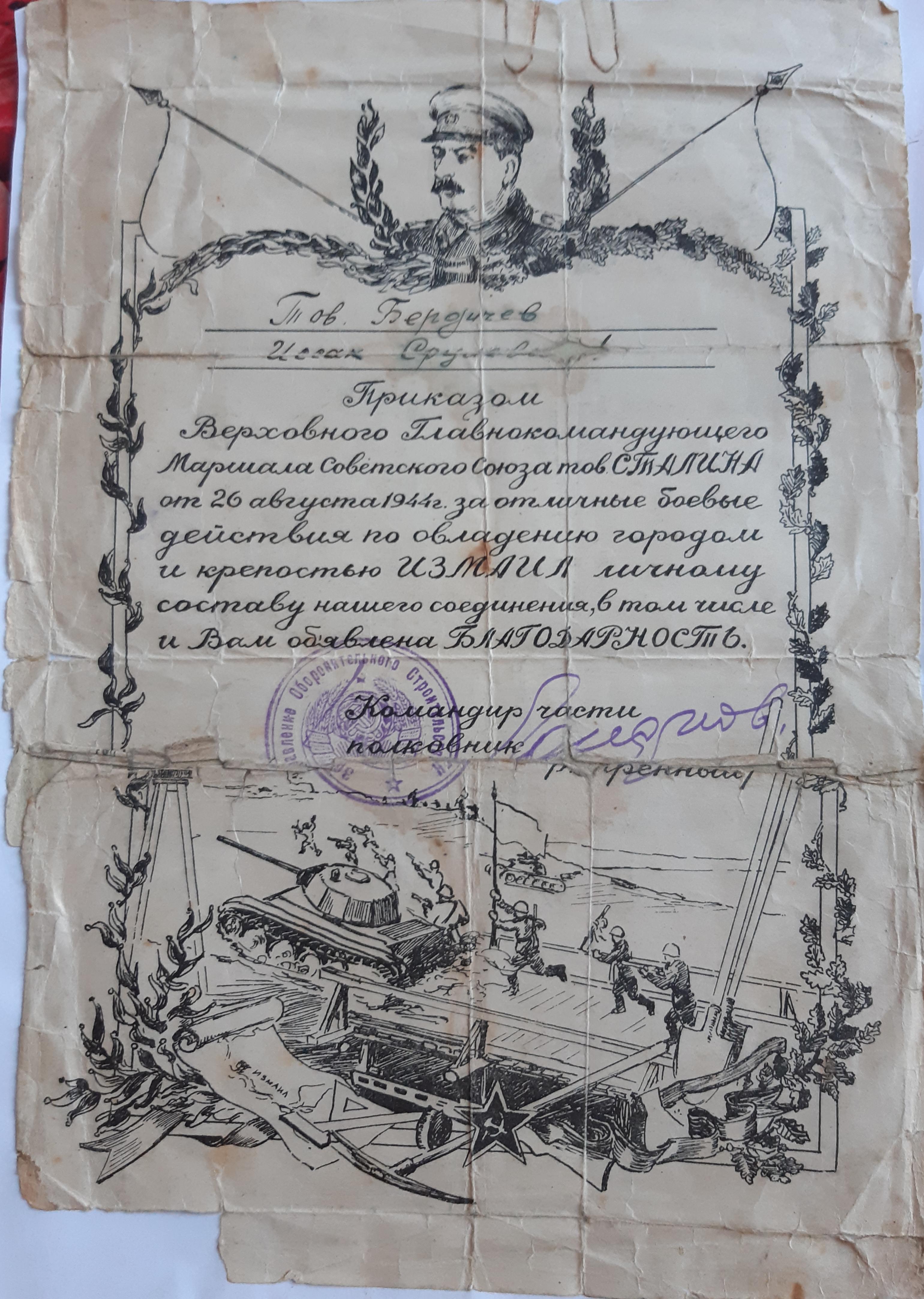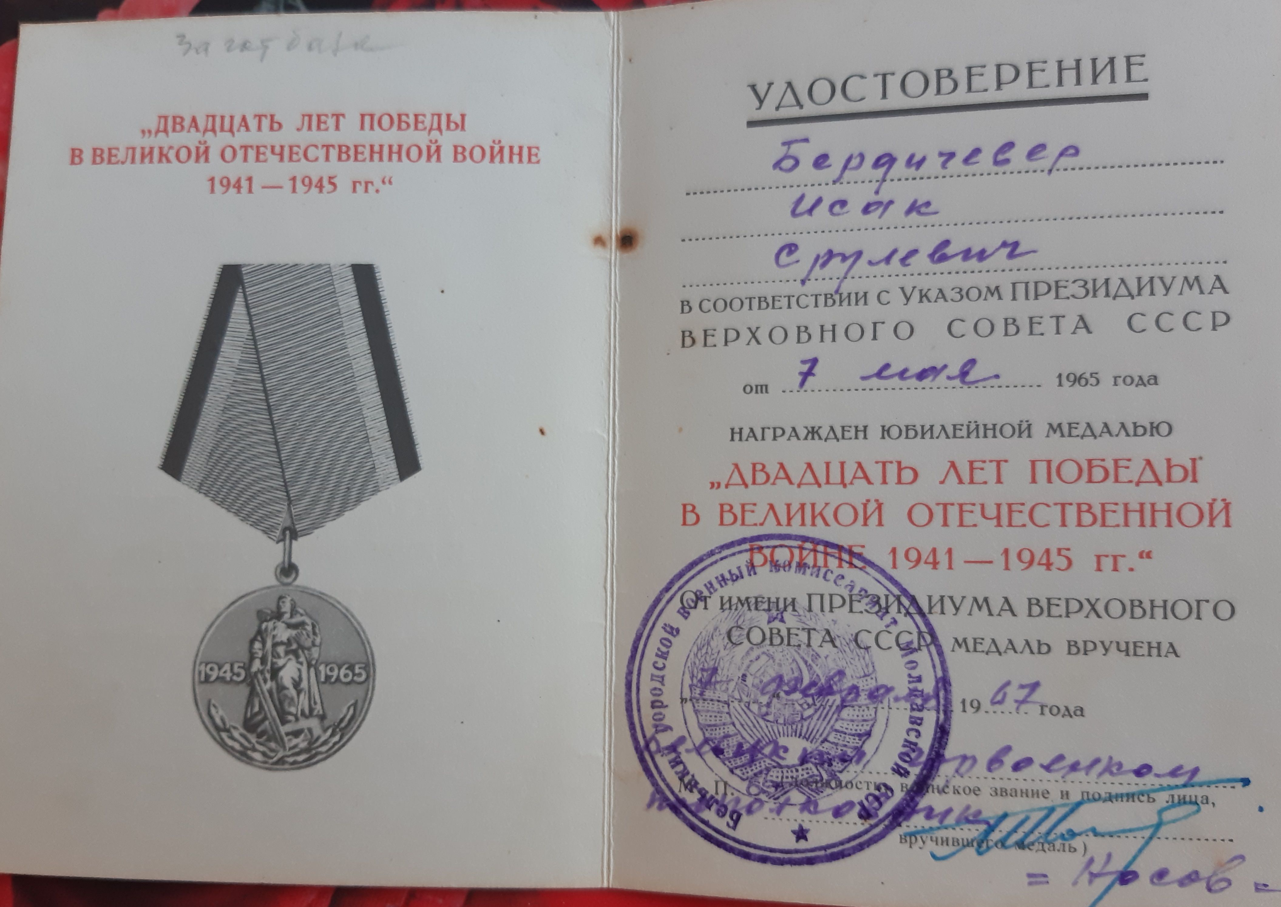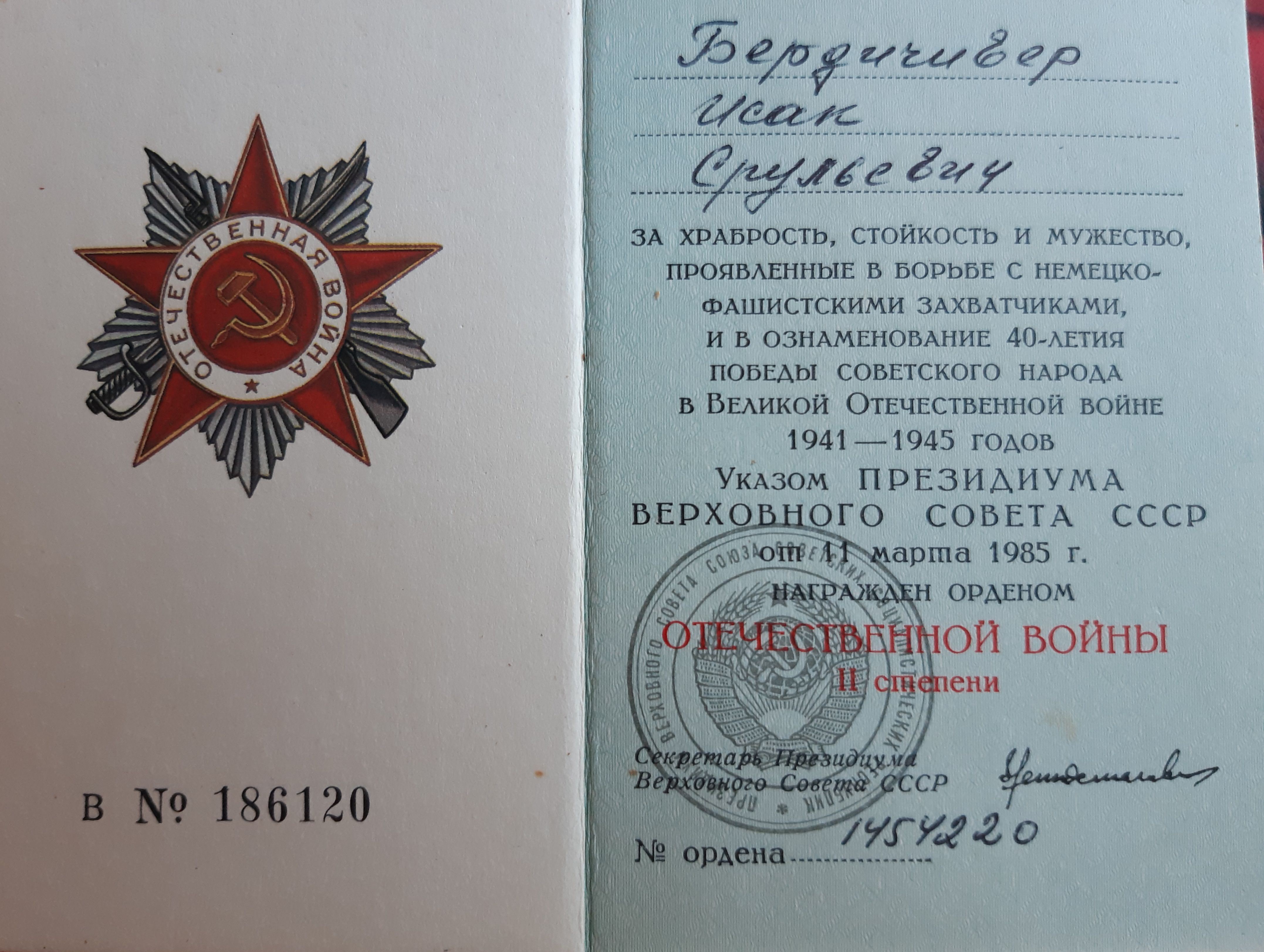 Мой отец Исак Бердичевер в октябре 41-го был призван в армию. 3-х месячное обучение на сапёра-подрывника и фронт. Cапёр -подрывник 214-го отдельного сапёрного батальона Второго Украинского фронта, oн прошёл войну от Сталинграда до Вены. Освобождал в составе 2 Украинского Фронта, Украину, Молдавию, Румынию, Венгрию и Австрию. Награждён орденами и медалями. Но самыми дорогими для него были: нагрудный знак "Отличный сапёр", которым он был награждён одним из первых в Красной армии, и медаль "За оборону Сталинграда".