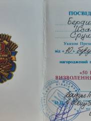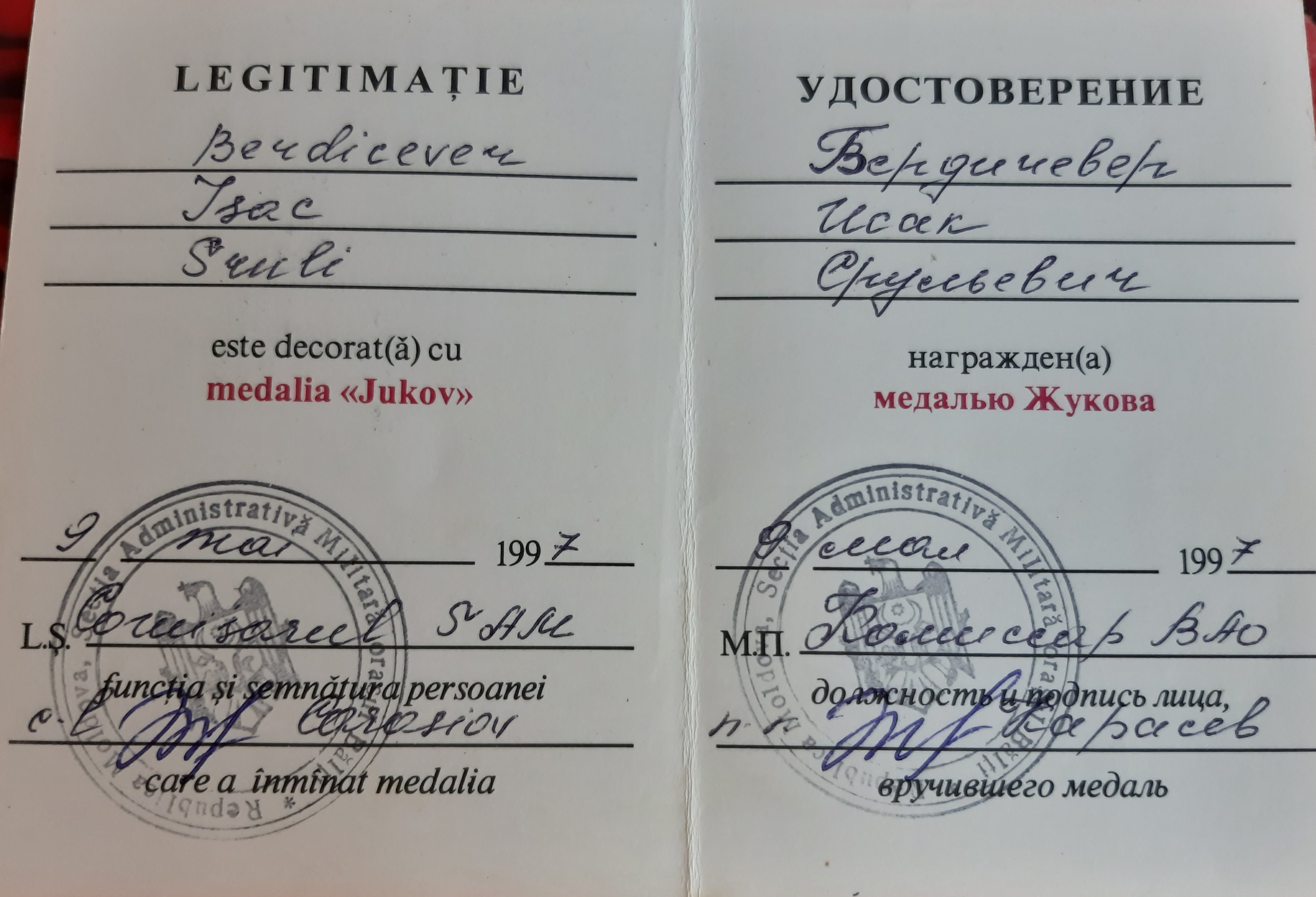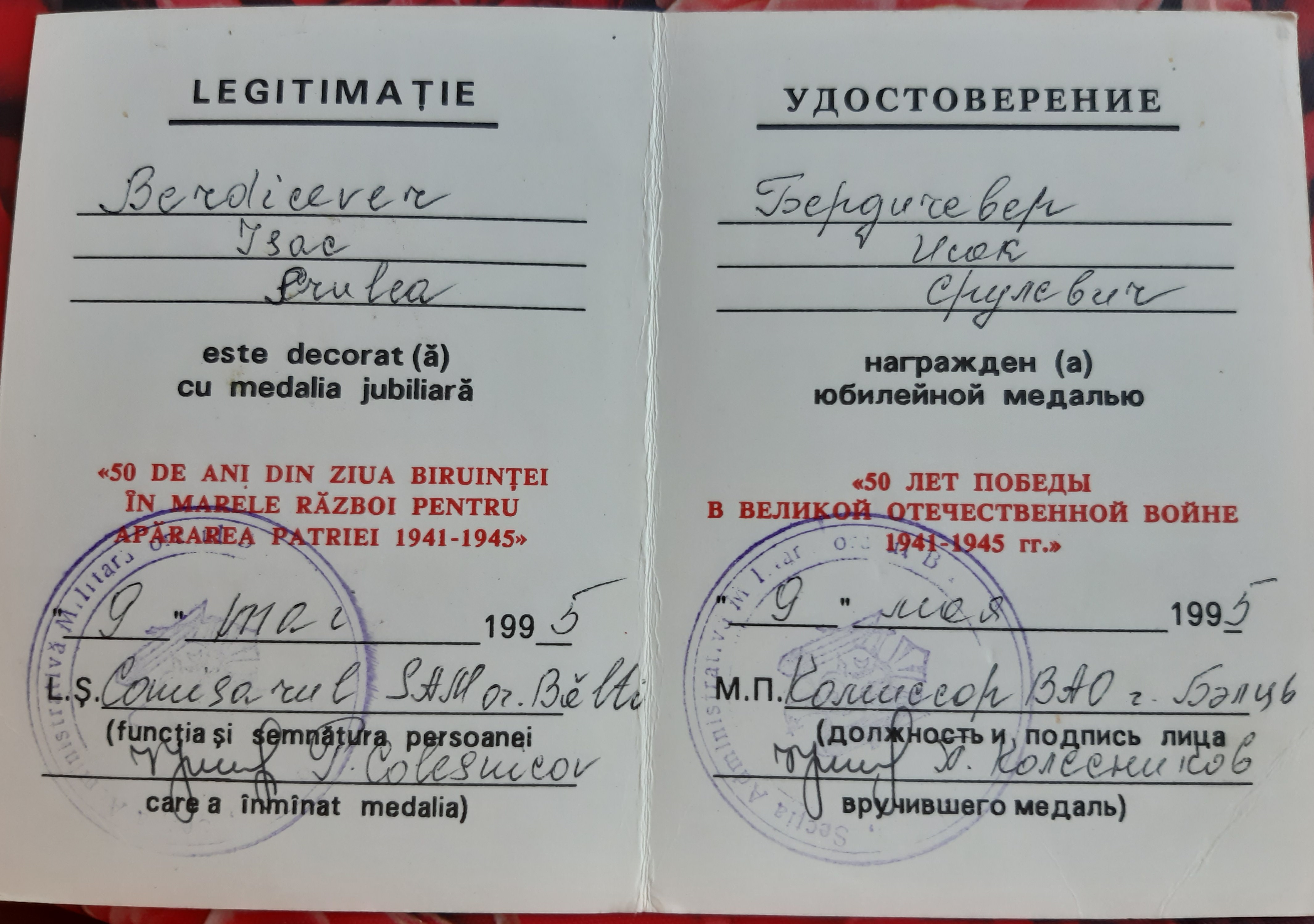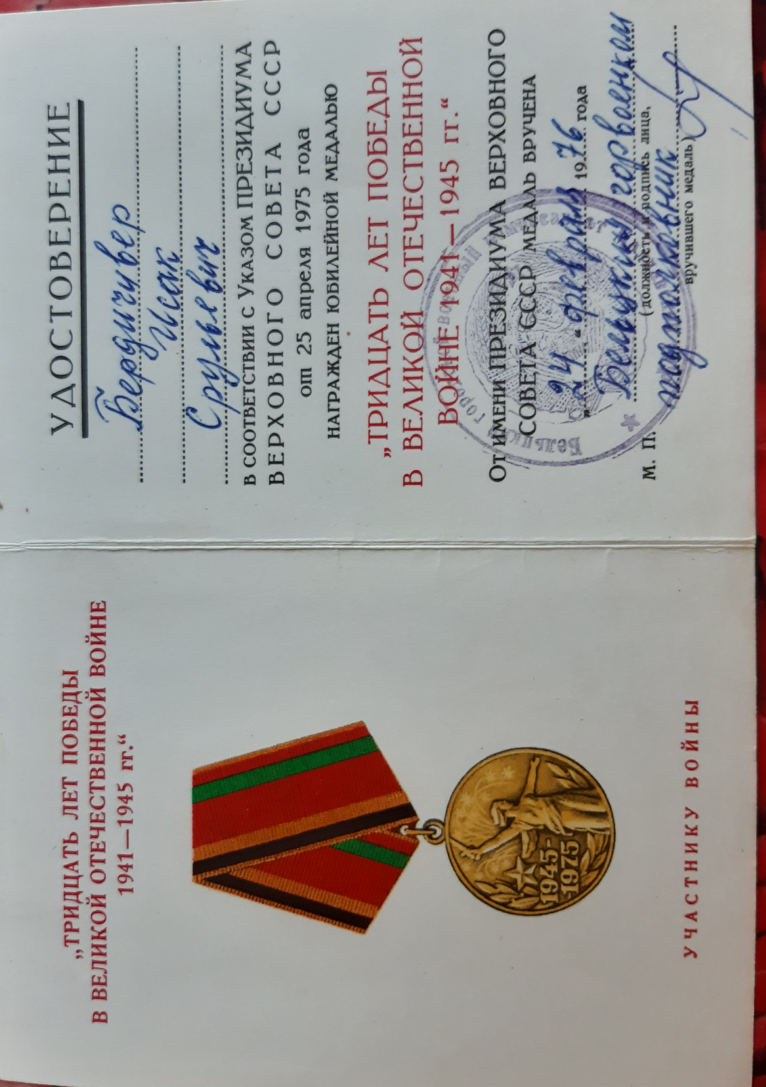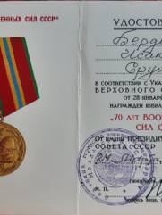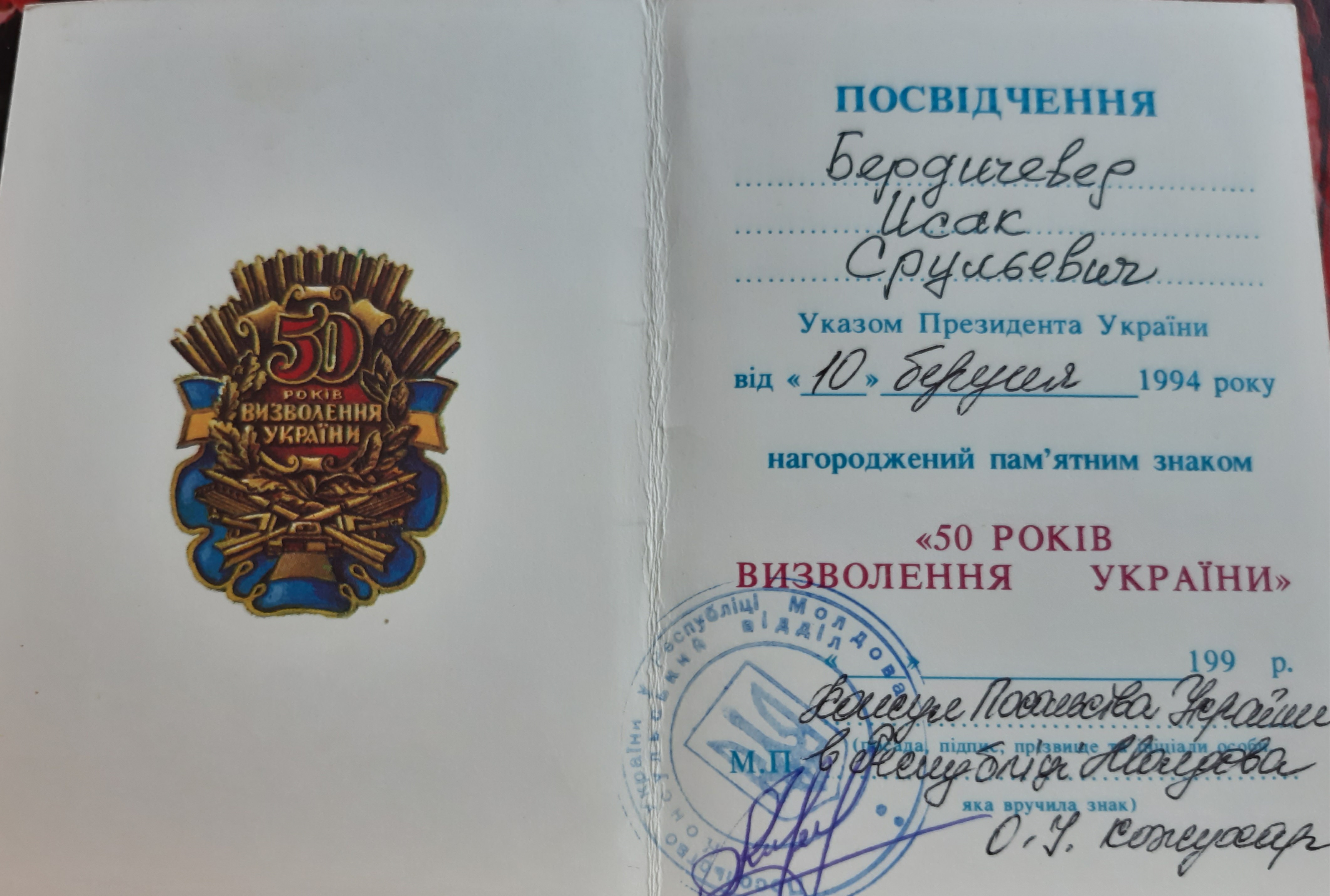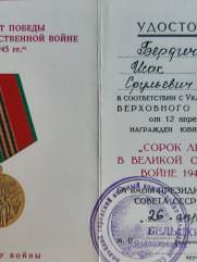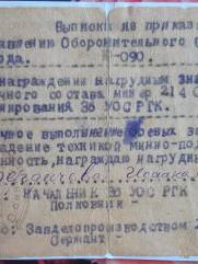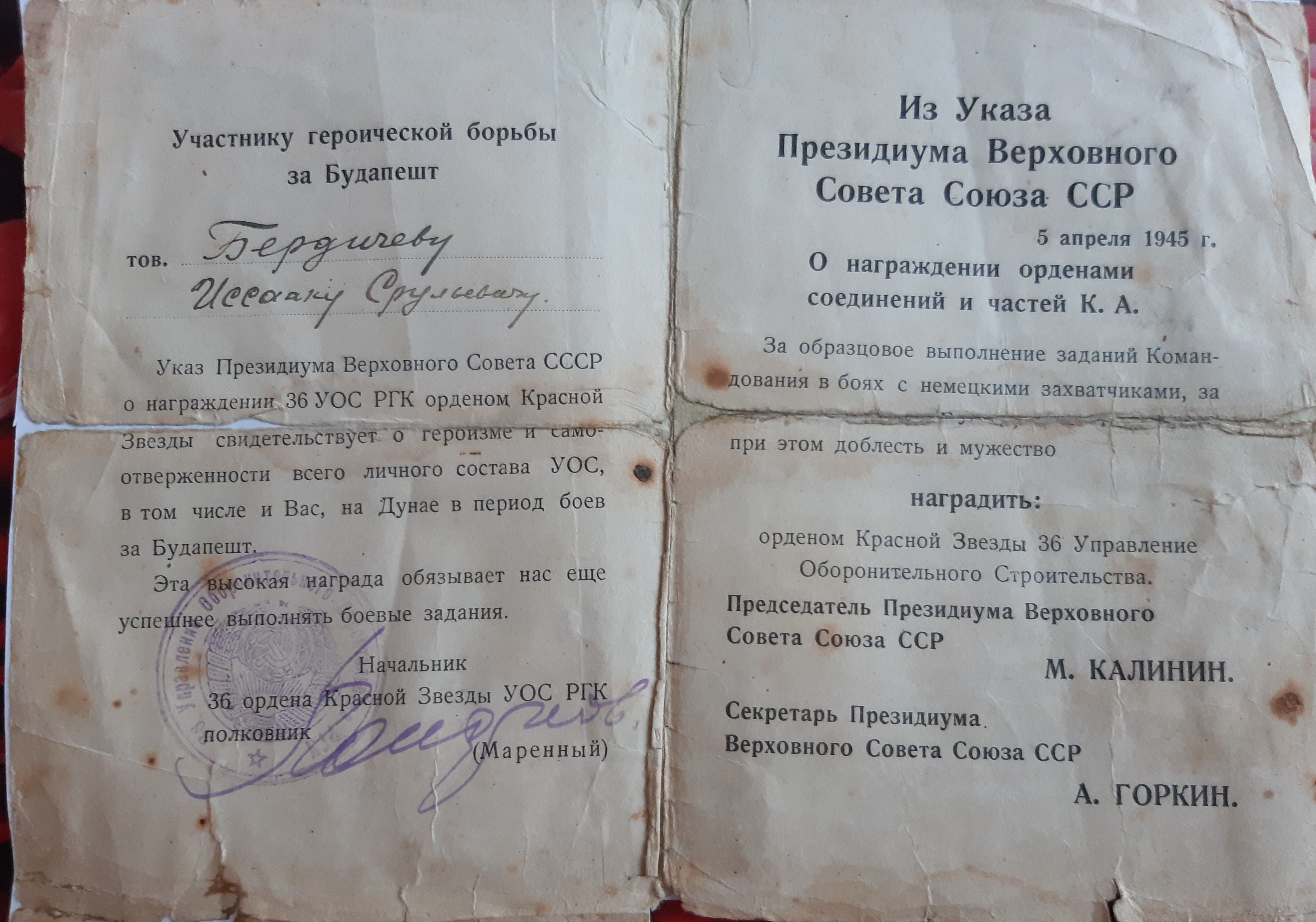 Мой отец Исак Бердичевер в октябре 41-го был призван в армию. 3-х месячное обучение на сапёра-подрывника и фронт. Cапёр -подрывник 214-го отдельного сапёрного батальона Второго Украинского фронта, oн прошёл войну от Сталинграда до Вены. Освобождал в составе 2 Украинского Фронта, Украину, Молдавию, Румынию, Венгрию и Австрию. Награждён орденами и медалями. Но самыми дорогими для него были: нагрудный знак "Отличный сапёр", которым он был награждён одним из первых в Красной армии, и медаль "За оборону Сталинграда".