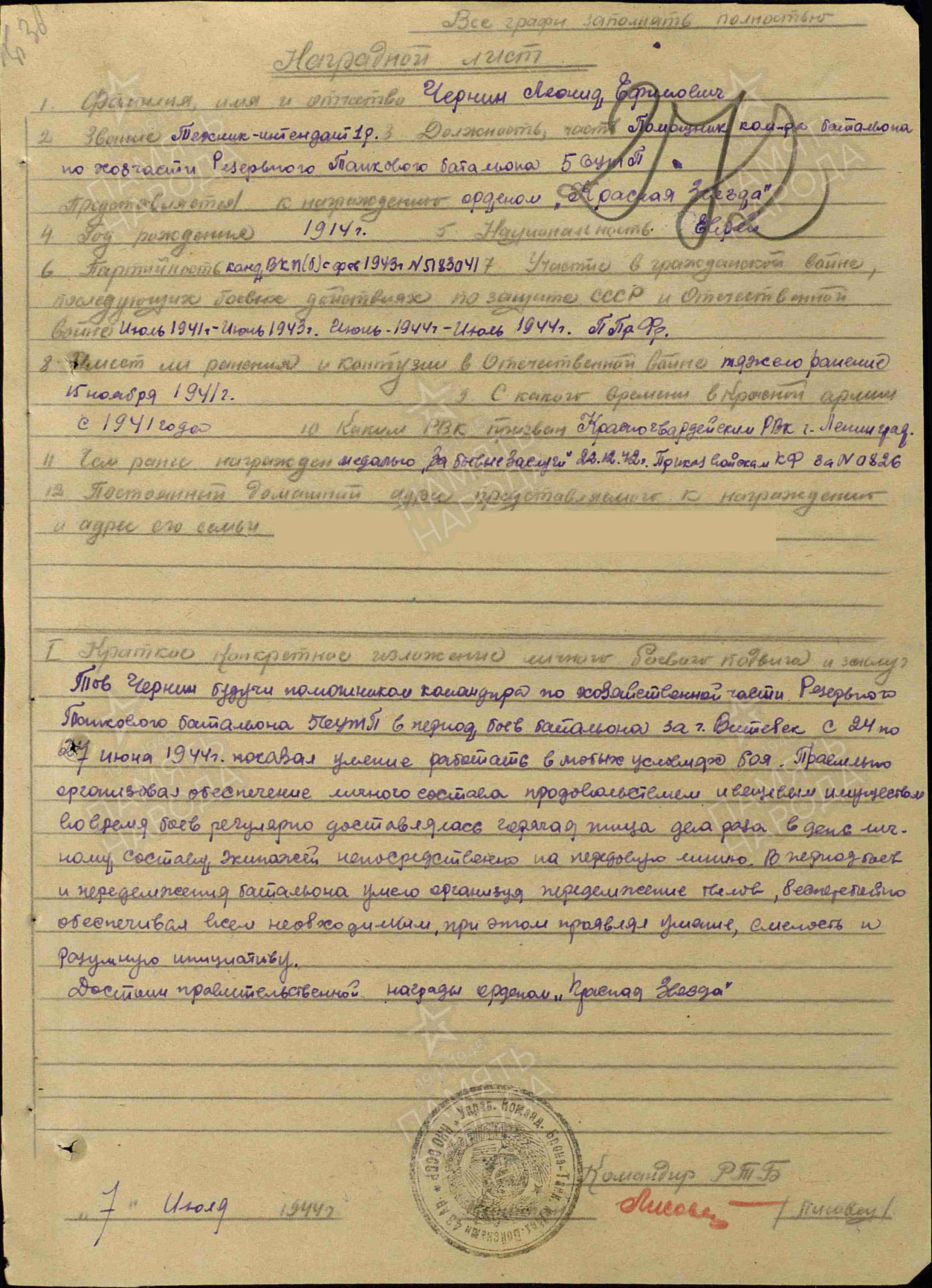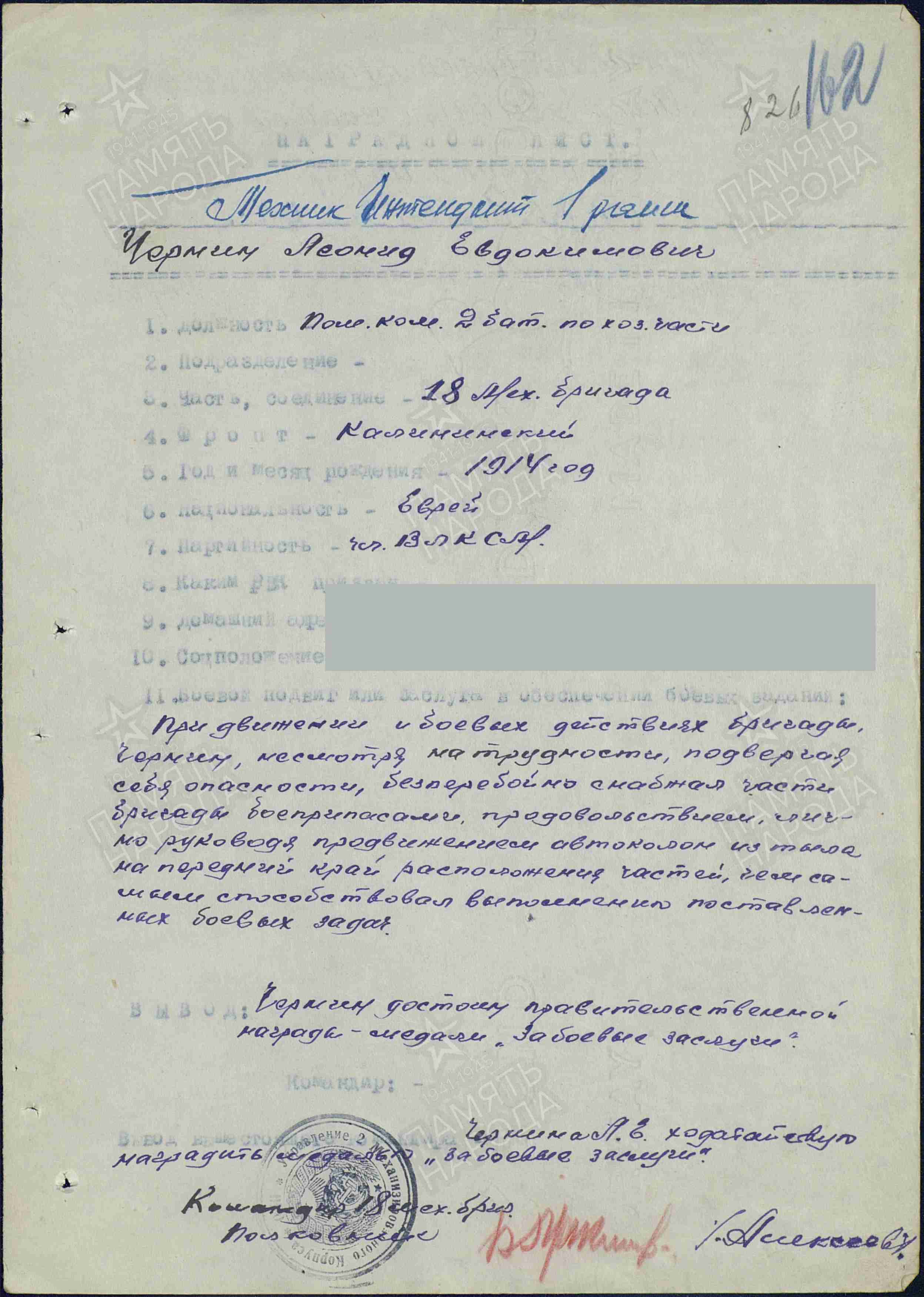 "При движении и боевых действиях бригады Чернин Л.Е., подвергая себя опасности, бесперебойно снабжал части бригады боеприпасами, продовольствием, лично руководя продвижением автоколонн из тыла на передний край, тем самым способствуя выполнению боевых задач".
