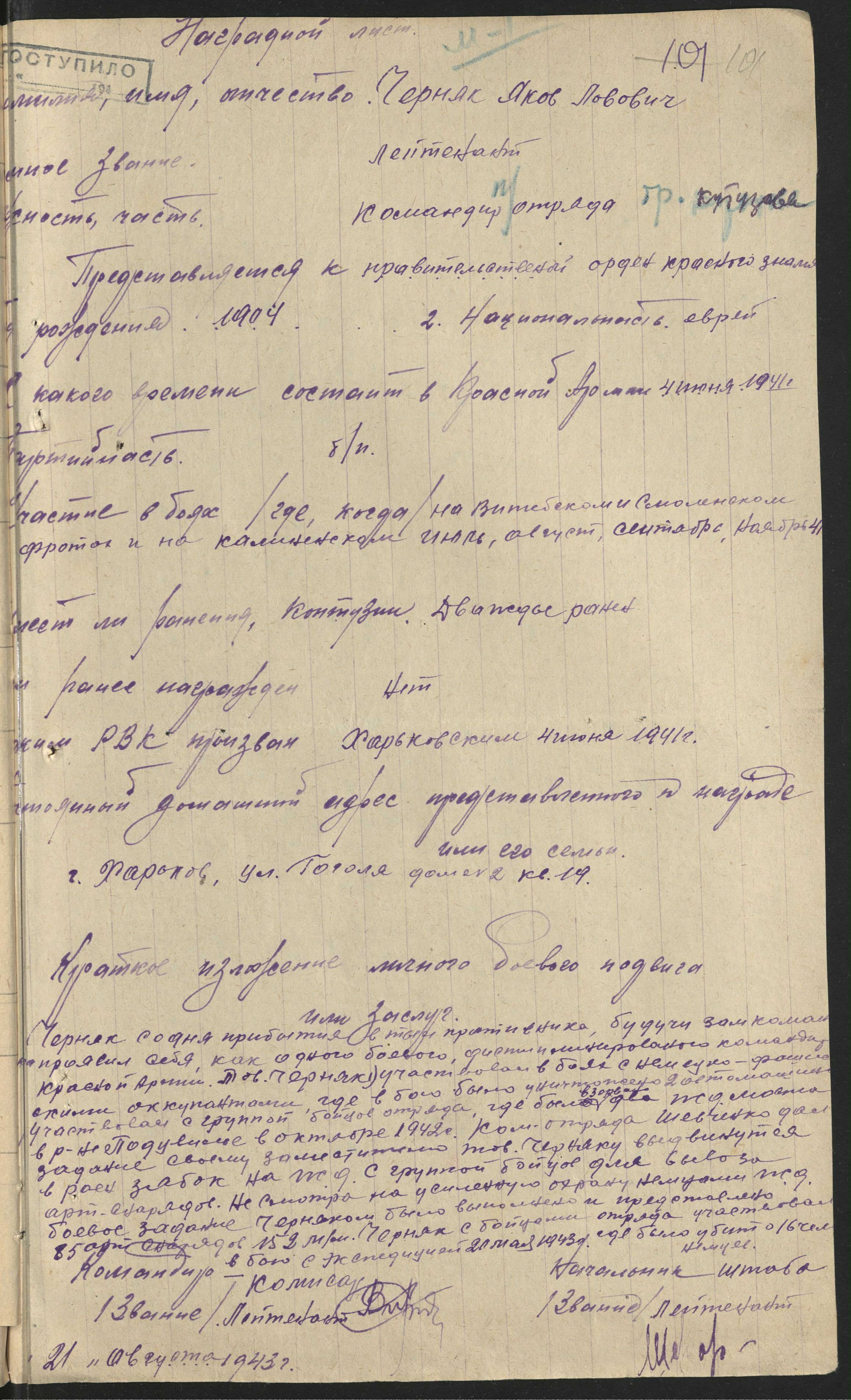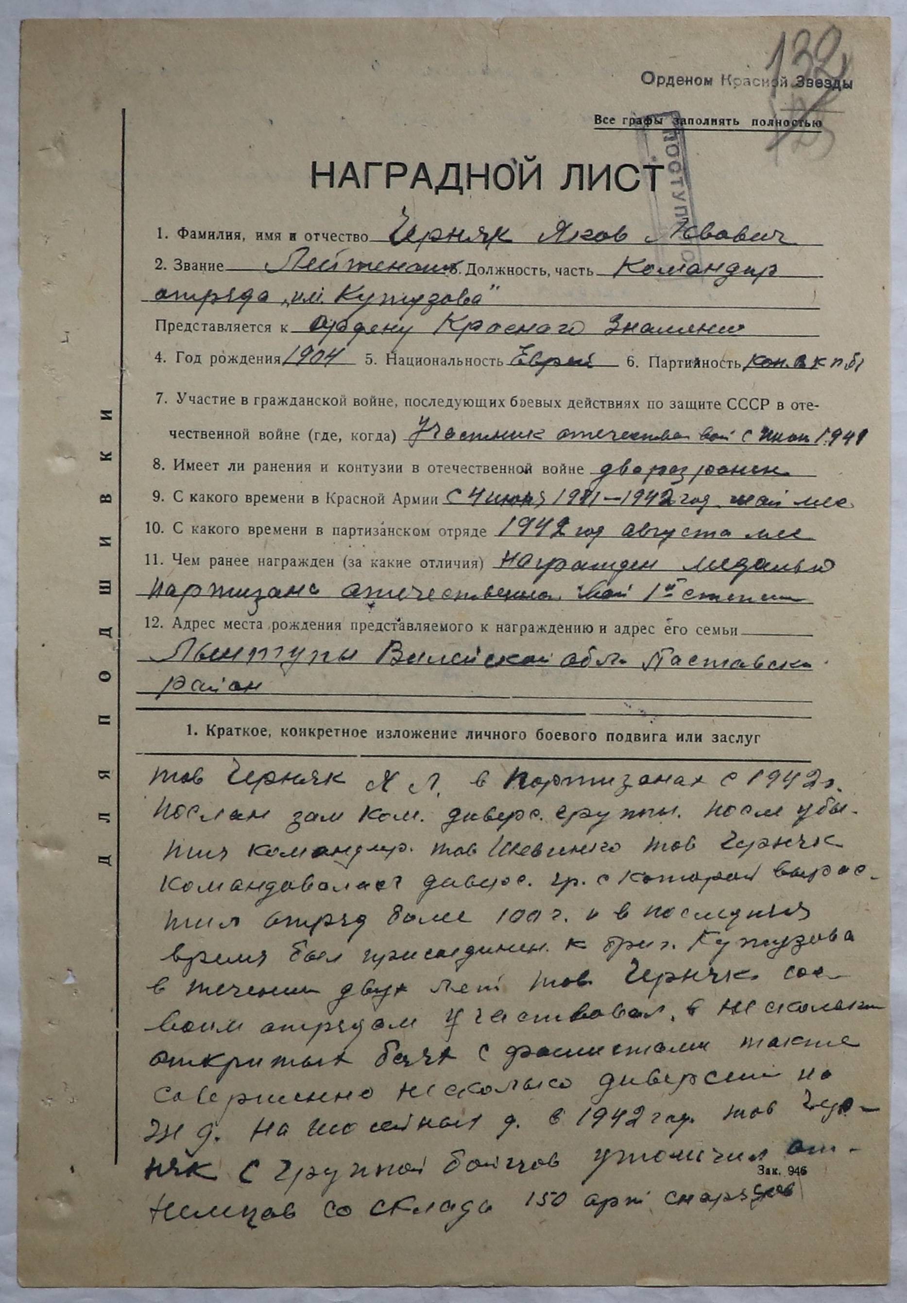 Из наградного листа на командира партизанского отряда л-та Черняк Я.Л.: