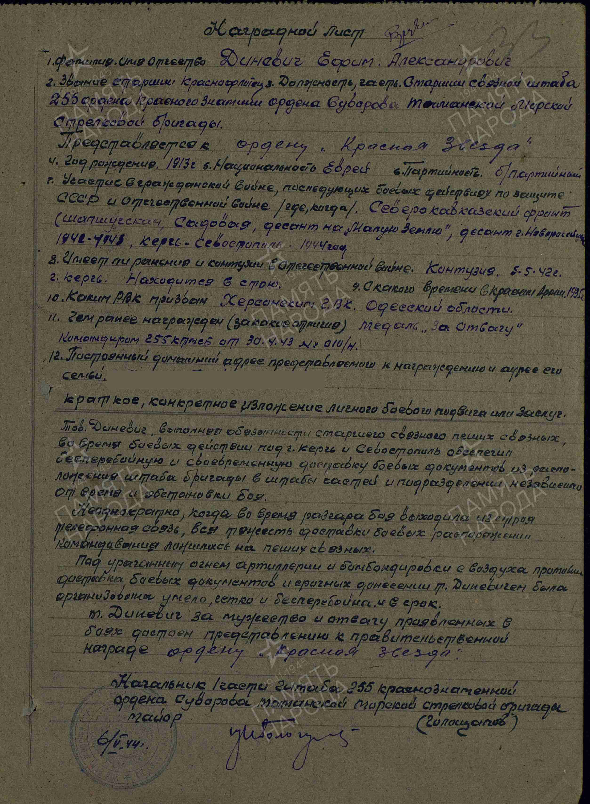 ЛИЧНАЯ СТРАНИЦА на старшего краснофлотца ДИНЕВИЧА Е. А.: