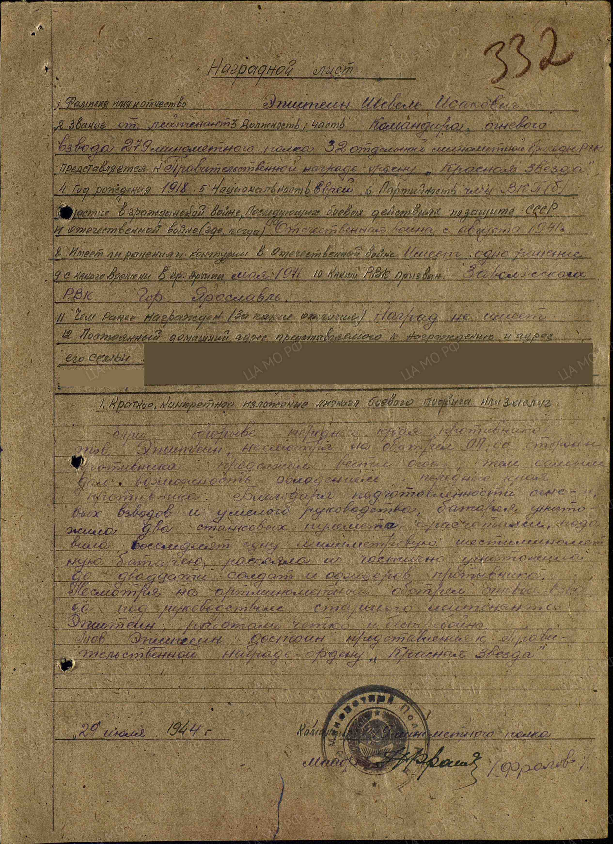Старший лейтенант ЭПШТЕЙН ШЕВЕЛЬ ИСААКОВИЧ, 1919 года рождения, место рождения - Белорусская ССР, Могилёвская область, Хотимский район, местечко Хотимск, еврей. В РККА призван Заволжским РВК, Заволжского района, г. Ярославля, Ярославской области, РСФСР, в 1939 году. В Великой Отечественной войне с 08.1941 года (на Волховском, Северо - Западном, 1 Белорусском фронтах), в должности: Командира огневого взвода 279 миномётного полка, 32 отдельной миномётной бригады РГК, 1 Белорусского фронта. Ранения: одно. Боевые награды: 1. Орден "КРАСНОЙ ЗВЕЗДЫ"; 2. Медали: "ЗА ВЗЯТИЕ БЕРЛИНА, "ЗА ПОБЕДУ НАД ГЕРМАНИЕЙ В ВЕЛИКОЙ ОТЕЧЕСТВЕННОЙ ВОЙНЕ 1941 - 1945 ГГ." с ЭЛЕКТРОННЫЙ ДОКУМЕНТОВ «ПОДВИГ НАРОДА В ВЕЛИКОЙ ОТЕЧЕСТВЕННОЙ 1941-1945 ГГ.» http://podvignaroda.ru/?#tab=navHome Вернулся с Великой Отечественной войны. Послевоенная судьба: неизвестна. Вечная Память и Слава!
