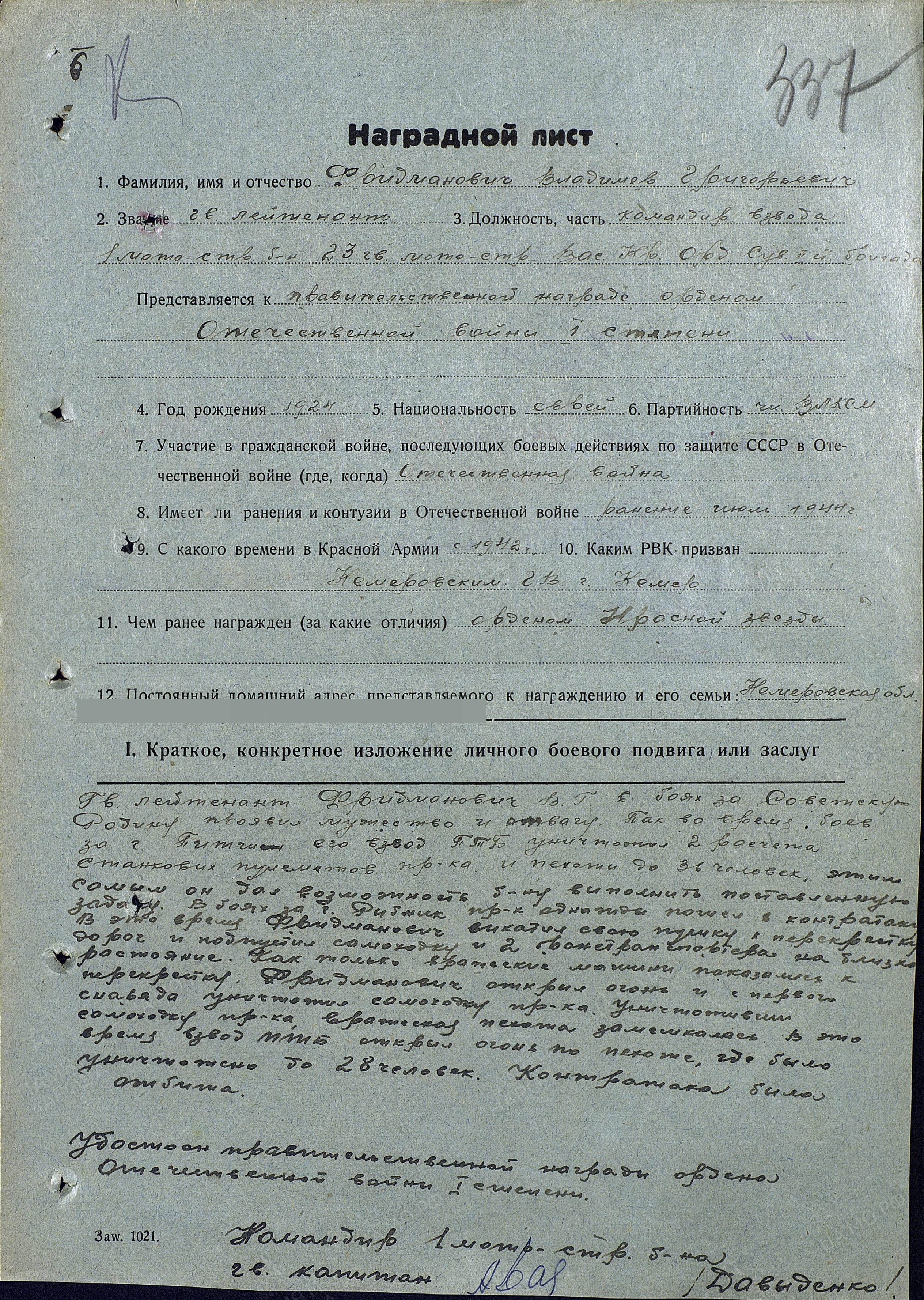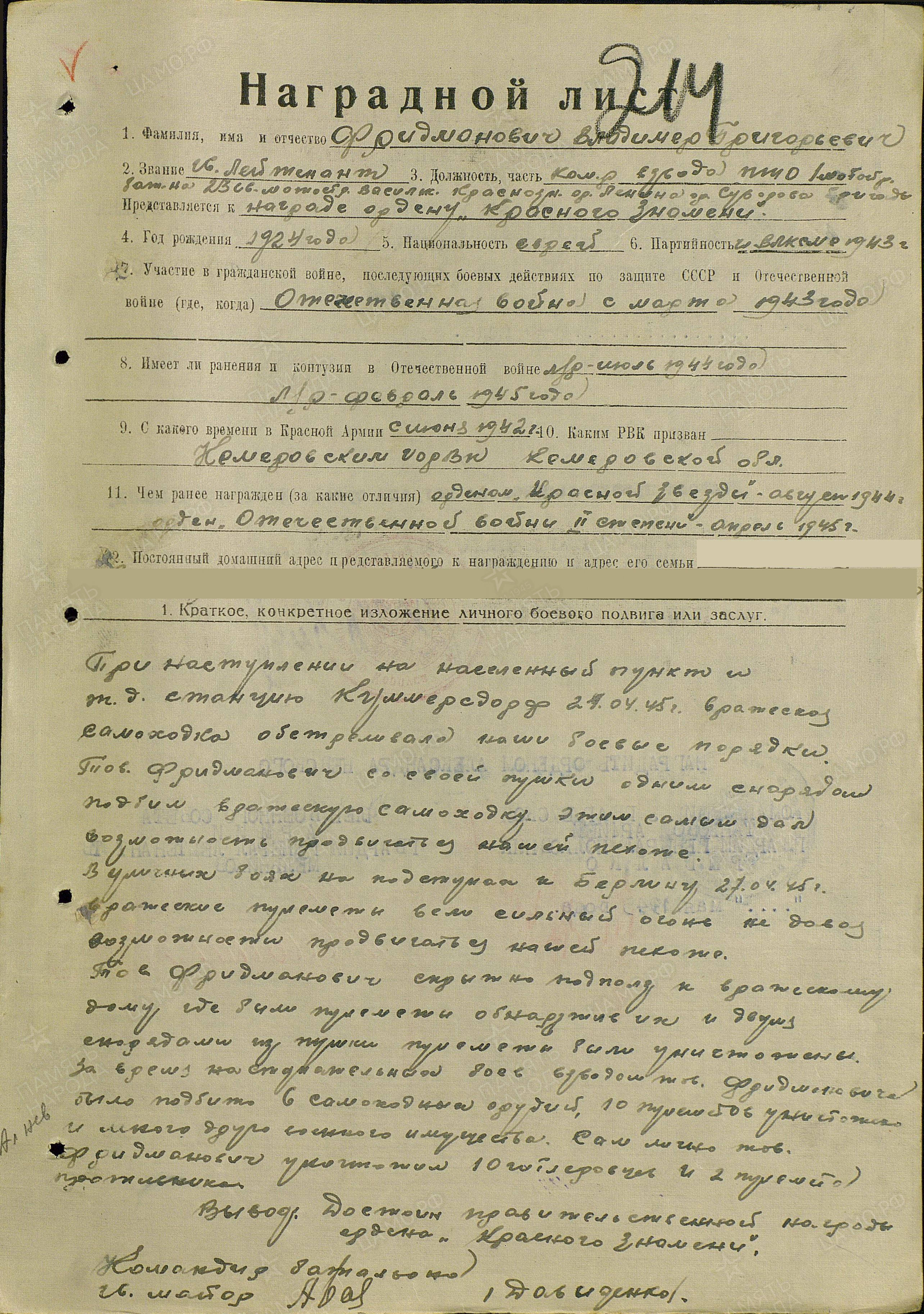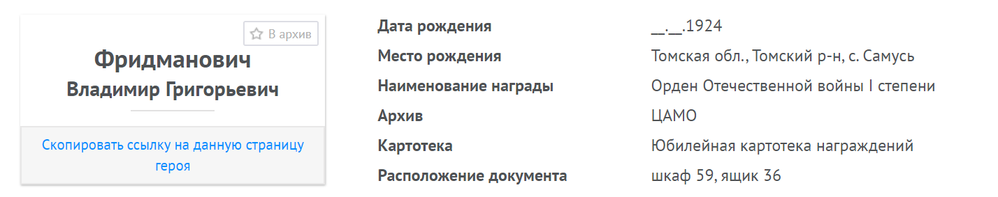 Гвардии полковник ФРИДМАНОВИЧ ВЛАДИМИР ГРИГОРЬЕВИЧ, 1924 года рождения, место рождения - РСФСР, Томская область, Томский район, село Самусь, еврей. В РККА призван Кемеровским ГВК, г. Кемерово, Кемеровской области РСФСР, 06.1942 года. В Великой Отечественной войне с 03.1943 года (на Воронежском, 1 Украинском фронтах) в должности: Командира огневого взвода батареи противотанковых орудий 1 мотострелкового батальона 23 гвардейской мотострелковой Васильковской ордена Ленина дважды Краснознамённой ордена Суворова бригады, 7 гвардейского танкового корпуса, 3 гвардейской танковой армии, 1 Украинского фронта. Ранения: 1. Лёгкое (07.1944 года). Боевые награды: 1. Ордена: "АЛЕКСАНДРА НЕВСКОГО", "ОТЕЧЕСТВЕННОЙ ВОЙНЫ" 1 СТЕПЕНИ (2), "КРАСНОЙ ЗВЕЗДЫ"; 2. Медали: "ЗА БОЕВЫЕ ЗАСЛУГИ", "ЗА ВЗЯТИЕ БЕРЛИНА", "ЗА ПОБЕДУ НАД ГЕРМАНИЕЙ В ВЕЛИКОЙ ОТЕЧЕСТВЕННОЙ ВОЙНЕ 1941 - 1945 ГГ." http://podvignaroda.ru/?#tab=navHome. Вернулся с Великой Отечественной войны. Послевоенная судьба: неизвестна. Умер 6.12.2019 года. Вечная Слава и Память!