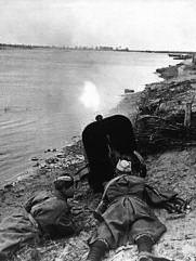 Авторские описание фото: " Идет форсирование Днепра. Расчет станкового пулемета ДШК поддерживает переправляющихся огнем. Ноябрь 1943 г. ".