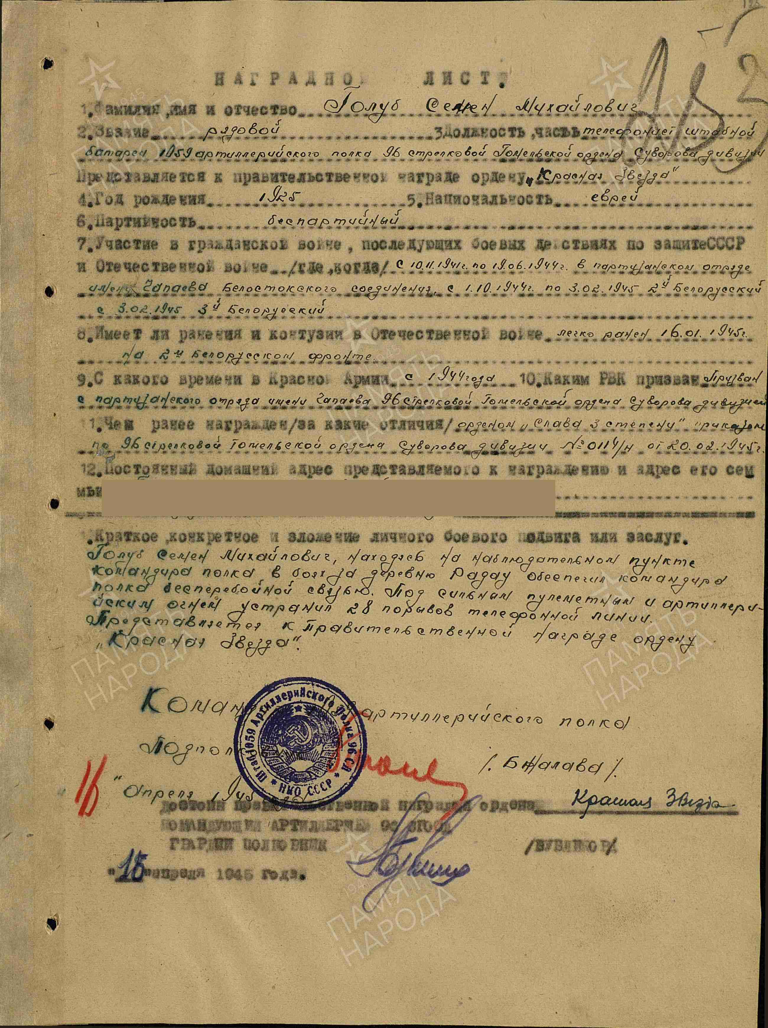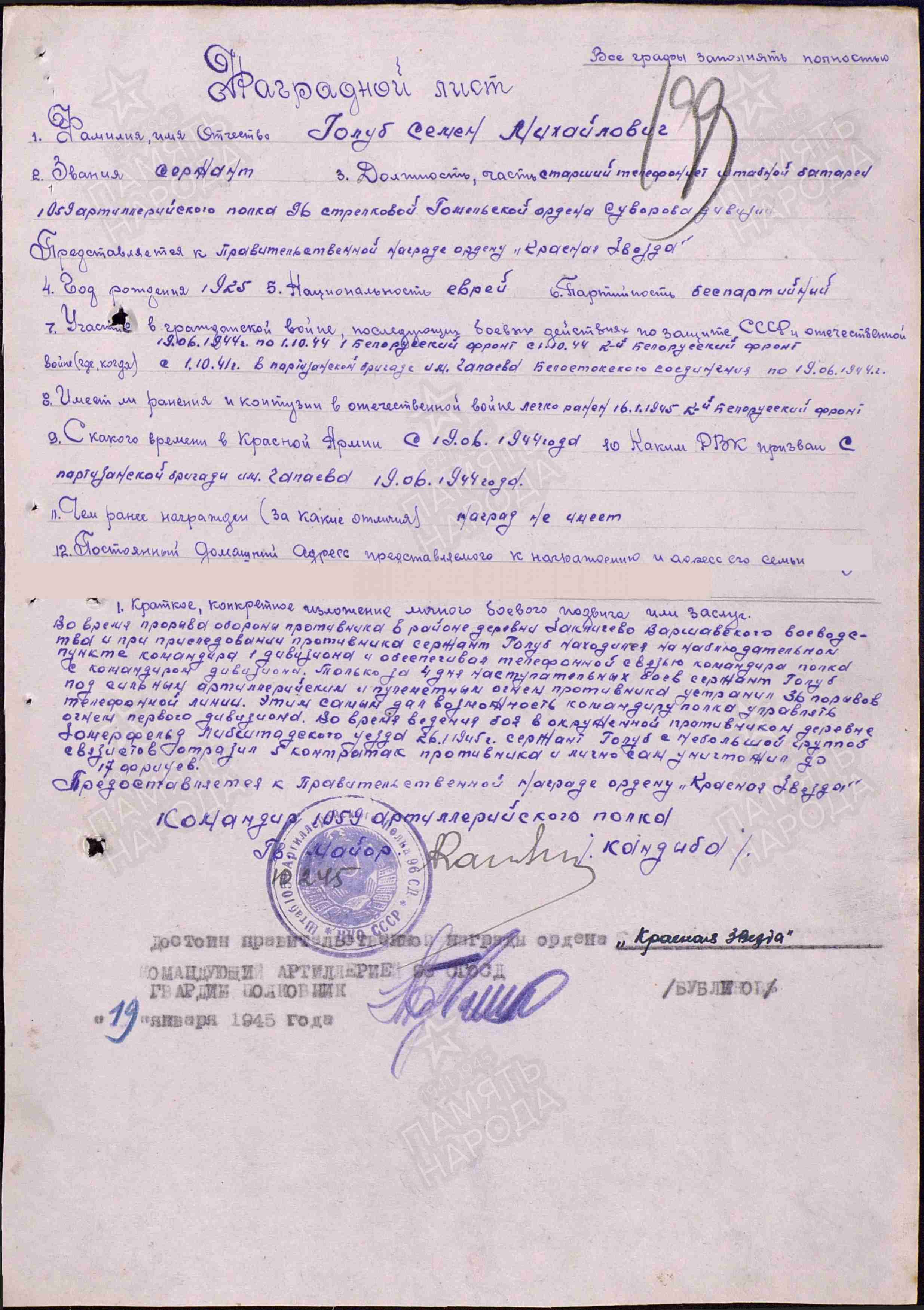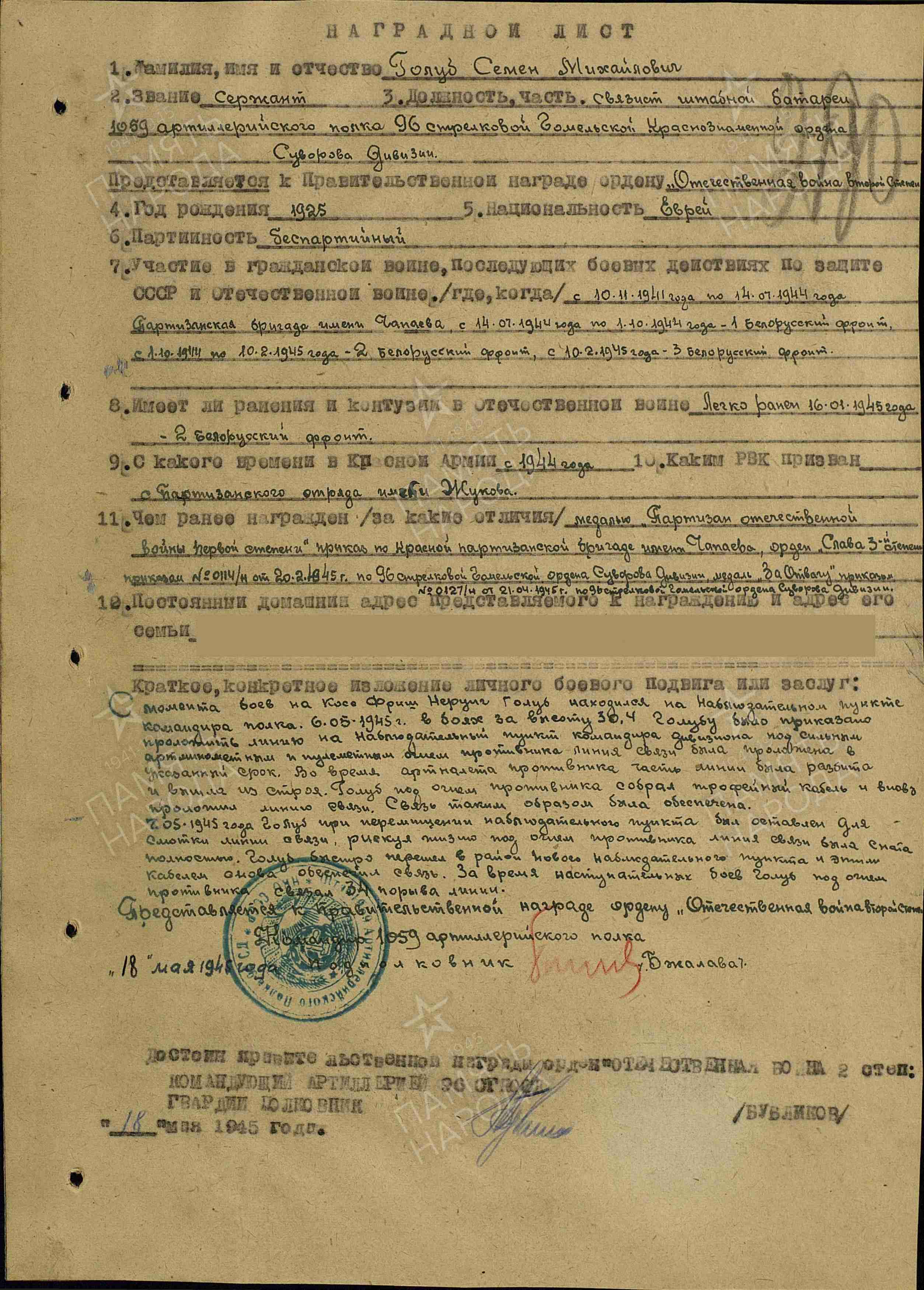 Голуб Семен Михайлович. Орден Отечественной войны I степени