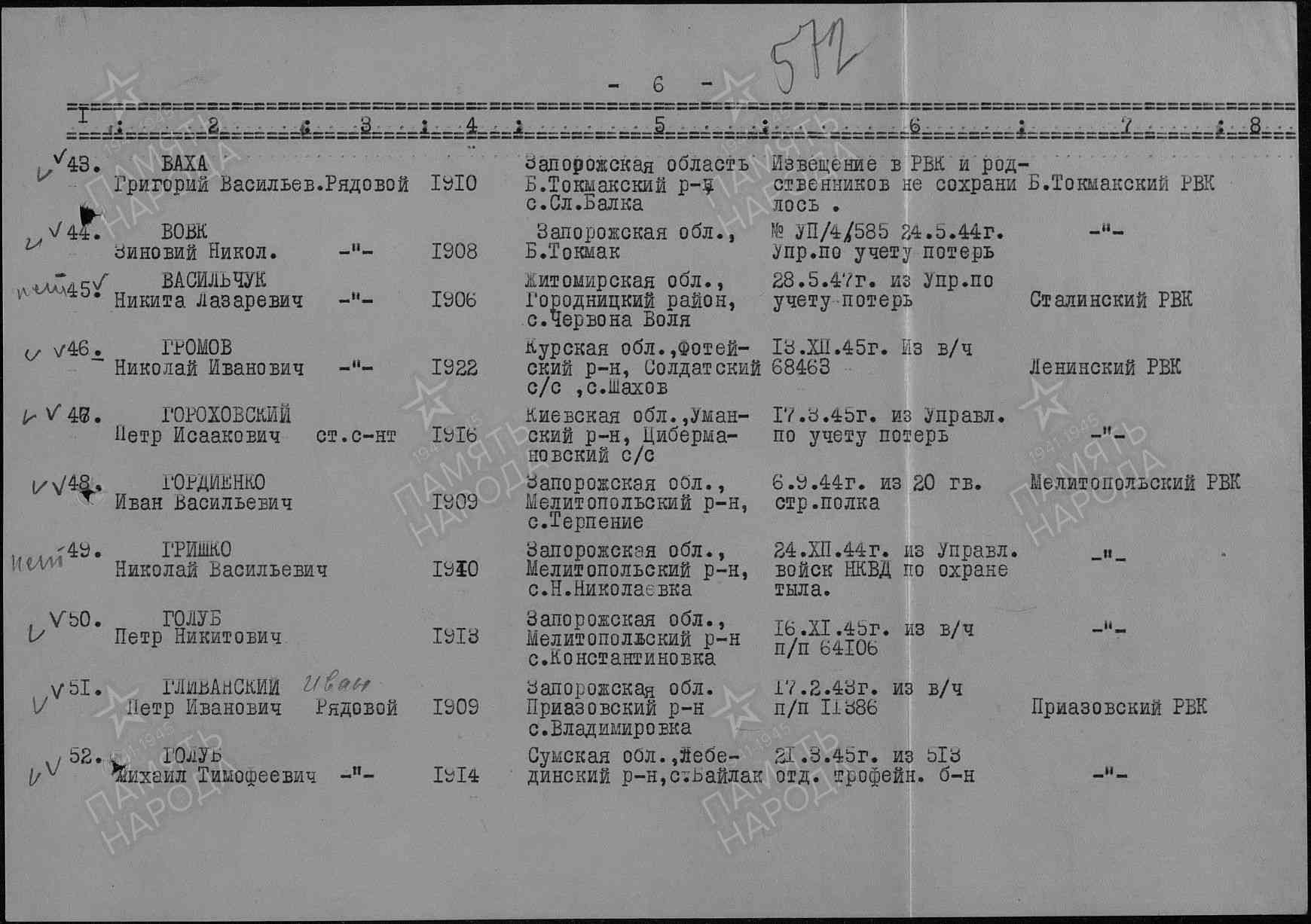 Наименование военкомата: Круглянский РВК Могилевская область Белорусская ССР