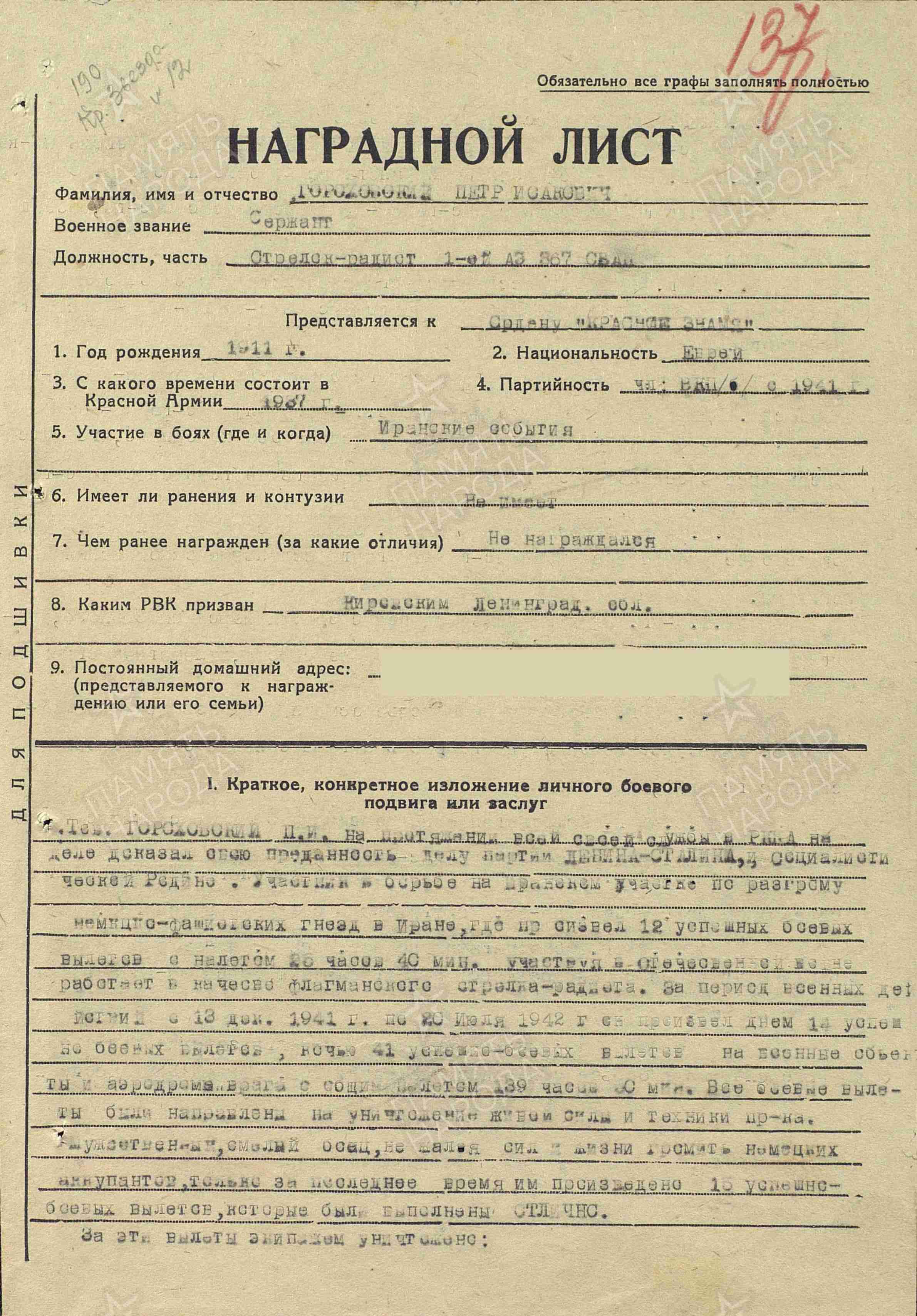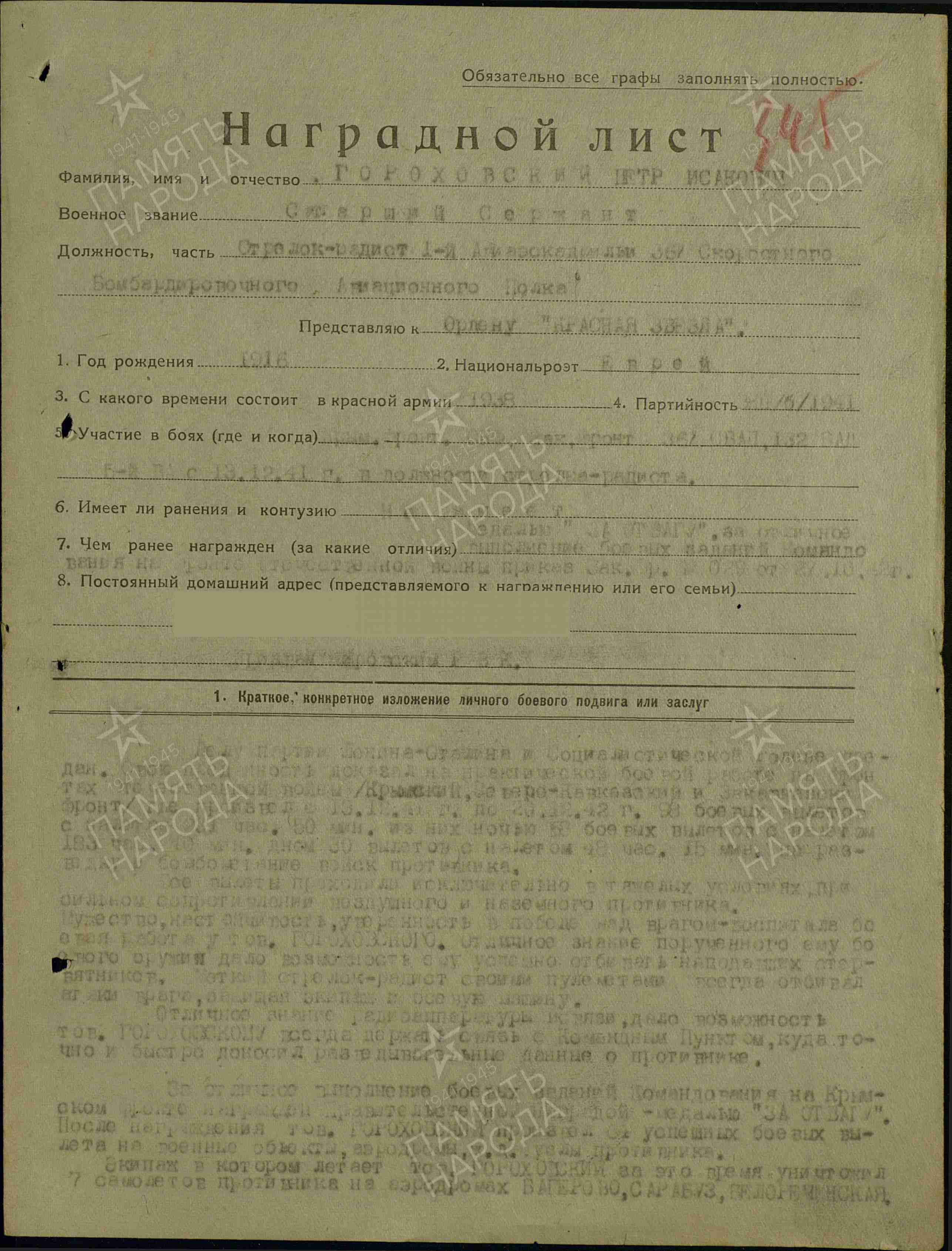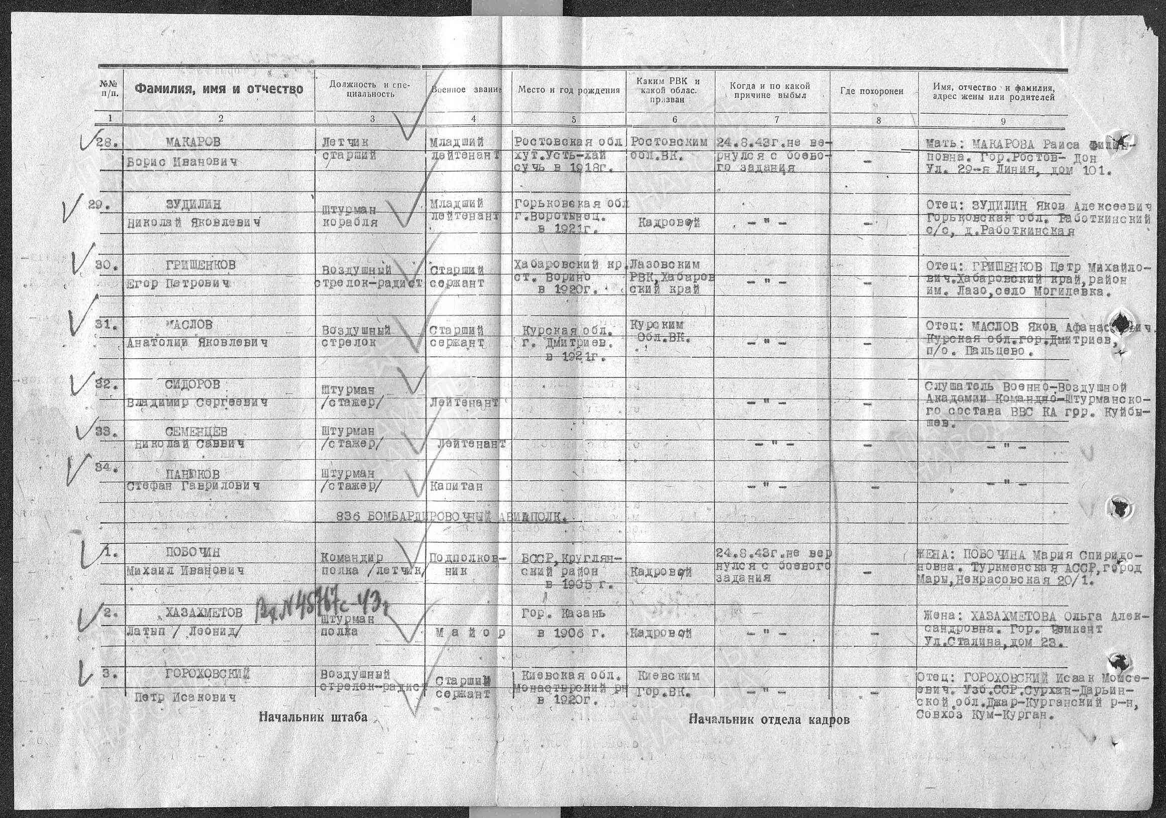 Примечание: Старший сержант ГОРОХОВСКИЙ ПЁТР ИСААКОВИЧ, 24.08.1943 года, не вернулся, с экипажем, с боевого задания. Экипаж пропал без вести. Остался жив. Находился в плену. Освобождён. Вернулся с Великой Отечественной войны. Послевоенная судьба: неизвестна.