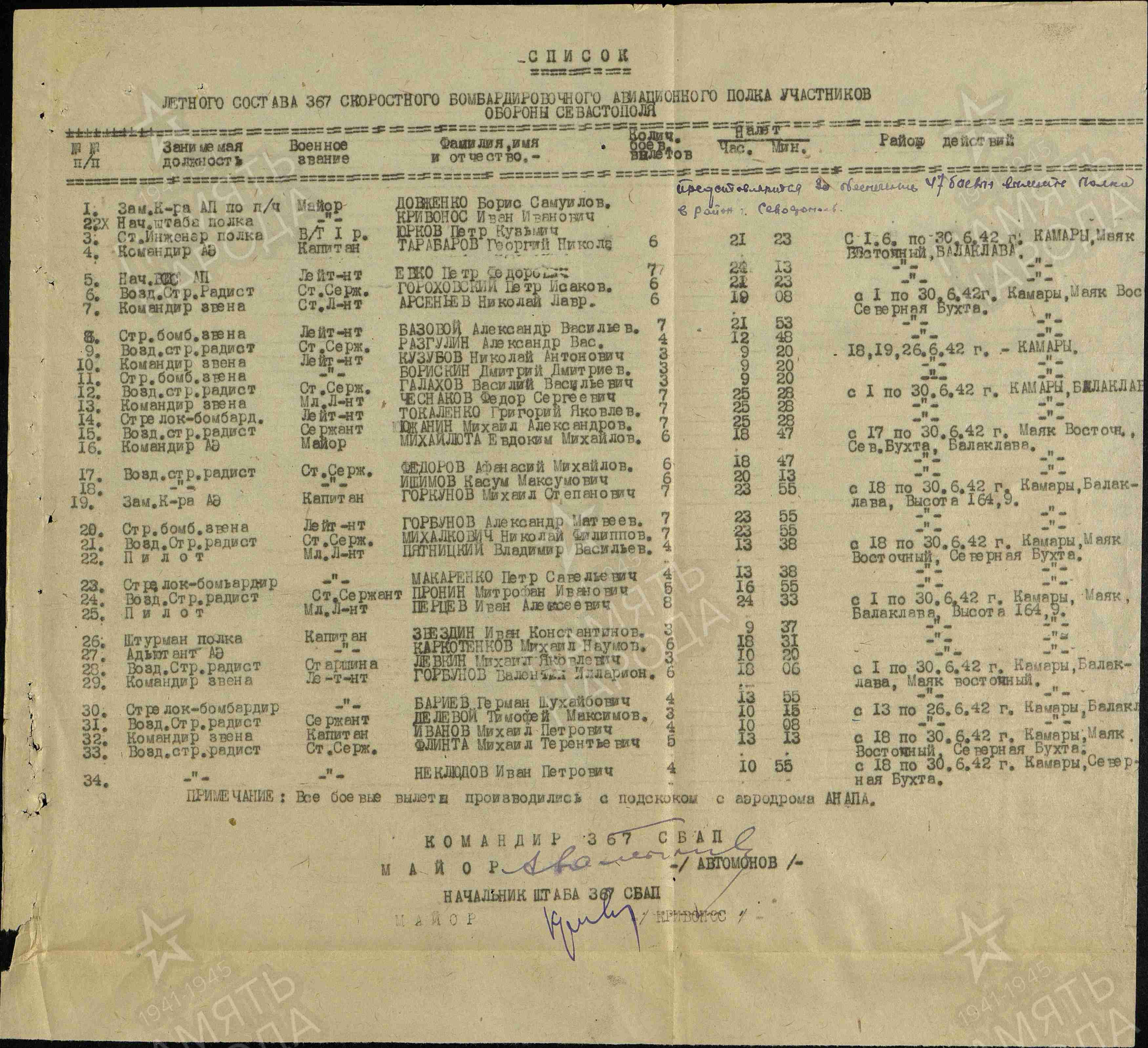 1. Командир - командир полка подполковник ПОБОЧИН МИХАИЛ ИВАНОВИЧ, 1905 г.р.