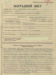 Предствлялся к наградам: ордену "КРАСНОГО ЗНАМЕНИ" - награждён медалью "ЗА ОТВАГУ (09.1943).