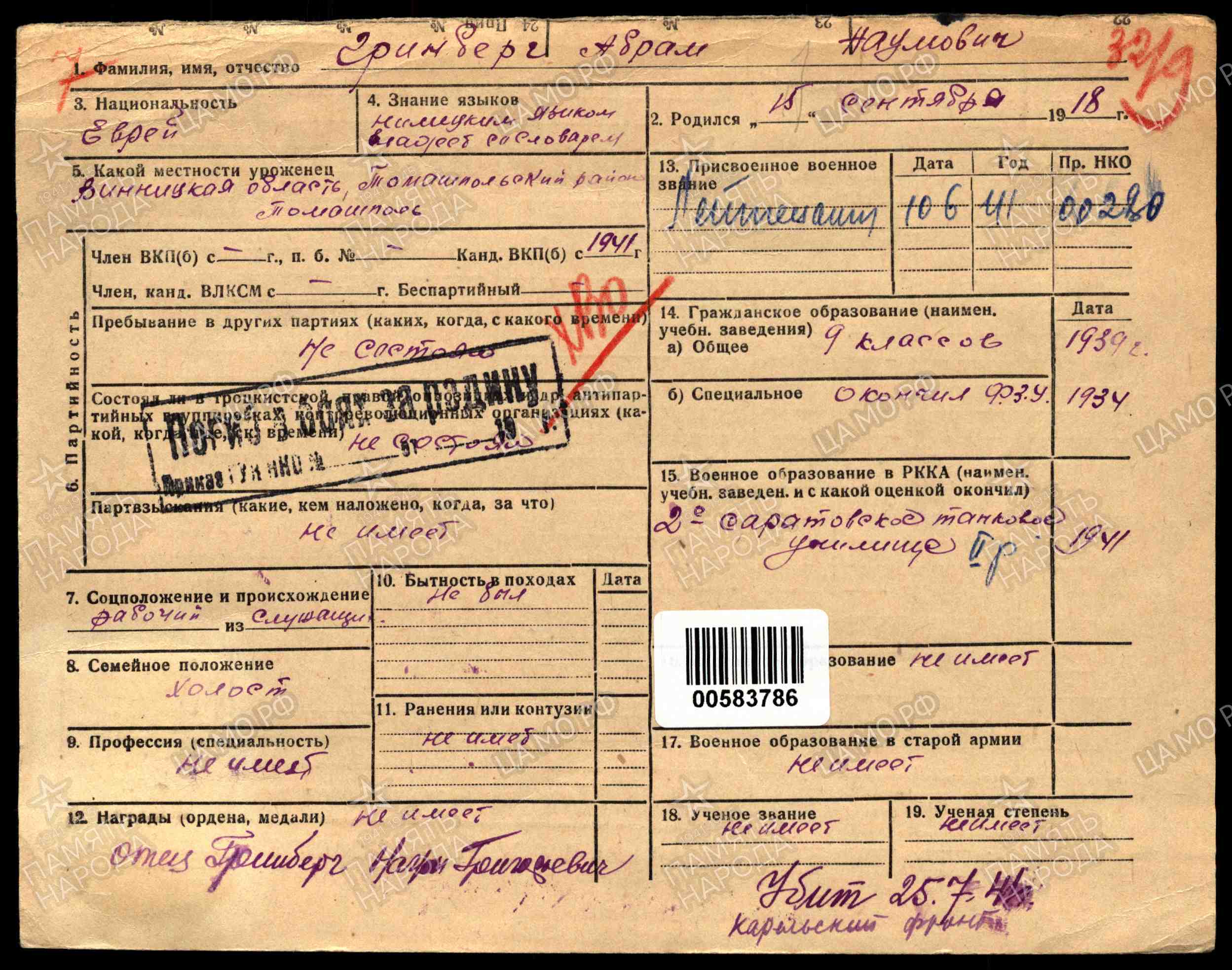 Гринберг Абрам Наумович родился 15.8.1918 в м.Томашполь Винницкой области Укр.ССР. Еврей.