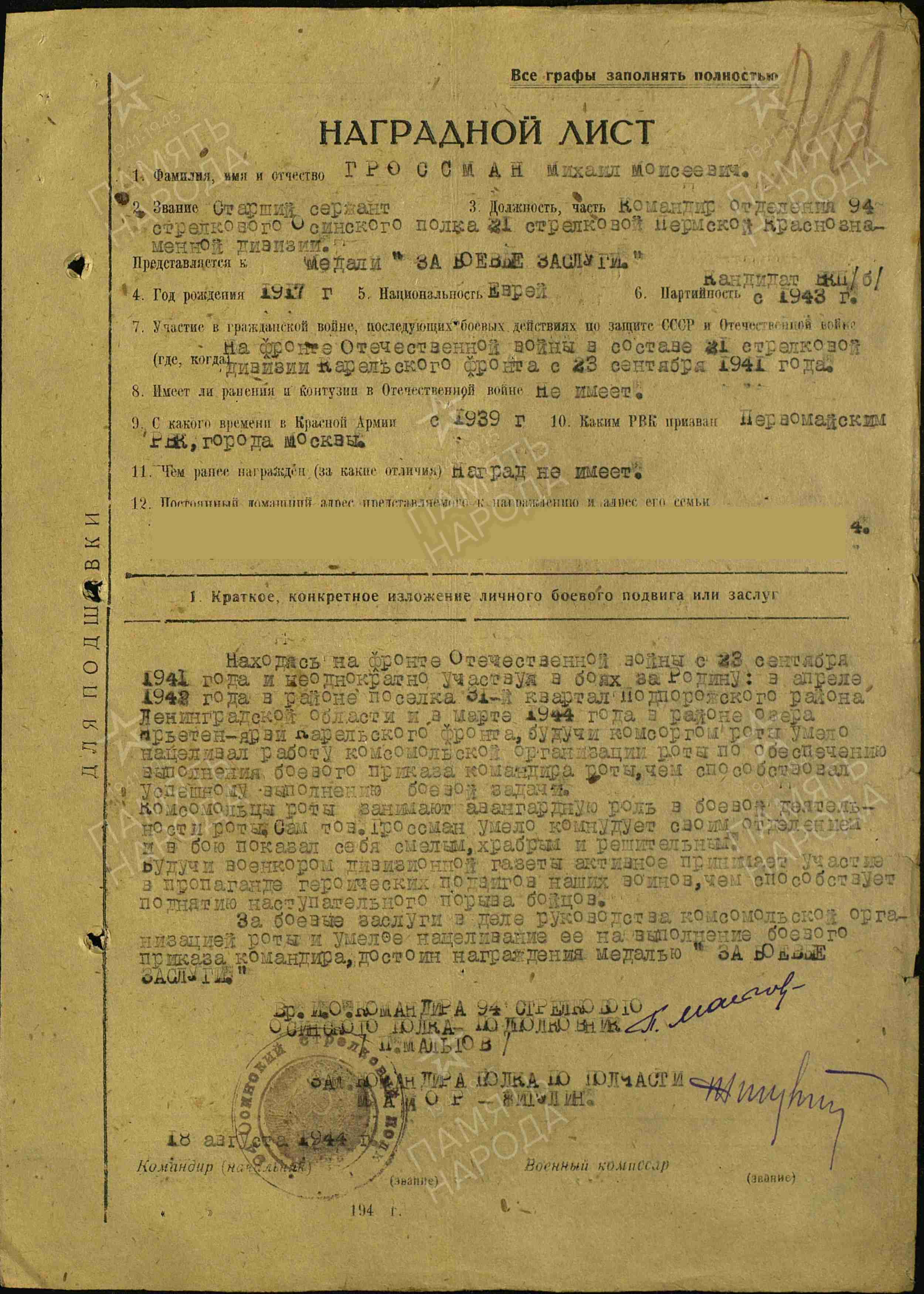 ЛИЧНАЯ СТРАНИЦА старшего сержанта ГРОССМАНА М. М.: