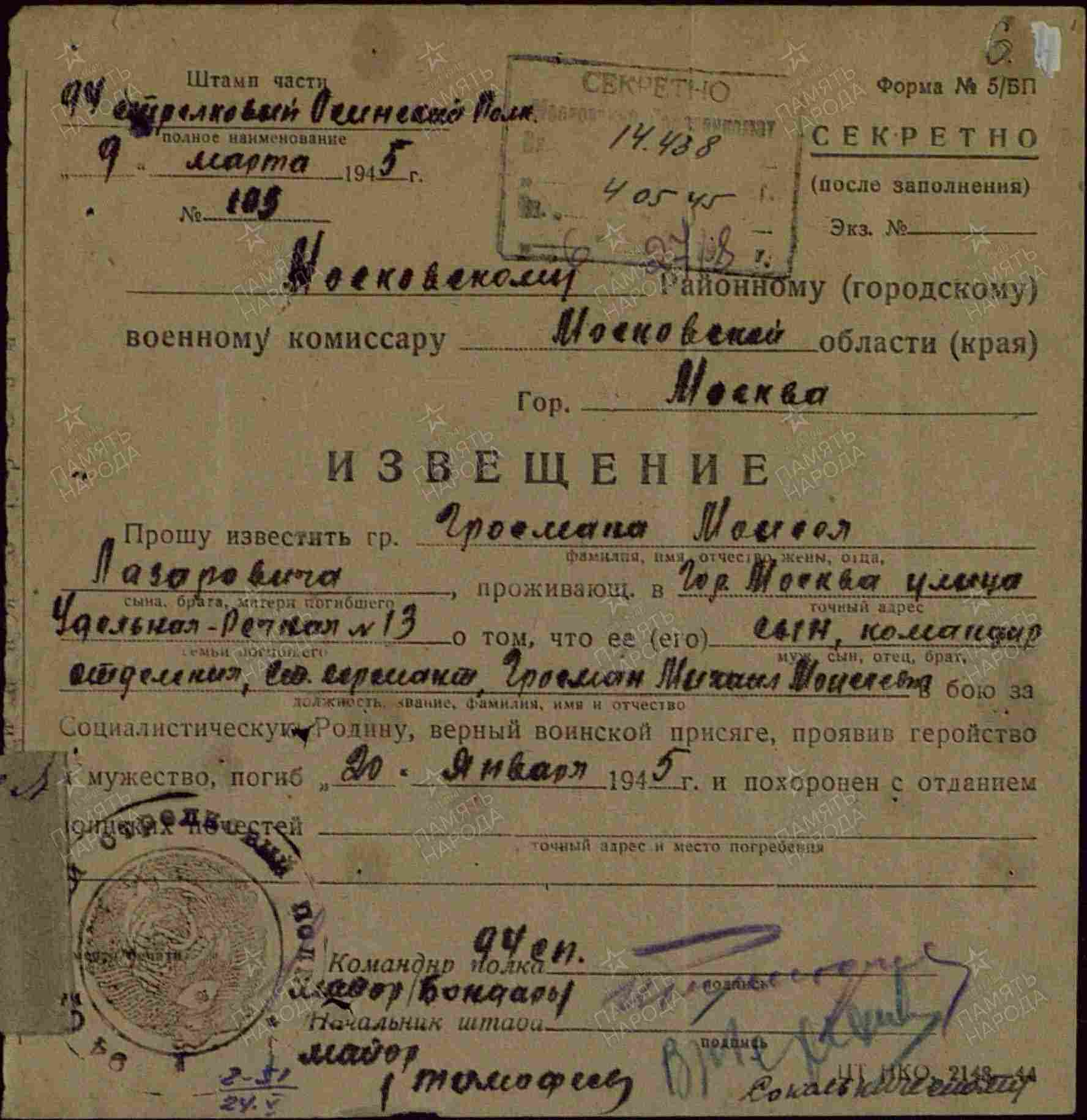 Примечание: Старший сержант ГРОССМАН МИХАИЛ МОИСЕЕВИЧ погиб, в бою, 20.01.1945 года. Захоронен: Венгрия, н/п Генрих, южная окраина, роща, могила № 1, 3-й слева (первично); Венгрия, медье Фейер, населённый пункт Генрих, захоронение (в настоящее время) 55 солдат и офицеров полка утеряно, имеется предположительное место.