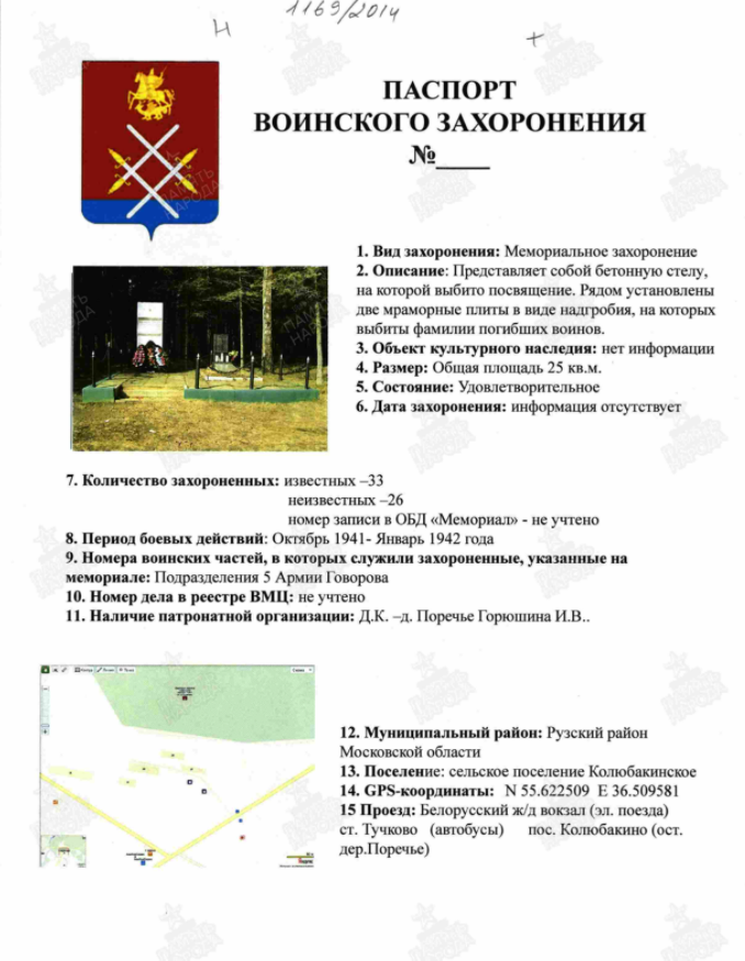 Первичное место захоронения: Московская обл., Рузский р-н, д. Поречье, западнее, 1 км