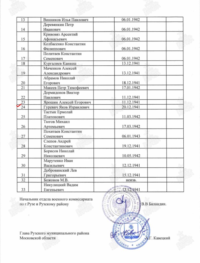 Примечание: Младший лейтенант ГУРЕВИЧ Я. И. погиб, в бою, 20.12. 1941 года. Захоронен (в настоящее время): РОССИЯ, Московская область, Рузский район, сельское поселение Колюбакинское, деревня Поречье, братское воинское захоронение.