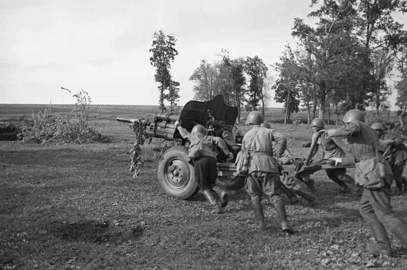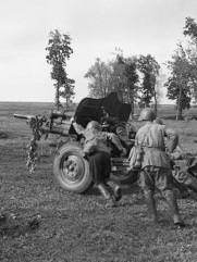 - авторское описание фотографии: " Советские артиллеристы выкатывают на боевую позицию 76-мм дивизионную пушку образца 1939 года (УСВ).".