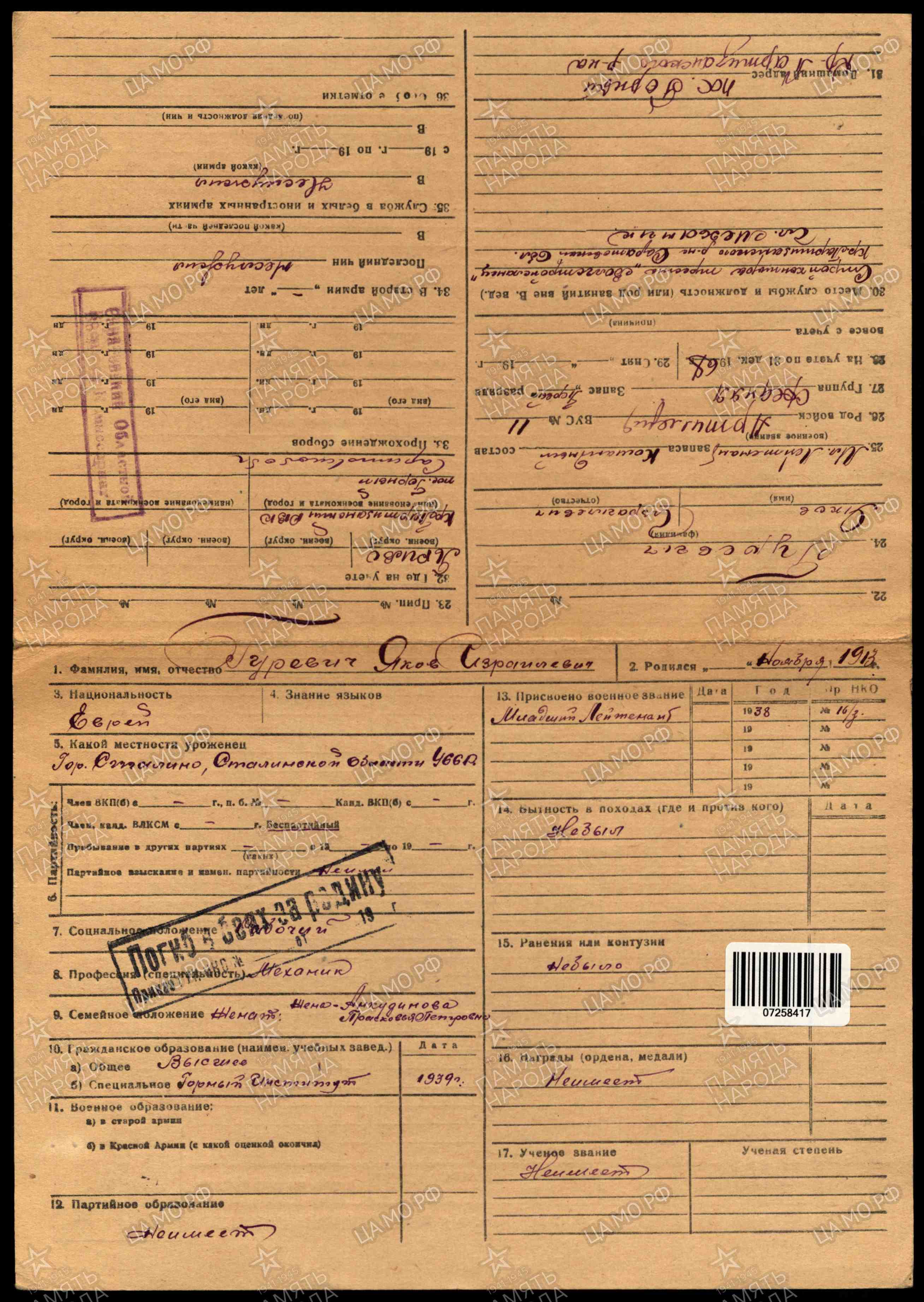 Данные из УПК (учётно - послужной карты, портал "ПАМЯТЬ НАРОДА").