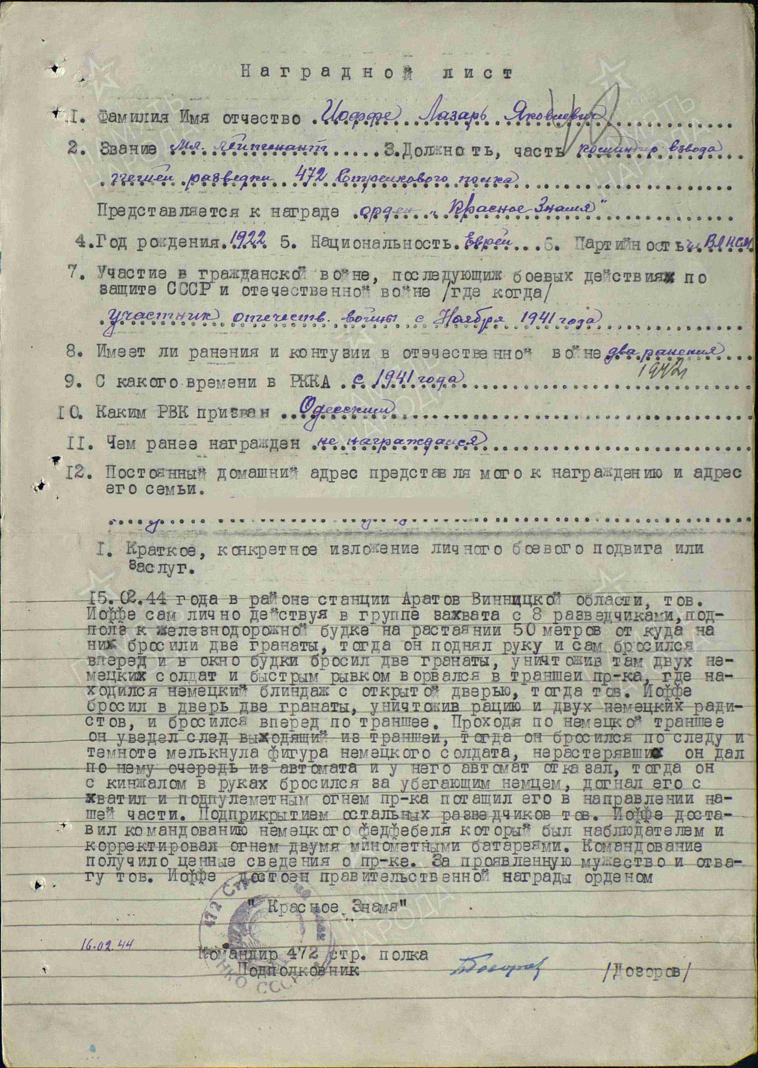 тов. Иоффе действуя с группой разведчиков, в ночь на 24.02.44 года, в