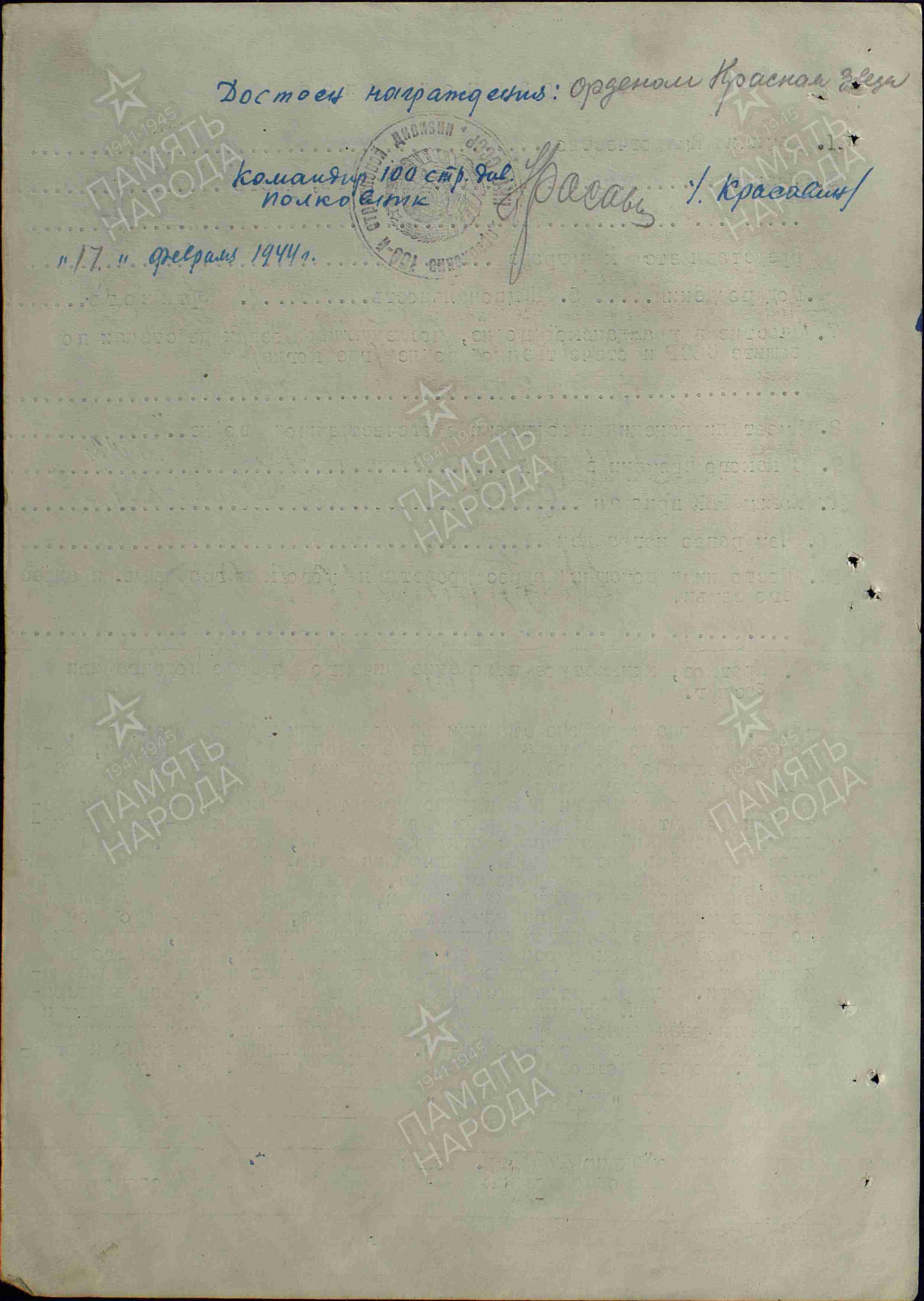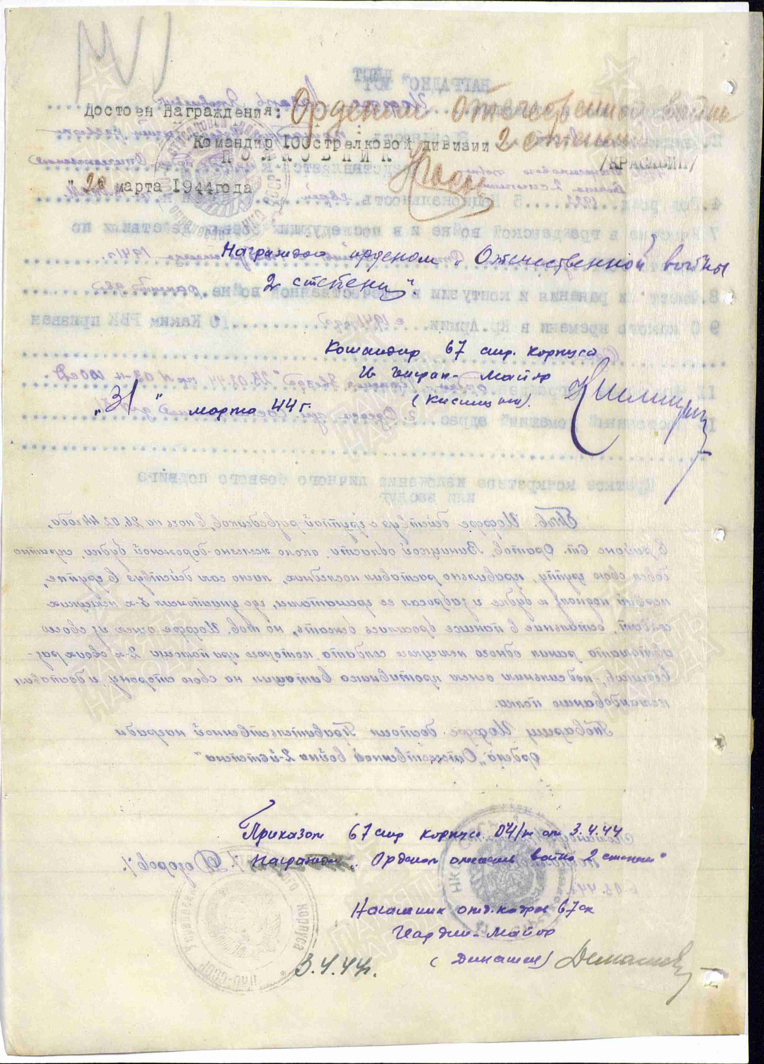 Приказом 67 стр. корпуса от 3.4.44 награжден орденом Отечественной войны