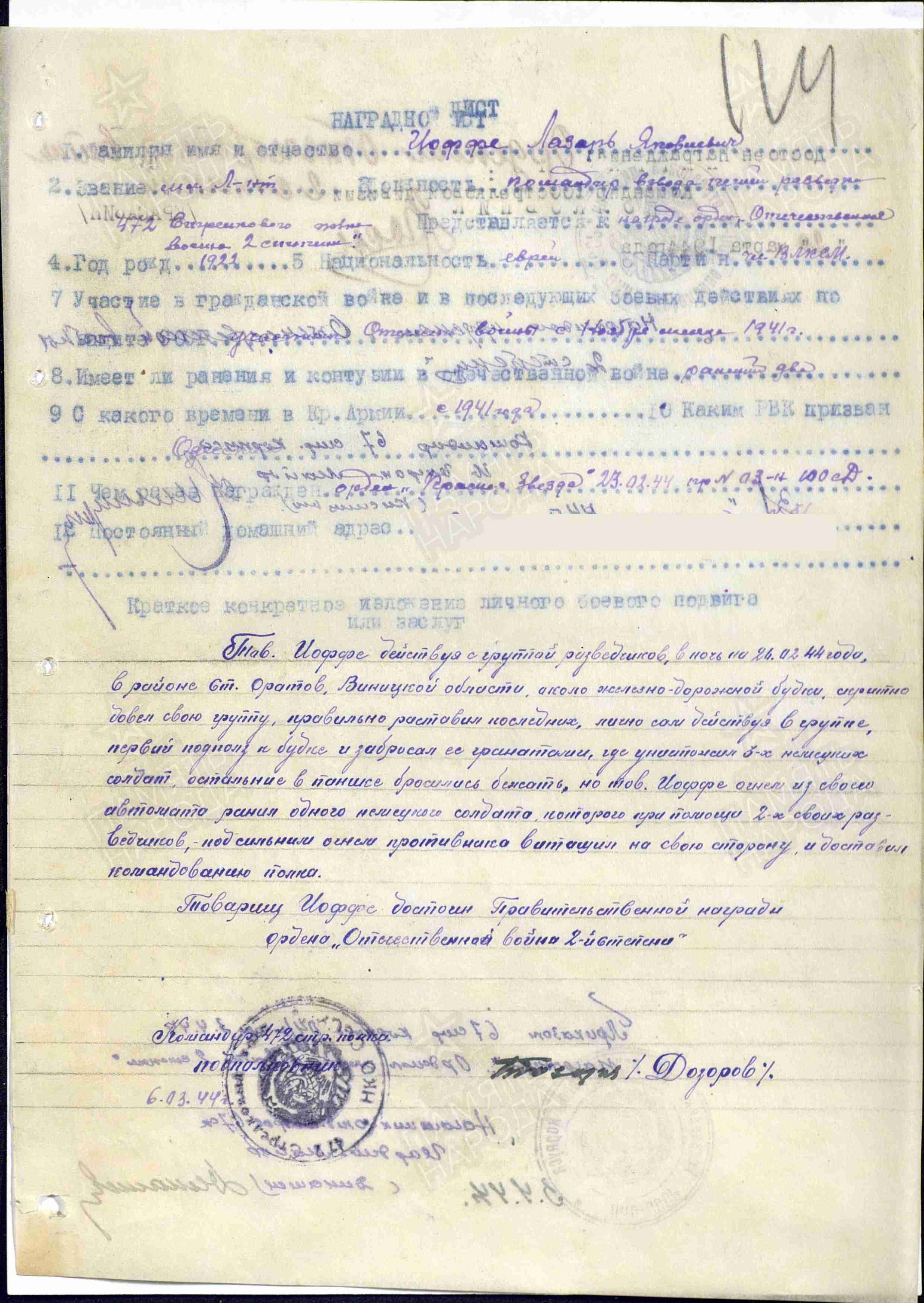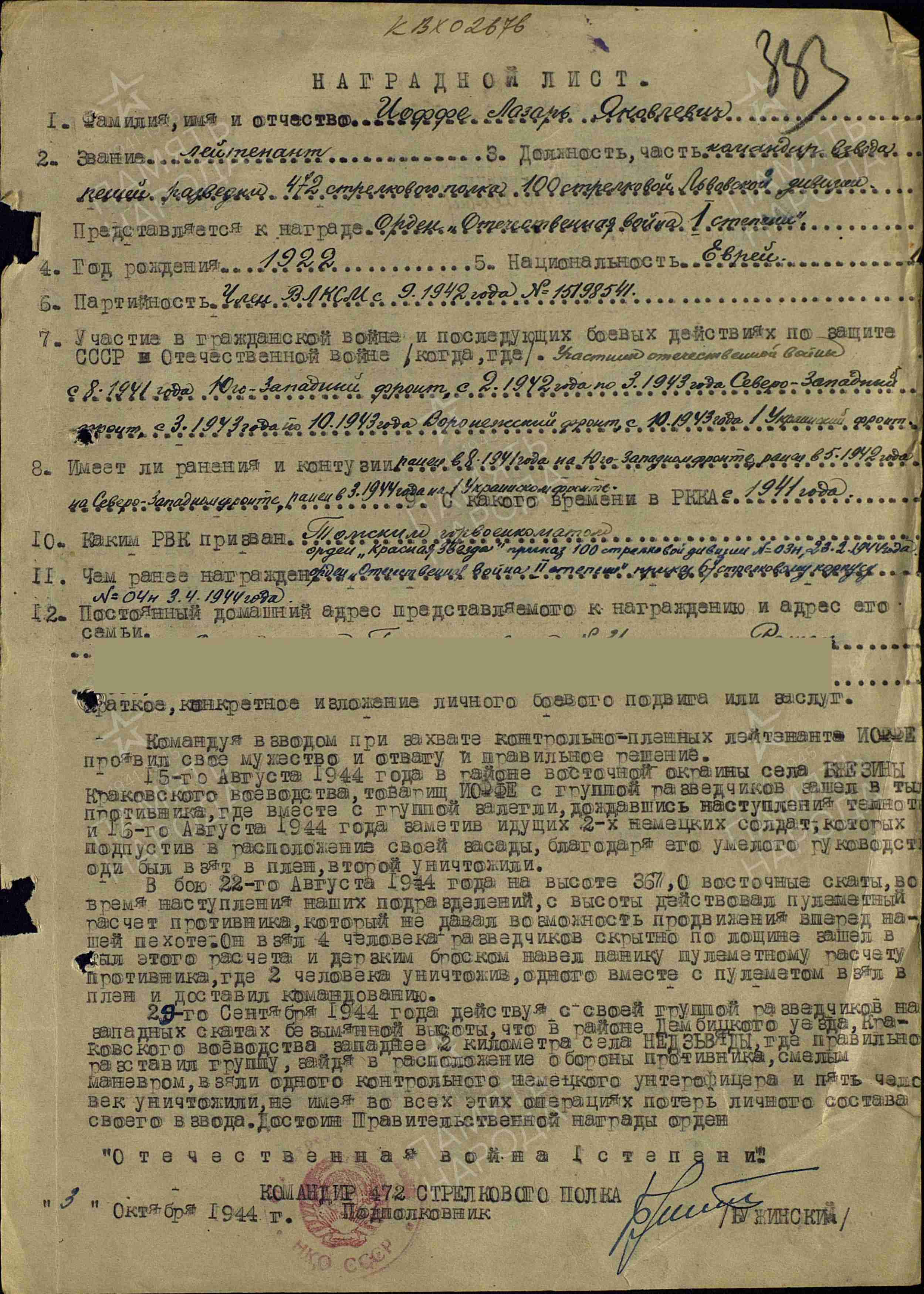 Из наградного листа на лейтенанта Иоффе Лазаря Яковлевича.