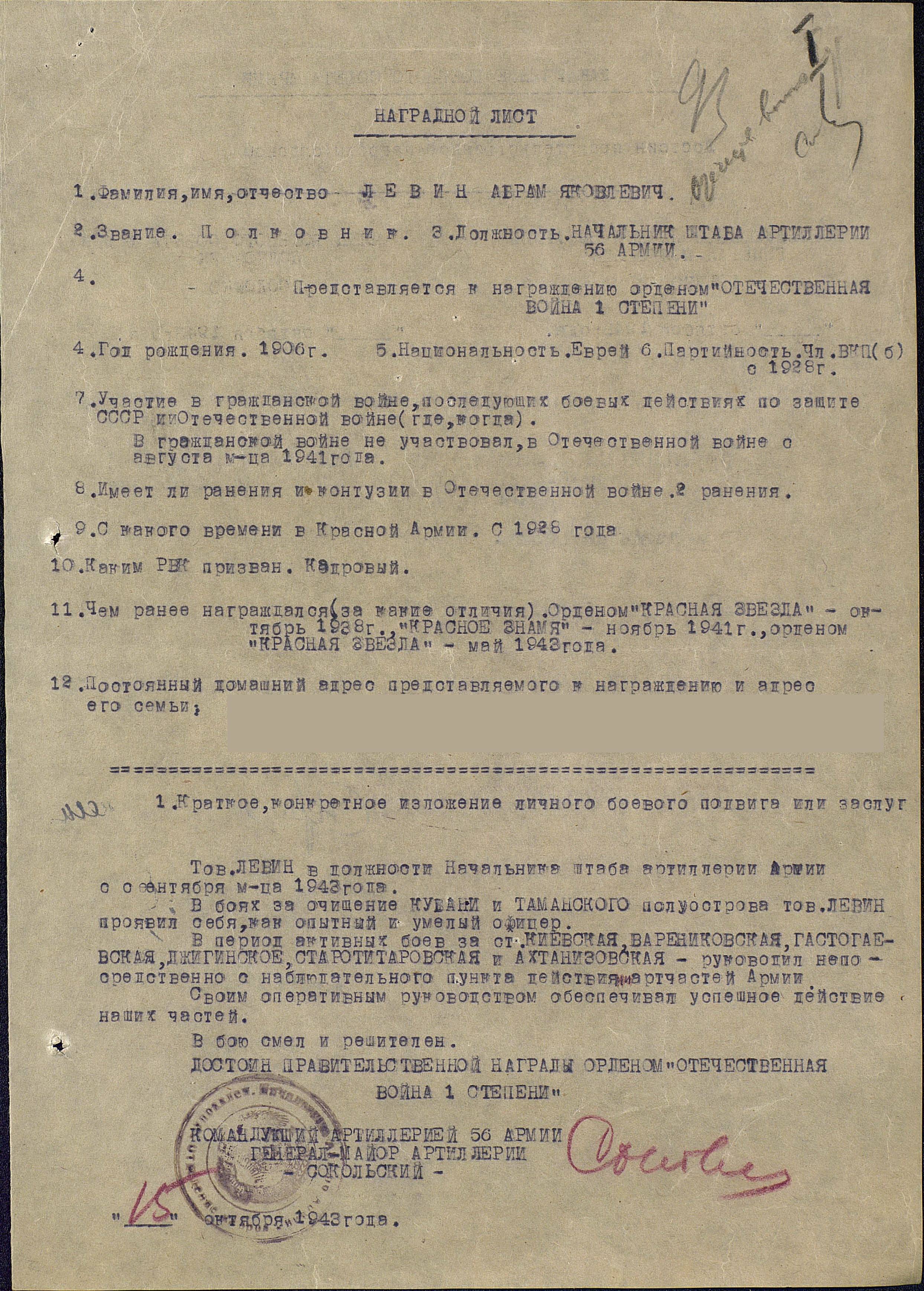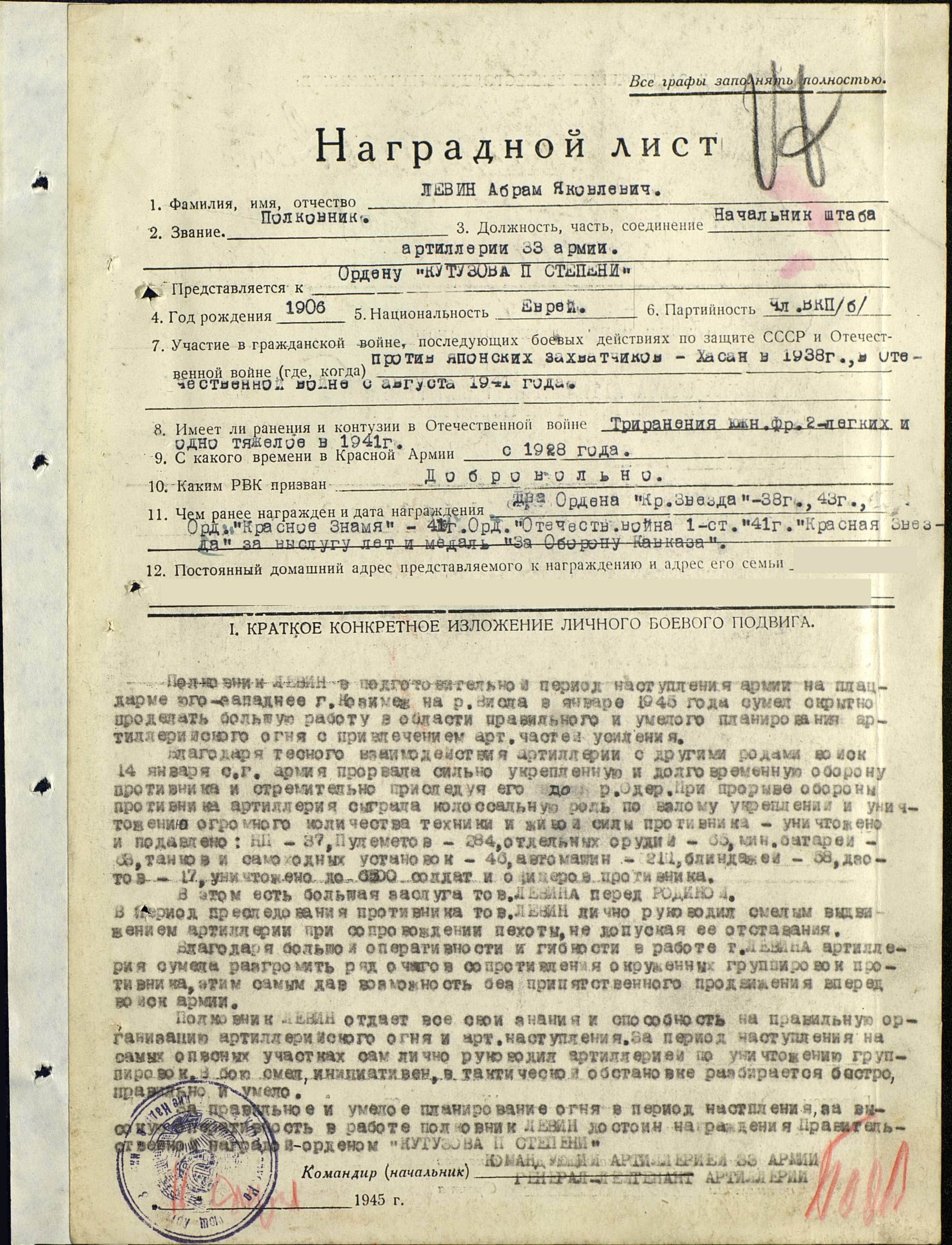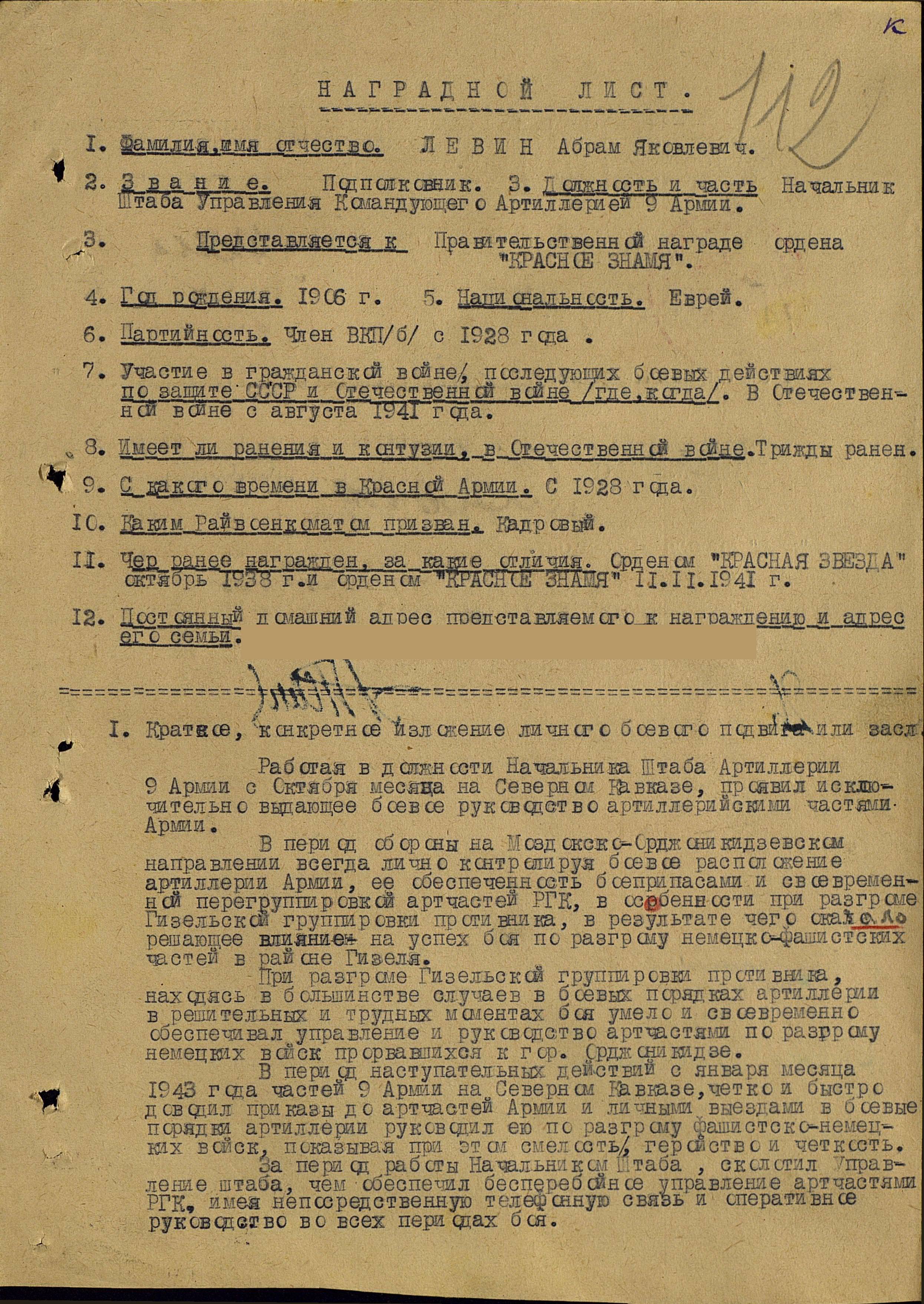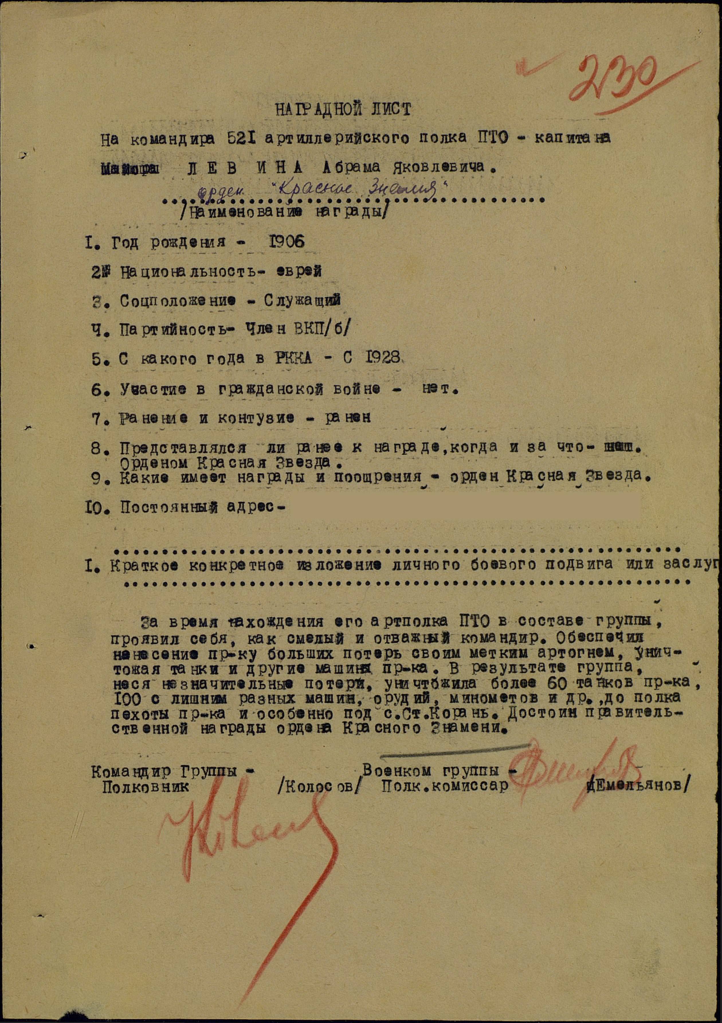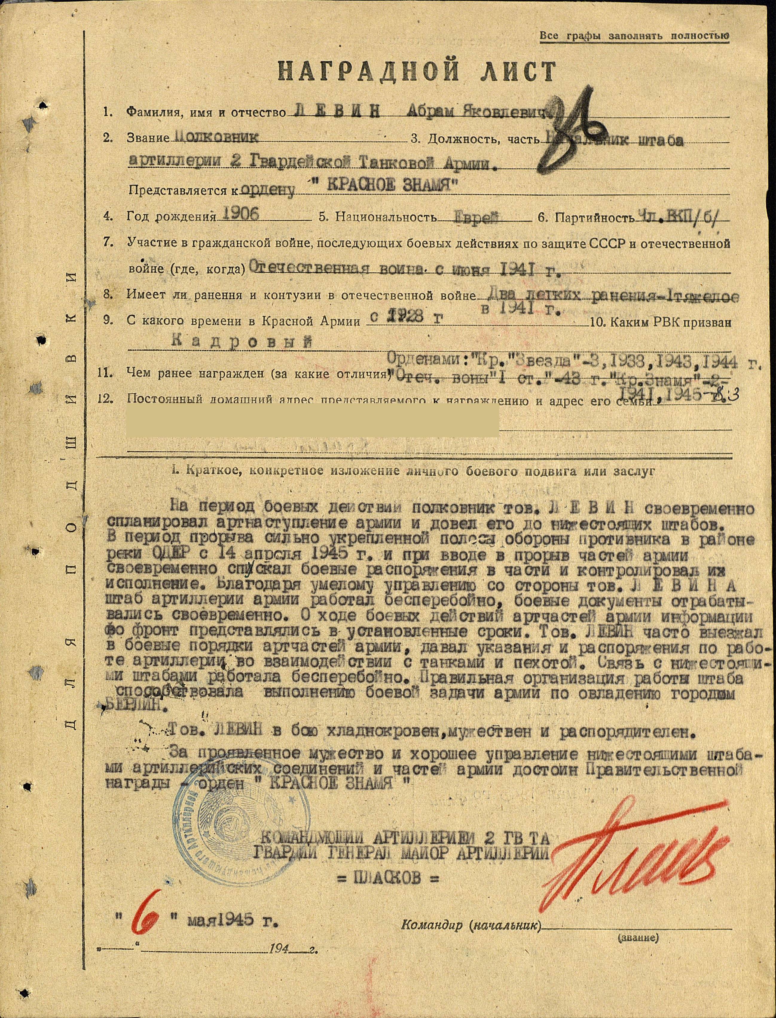 ЛИЧНАЯ СТРАНИЦА  на гвардии полковника ЛЕВИНА А. Я.: