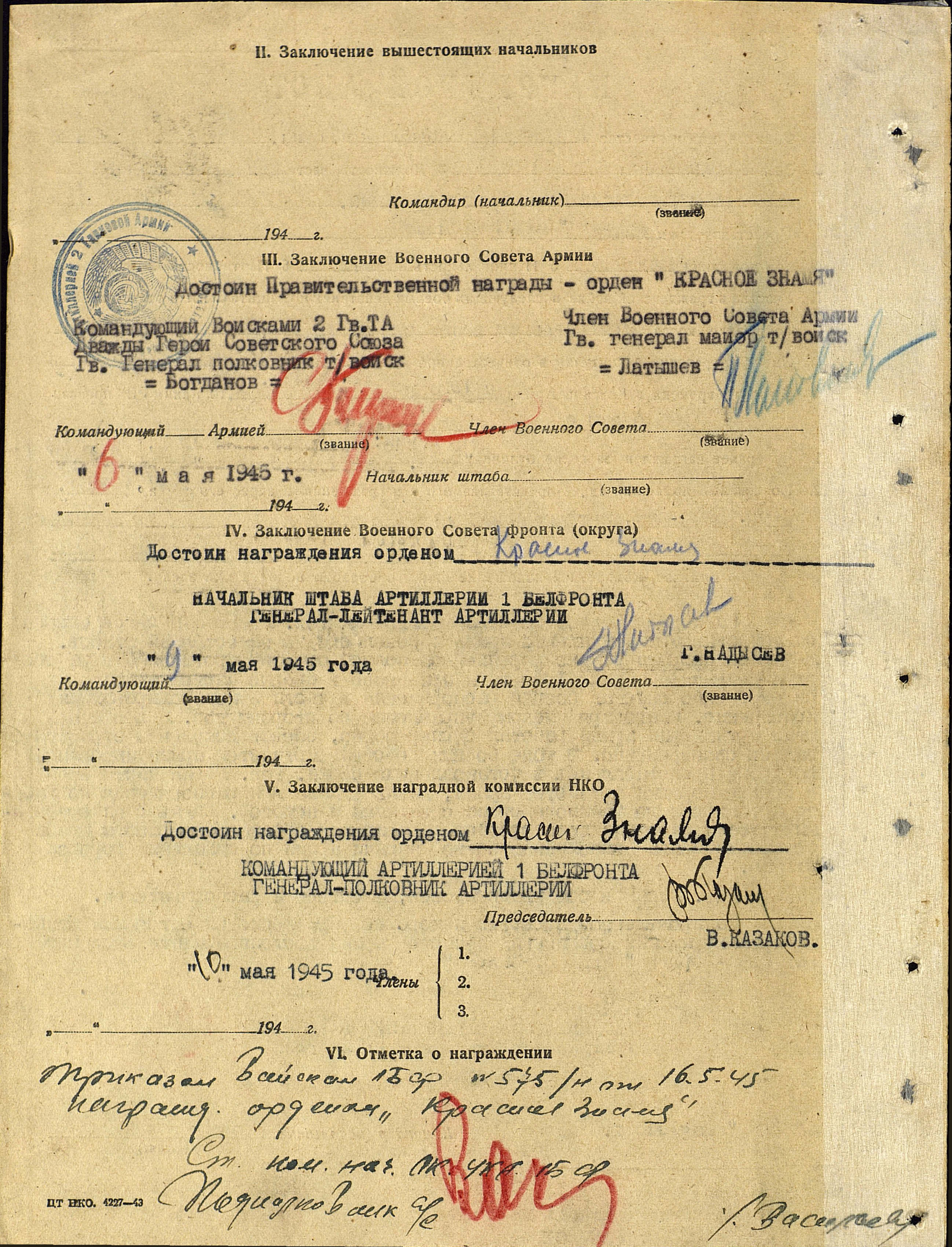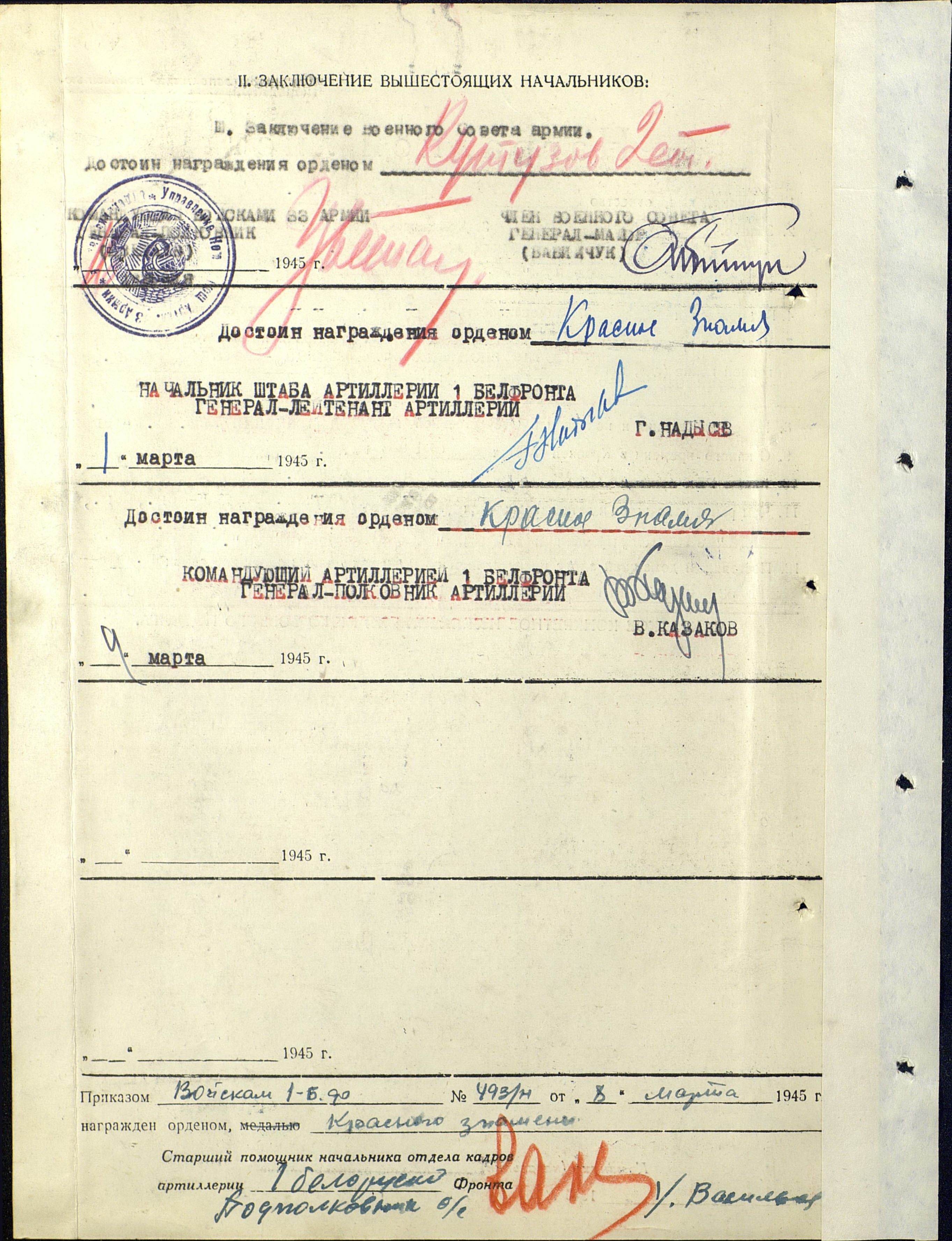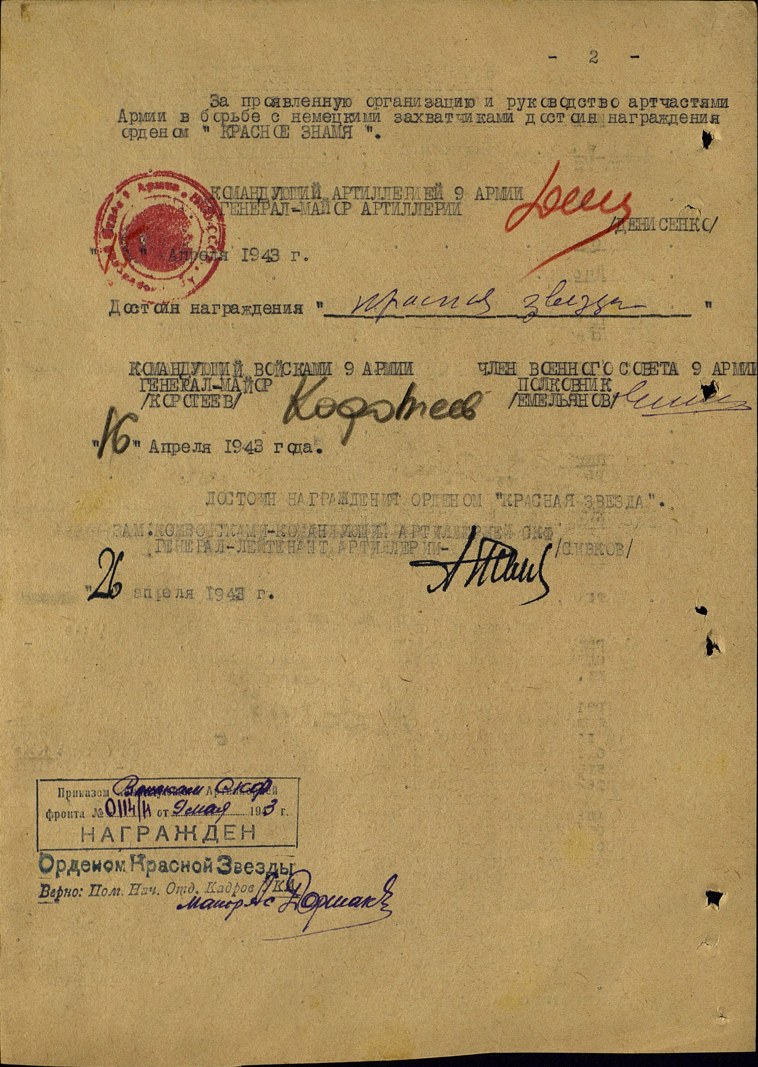 Начальник штаба Управления командующего артиллерии 9 армии, Северо - Кавказского фронта (1943).