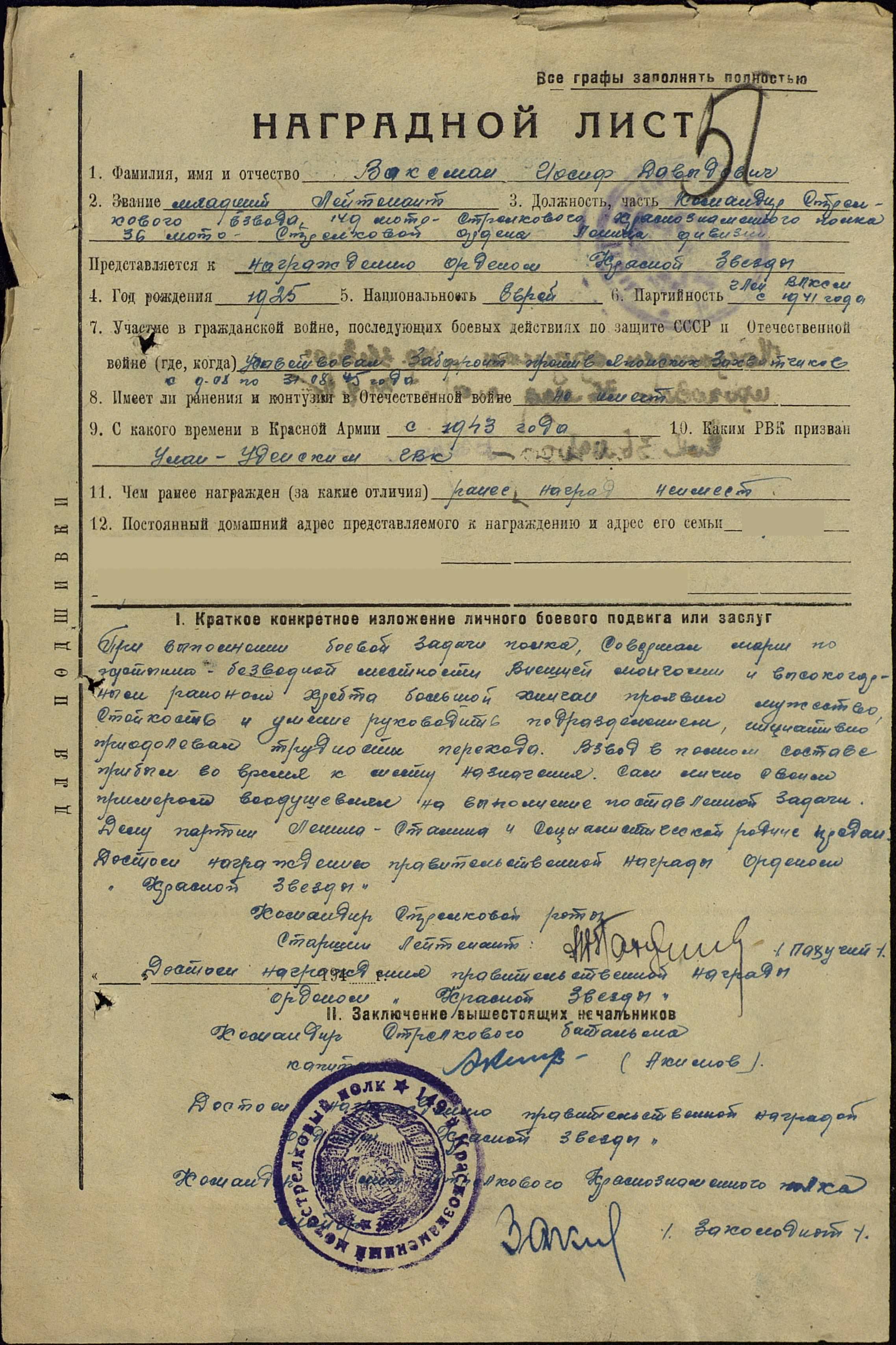 Ваксман Иосиф Давыдович родился в 1925 году в Бурятская АССР, г. Улан-Уде . Еврей. Был призван в 1943 году. Звание – лейтенант. Командир стрелкового взвода 149-го стрелкового полка. Образование военное: Забайкальское военно-пехотное училище. Служил Командиром взвода с мая 1944 по август 1946 год.