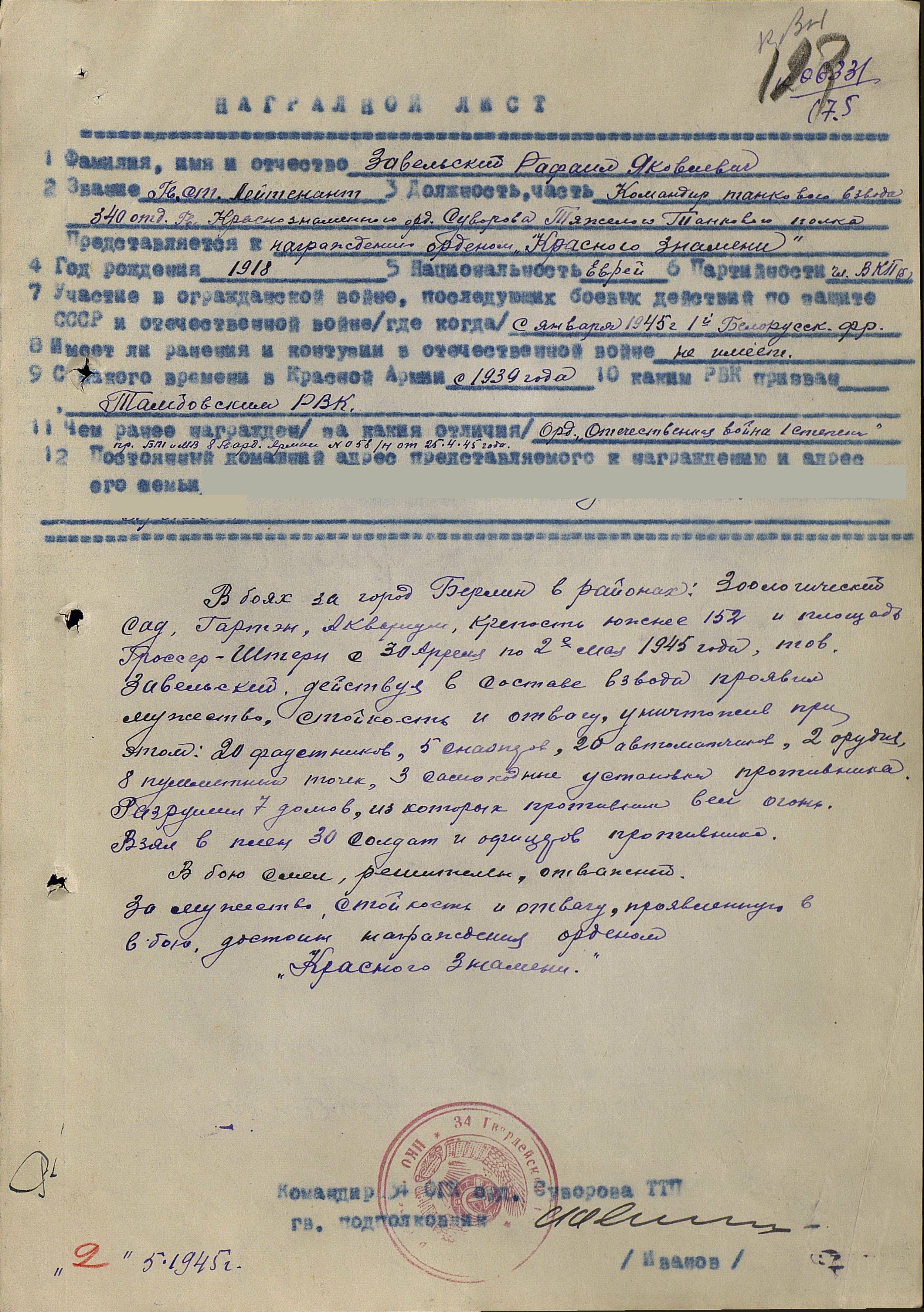Саперы сделали пролаз в высотном здании, и мы вечером первого мая пробрались со своим ИС-122 вовнутрь. Я с механиком Алешей выскочил, чтобы осмотреться вокруг и наметить план действия, но тут разорвалась мина, и Алешу ранило, пришлось отнести его в медсанбат. Бой пришлось продолжать втроем. За рычаги сел заряжающий гвардии старший сержант по имени Архип, которого прислали вместо погибшего Валентина Захарова. До нас он выскакивал из двух сгоревших танков. Потихоньку продвигаемся вперед.