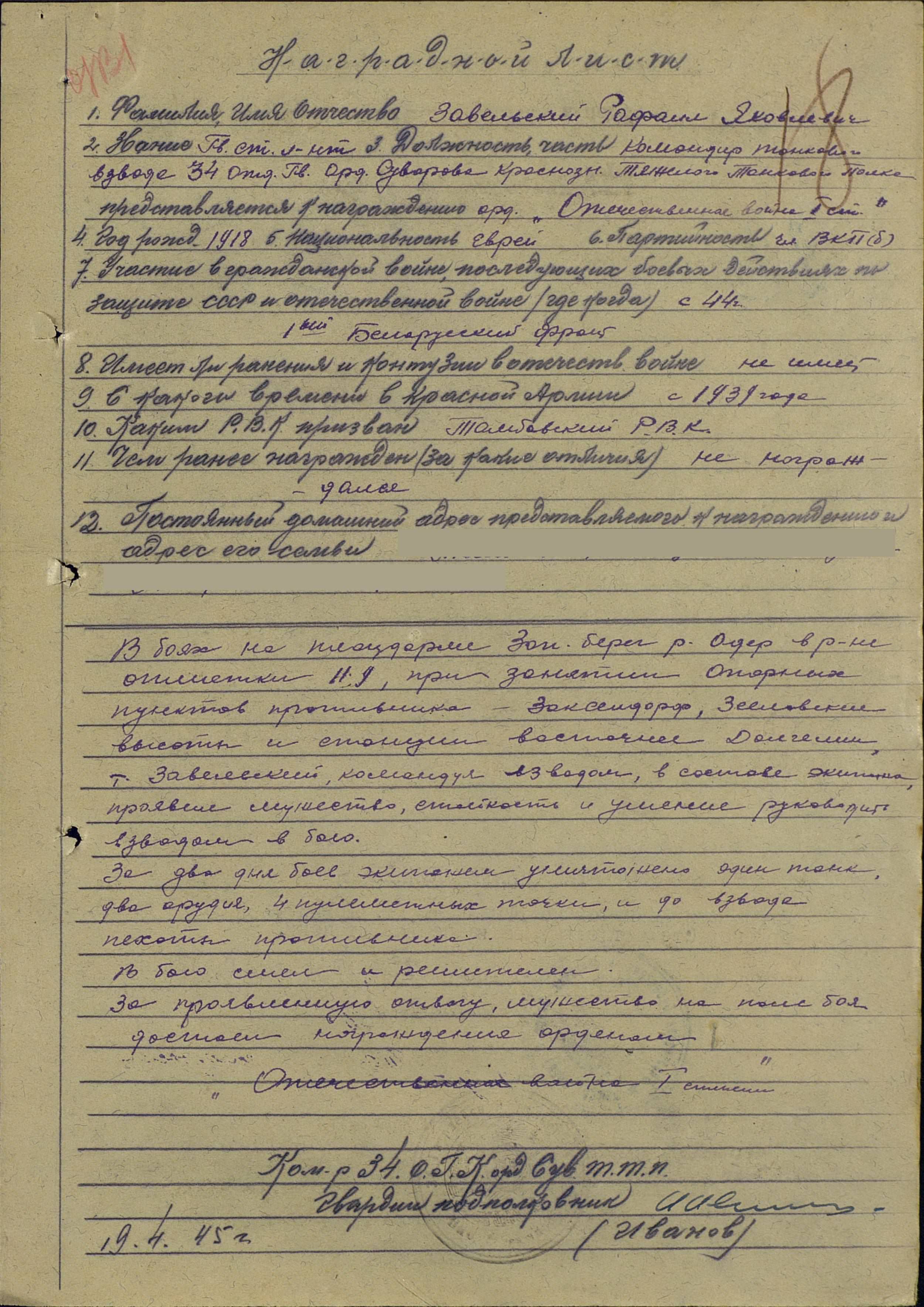 Меня зовут Завельский Рафаил Яковлевич, я бывший командир 2-го танкового взвода третьей роты, 34 Гвардейского Краснознаменного орденов Суворова и Кутузова тяжелого танкового полка прорыва 62-8 гвардейской ордена Ленина армии Первого Белорусского фронта. Я инвалид Отечественной войны II группы.