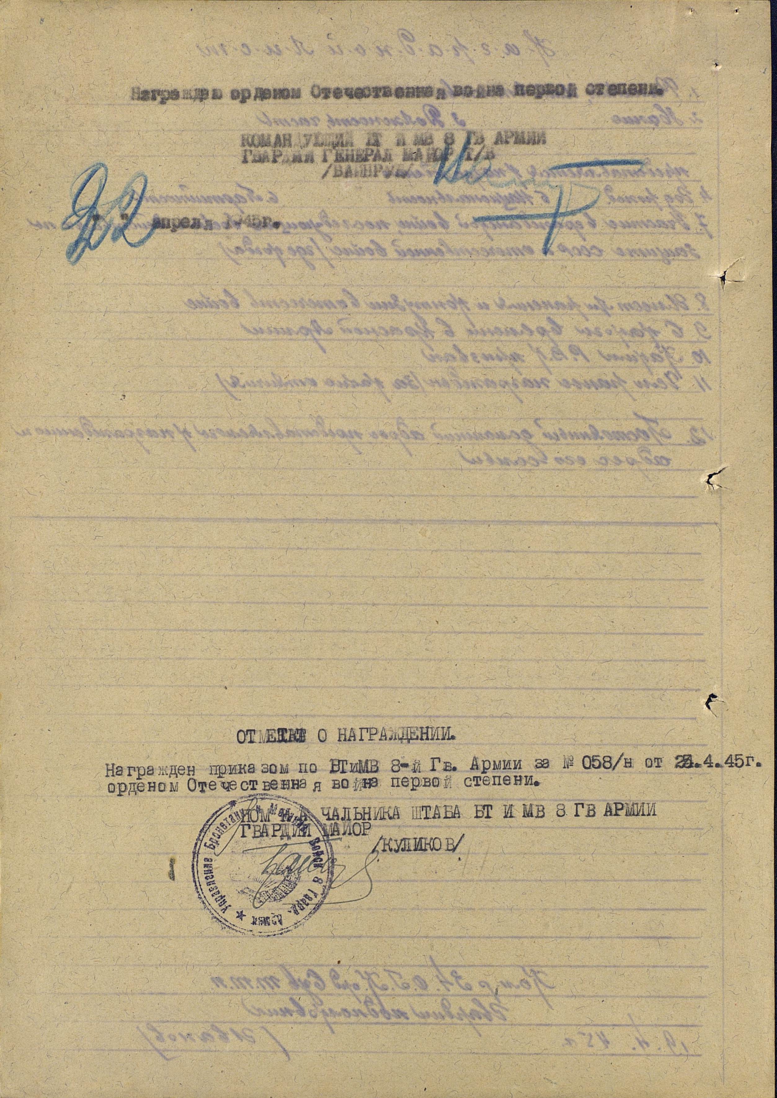 Нас поддерживали автоматчики, одному из них разворотило ступню. К 24.00 сопротивление было подавлено. Нам прислали нового механика — гвардии старшину, заправляемся топливом и боекомплектом и в 01.00 второго мая получаем последний приказ от начальника штаба полка гвардии подполковника Пономаренко: захватить Александер-Плац. Темно, начальник штаба развернул карту, начальник разведки гвардии капитан Петров посветил фонарем, распланировали маршрут, как нам пробираться. В это время невдалеке с правого борта разорвался снаряд или мина, мы все так и присели. К счастью, никого не ранило. В это время приходит механик, родом из Еревана, гвардии техник-лейтенант, в полк он прибыл недавно, у него сожгли самоходку. Я скомандовал: “По местам!”, и мы начали выполнять приказ.