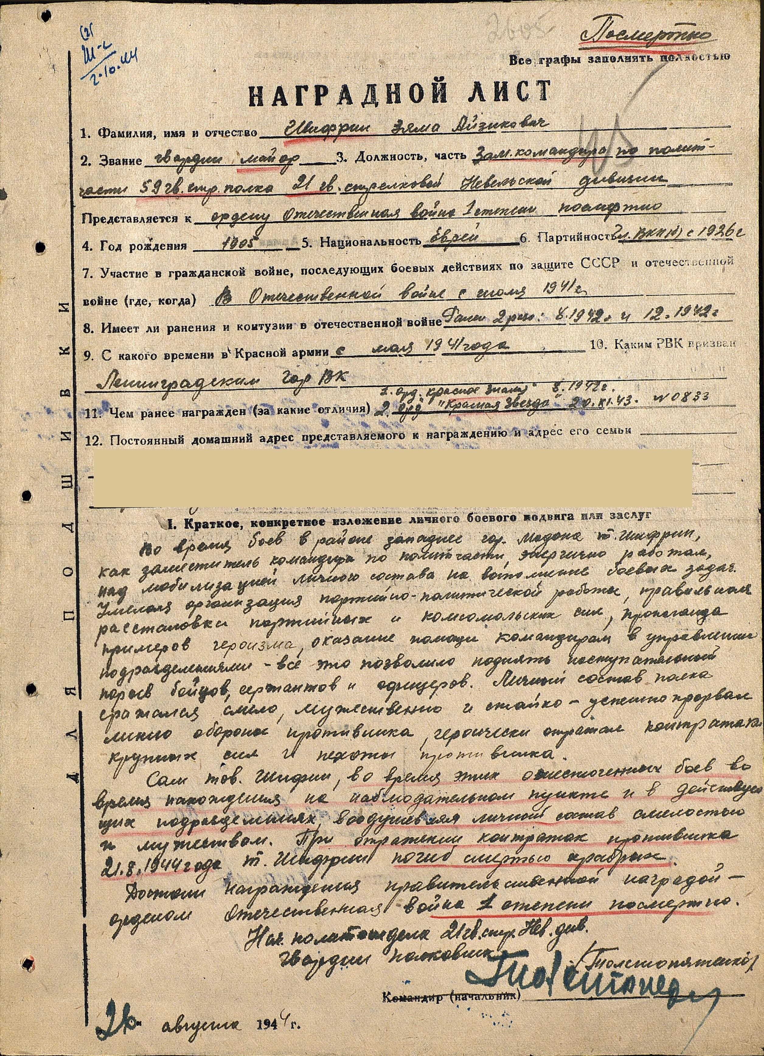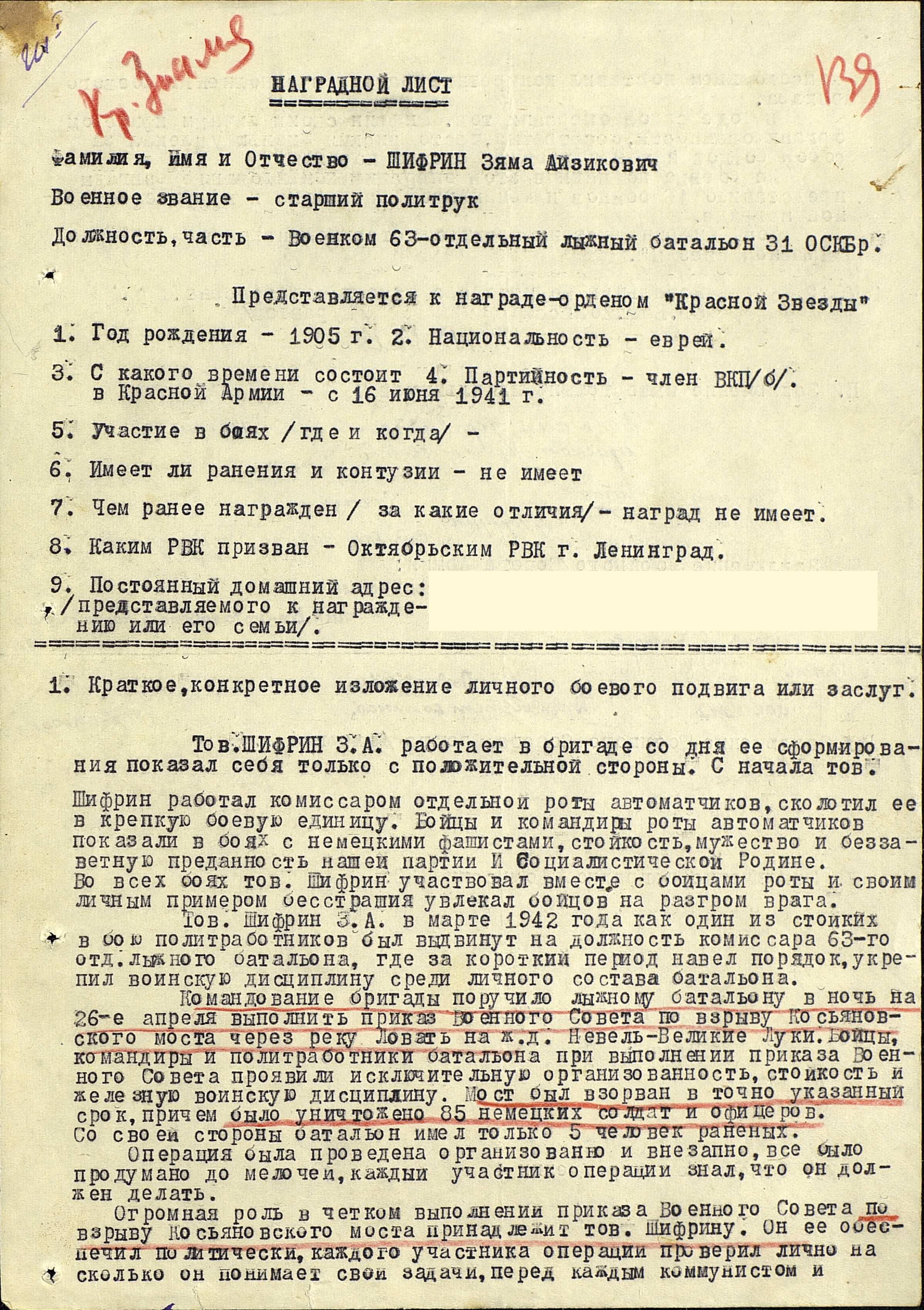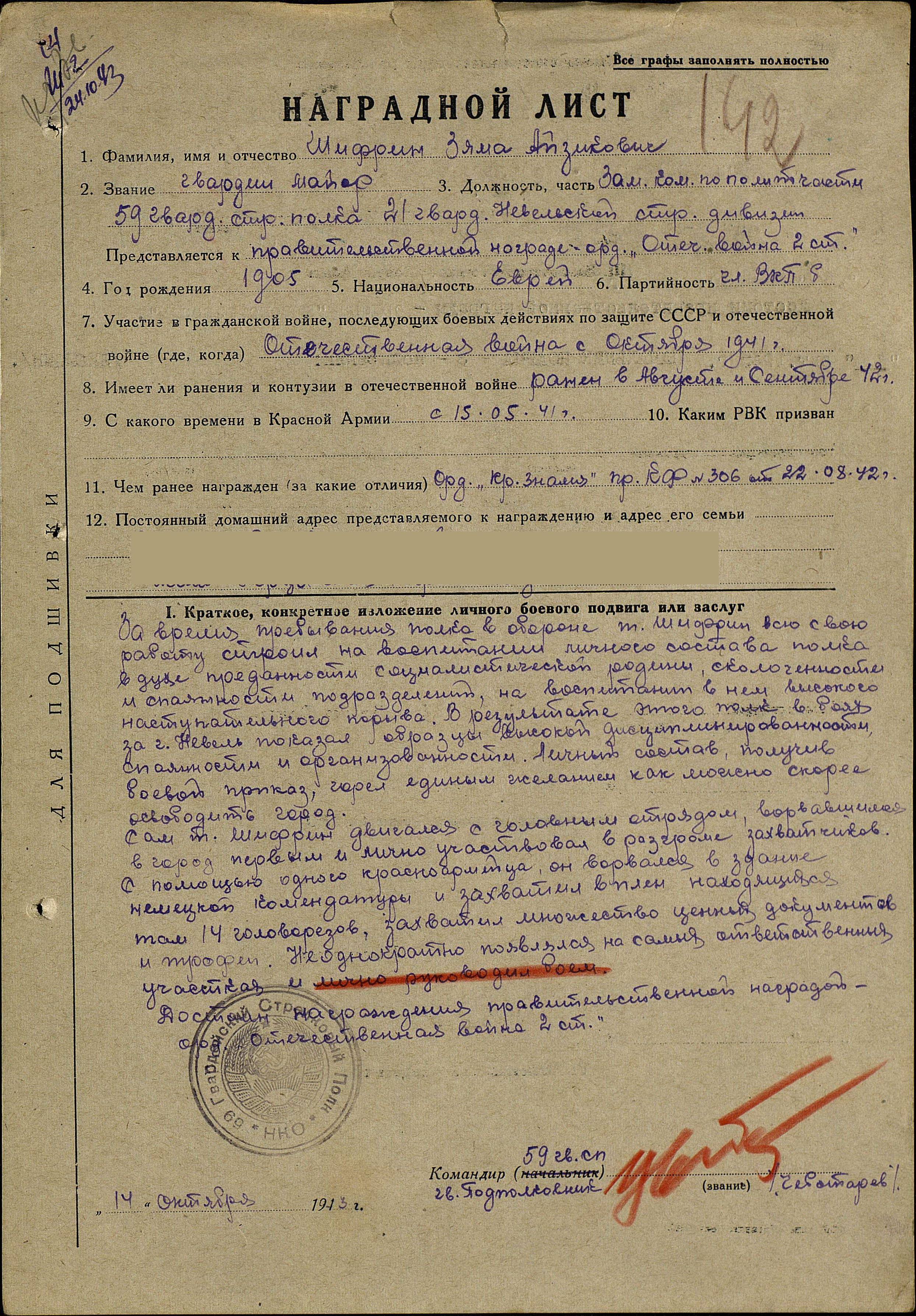 Гвардии майор ШИФРИН ЗЯМА АЙЗИКОВИЧ, 1905 г.р., родился - г. Гомель, Белорусской ССР. В РККА и на фронте Великой Отечественной войны с 1941 г. - Заместитель командира по по политчасти 59 гвардейского Двинского стрелкового полка, 21 гвардейской стрелковой дивизии Боевые награды: 1.Орден "КРАСНОГО ЗНАМЕНИ" (номер записи в базе данных: 10036854 на старшего политрука 63-го отдельного Лыжного батальона 31 ОСКБр (отдельной стрелковой Краснознамённой бригады). 2. Орден "КРАСНАЯ ЗВЕЗДА"( номер записи в базе данных: 18462186 на заместителя командира по политической части 59-го гвардейского СП 21-й гвардейской Невельской СД); 3.Орден "ОТЕЧЕСТВЕННАЯ ВОЙНА" 1 степени (номер записи в базе данных: 32799776) на сайте http://www.podvignaroda.mil.ru/ Общедоступный электронный банк документов «Подвиг Народа в Великой Отечественной войне 1941-1945 гг.» Убит, в бою, 21. 4. 1944. Захоронен: 1.2 км. юго-восточнее станции ЭРГЛА,Латвия. . Вечная память Героям павшим за Свободу и Независимость нашей Родины! http://www.pobeda1945.su/frontovik/20864
