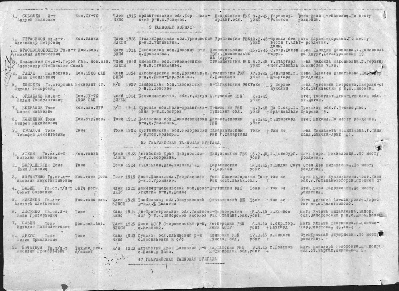 Командир танка Т- 34 65 гвардейской танковой Севско - Померанской ордена Ленина дважды Краснознамённой орденов Суворова, Кутузова и Богдана Хмельницкого бригады, 9 гвардейского танкового корпуса, 1 Белорусского фронта.