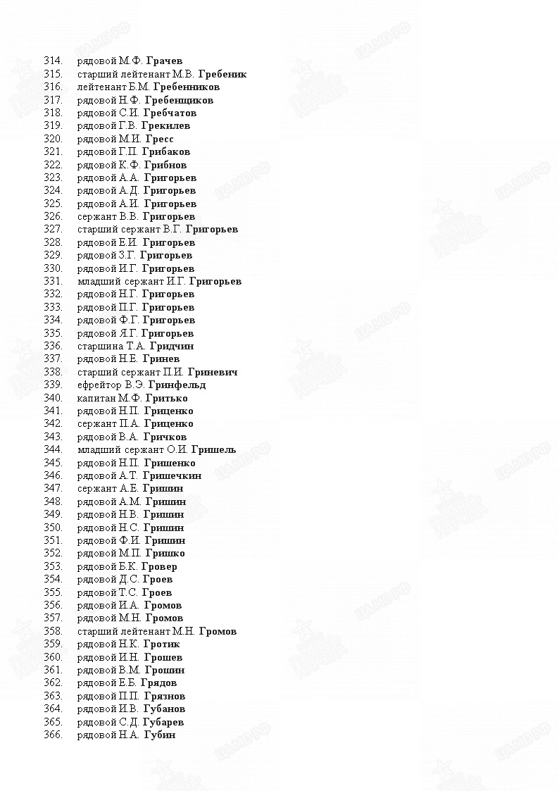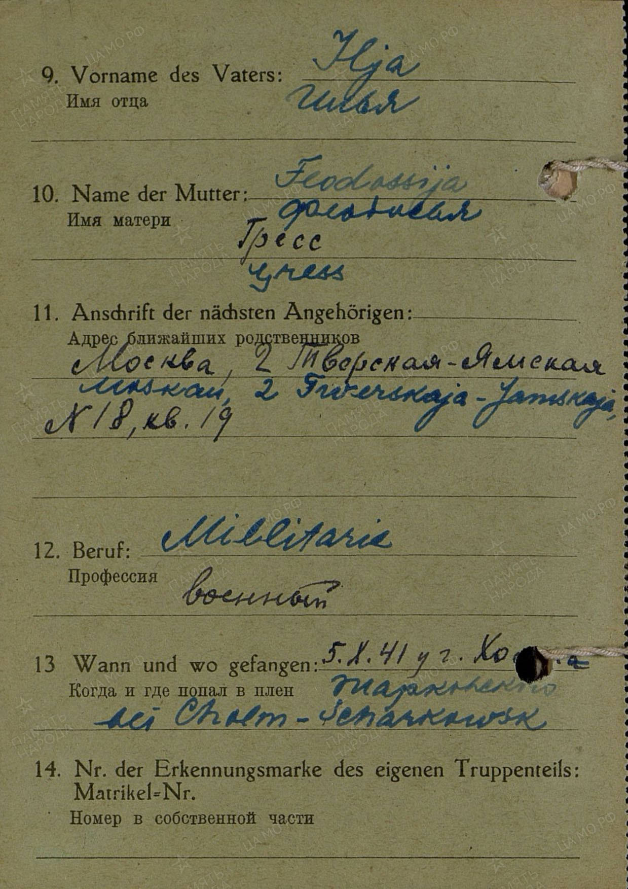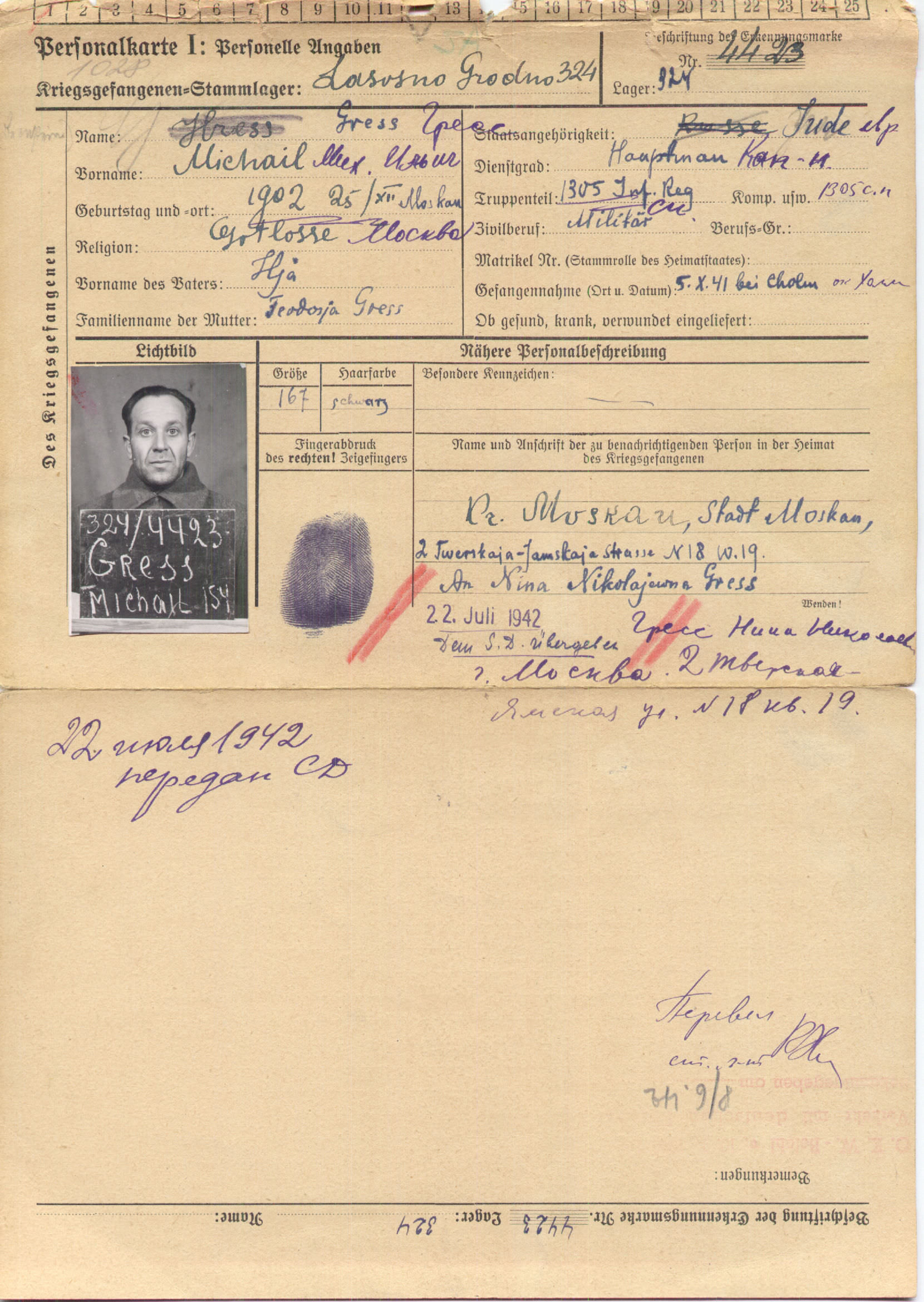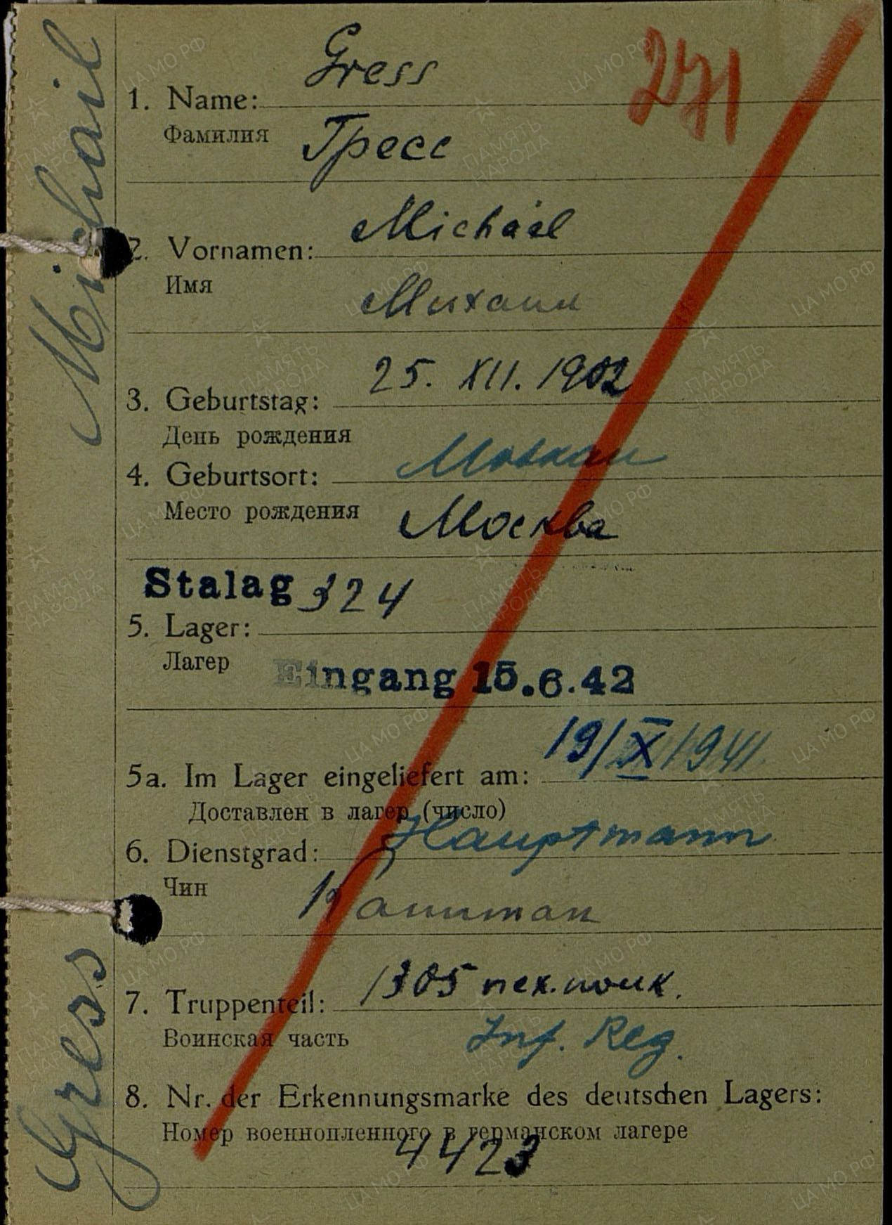 Капитан ГРЕСС МИХАИЛ ИЛЬИЧ, 25.12.1902 года рождения, место рождения Российская Империя, Московская губерния, губернский город Москва (по административному делению СССР: РСФСР, Московская область, г. Москва), еврей. Кадровый офицер. В Великой Отечественной войне с 07.1941 года на Западном фронте, офицер 1307 стрелкового полка, 13 Московской стрелковой дивизии народного ополчения (Ростокинского района; с 26.09.1941 года, преобразована в 140 стрелковую дивизию) Пленён, 5.10.1941 года, во время кровопролитных боёв и гибели дивизии в Вяземском котле, в районе г. " Холм-Жирковским". В плену: шталаг ( лагерь для солдат и сержантов) 324, г. Гродно, Белорусской ССР; лагерный номер: 4423. 22.07.1942 года, как значащийся, по карте пленного, графе национальность: "Jude", передан, на уничтожение, службе безопасности СД (прим.: SD от нем. Sicherheits Dienst). С Великой Отечественной войны не вернулся: погиб в плену. Извещение: Московский ГВК, г. Москва, 2-я Тверская - Ямская улица, дом 18, квартира №19, жена - Гресс Нина Николаевна. Захоронен: Латвийская Республика, край Мадонский, регион Видземе, краевой город Мадона, у.. Пумпуру (Парковая гора) воинское братское захоронение . Вечная Слава и Память капитану ГРЕССУ МИХАИЛУ ИЛЬИЧУ, встретившему, достойно, тяжкую личную и военную судьбу!