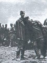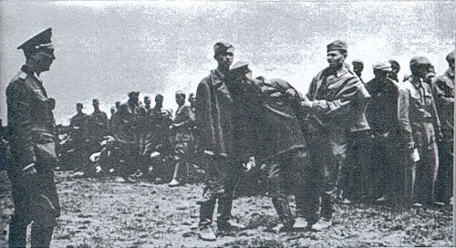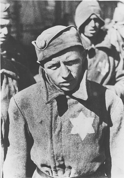 - авторское описание: "Минск, Белоруссия, 1941 год. Еврейские военнопленные в форме солдат Красной Армии и с желтыми звездами", из книги "Катастрофа советского еврейства", авт. И. Арад (https://clck.ru/NruPZ );