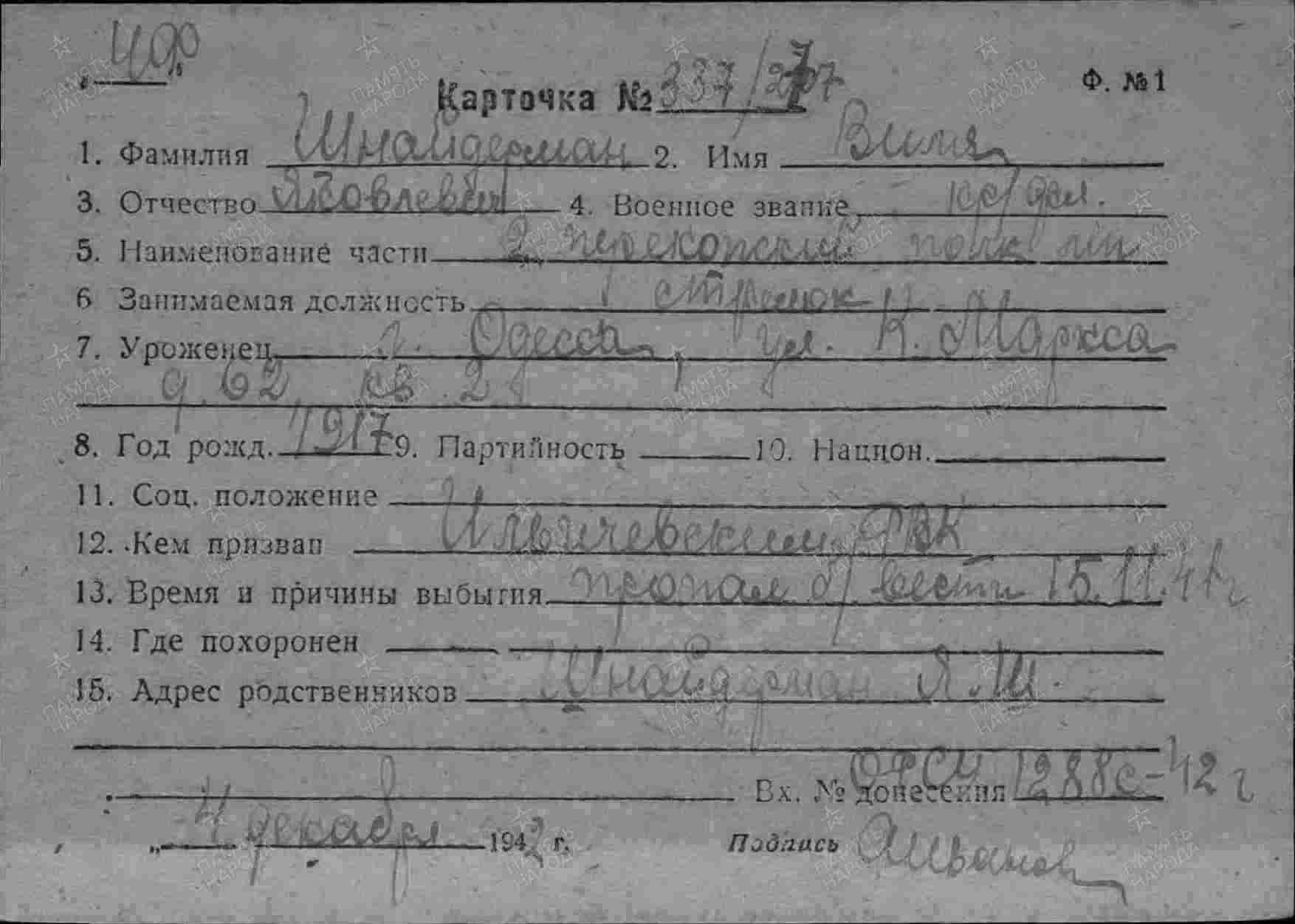 Краснофлотец ШНАЙДЕРМАН ВИЛЯ ЯКОВЛЕВИЧ, 1917 года рождения, место рождения - Украинская ССР, Одесская область, г. Одесса, еврей. На Черномоский флот призван Ильичевским РВК, г. Одессы. В Великой Отечественной войне в должности (последняя): Автоматчик 2 Перекопского полка морской пехоты Черноморского флота. С Великой Отечественной войны не вернулся: 15.11.1941 года, пропал, без вести, в бою. Извещение: Одесскийц ГВК, Украинская ССР, Лджесская область, г. Одесса,  ул. Карла Маркса, дом 62, квартира №21, отец -Шнайдерман Яков Шмульевич. Место захоронения: неизвестно. Вечная Слава и Память!