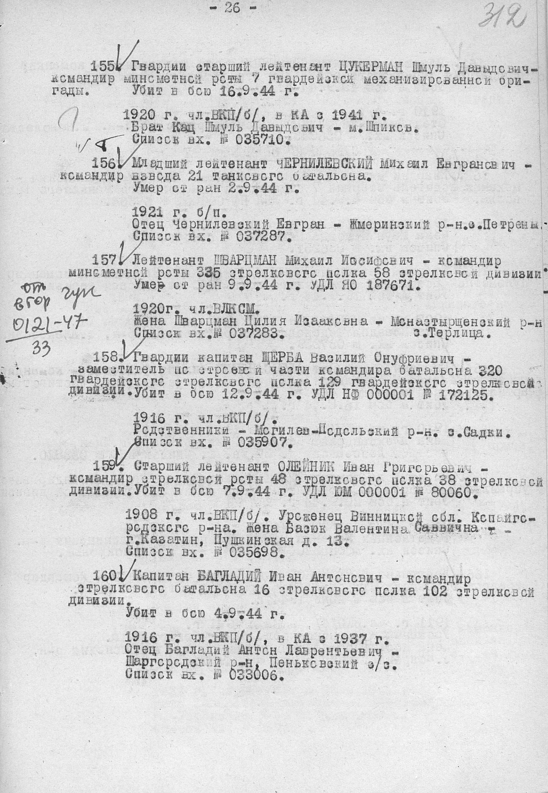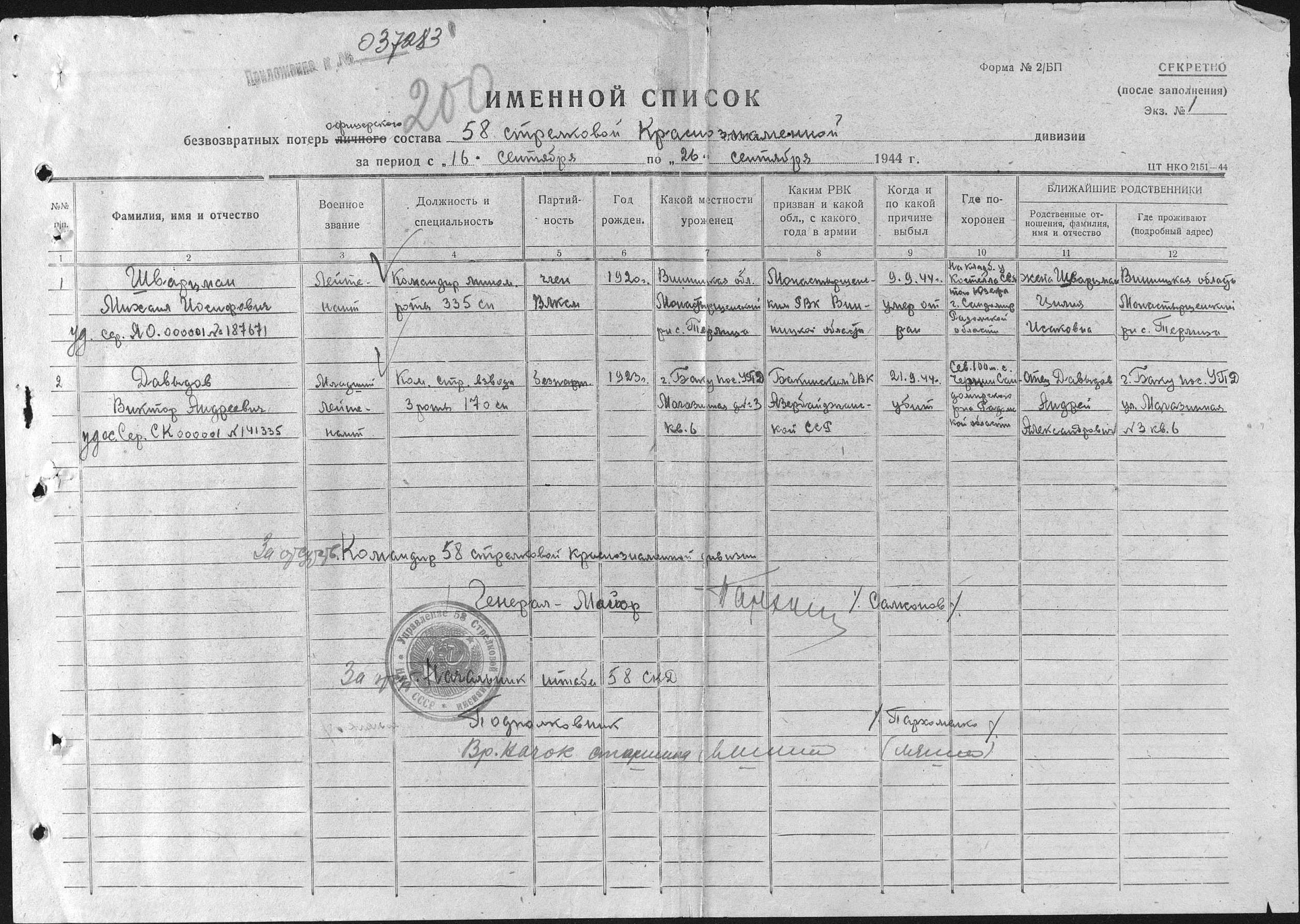 1. Приказ Главного Управления Кадров НКО СССР, о исключении из списков офицероского состава Красной Армии, в связи с гибелью( с ОБД "МЕМОРИАЛ").