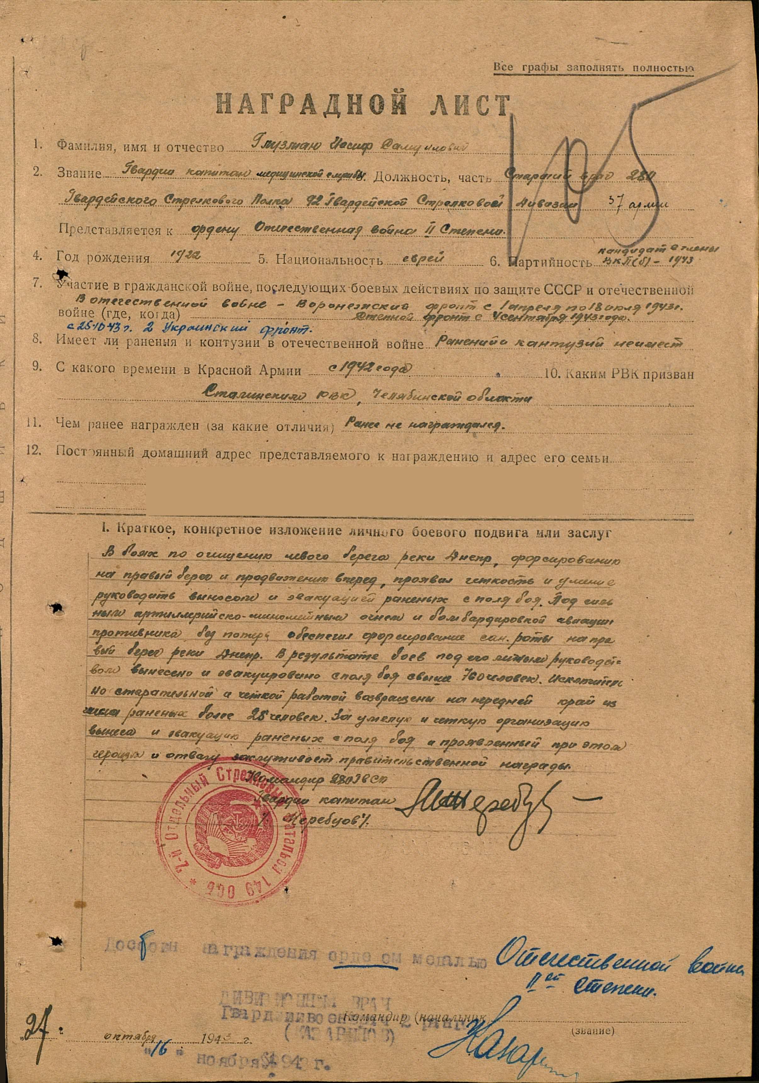 старший врач 280-го гвардейского стрелкового полка, 92-й гвардейской стрелковой дивизии, 2-го Украинского фронта 1943-1945