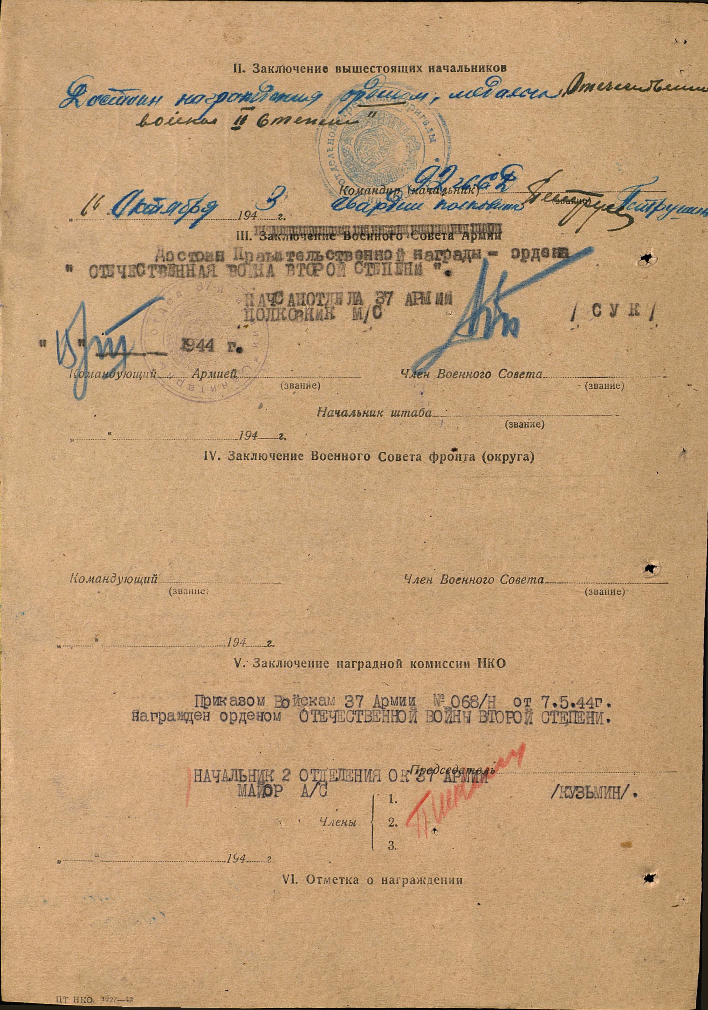 орден Отечественной войны 2-й степени, медаль "За Боевые Заслуги" и др. медали.