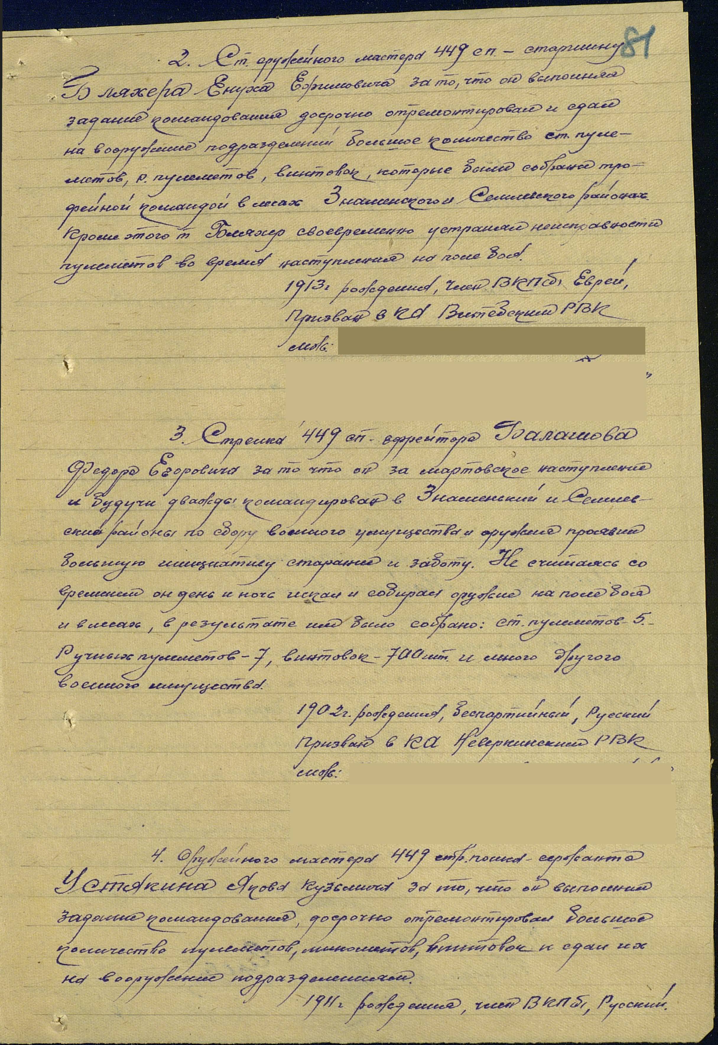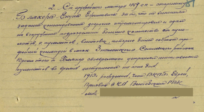 Ст. оружейного мастера 449 сп. – старшину Бляхера Енуха Ефимовича за то, что он выполнял задания командования, досрочно отремонтировал и сдал на вооружение подразделений большое количество ст. пулеметов, р. Пулеметов, винтовок, которые были собраны трофейной командой в лесах Знаменского и Селинского районах. Кроме этого т. Бляхер своевременно устранял неисправности пулеметов во время наступления на поле боя. Достоин награждения медалью "За Боевые Заслуги".