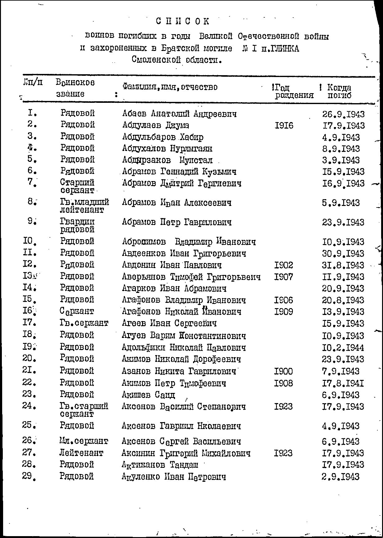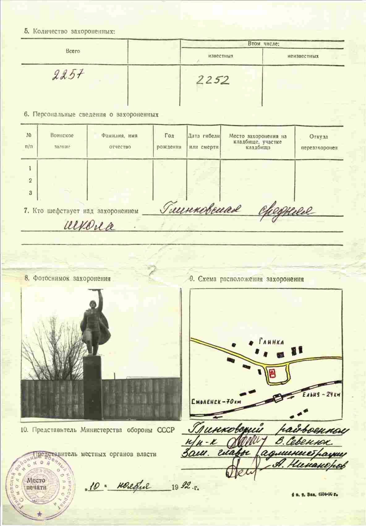 Похоронен в поселке Глинка, в сквере железнодорожного вокзала, в 22 км от г. Ельня.