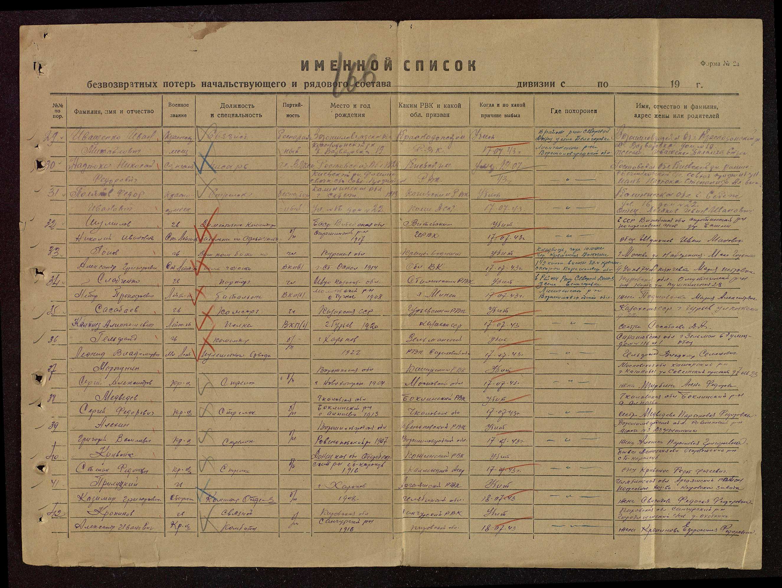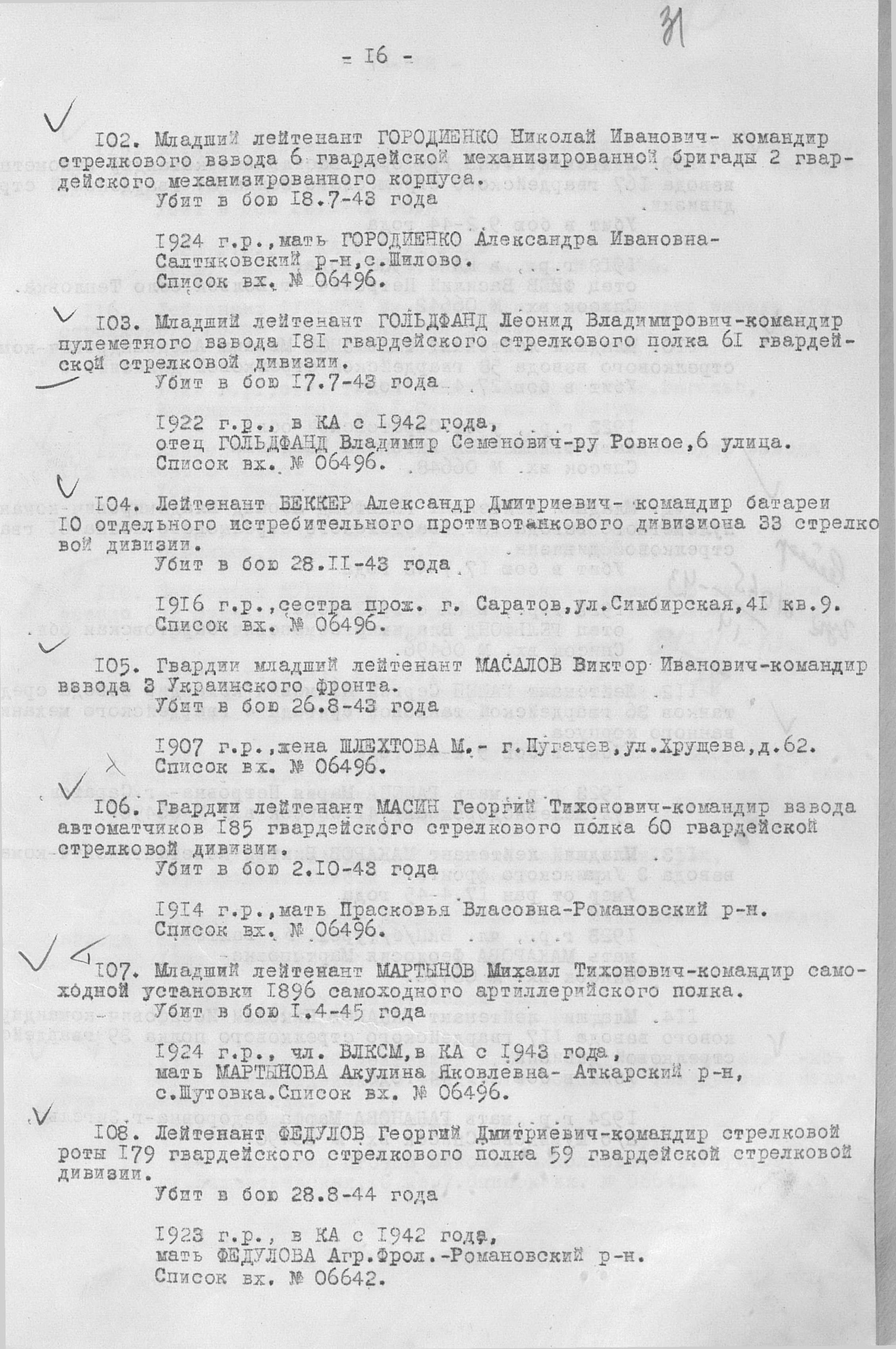 2. Именной список безвозвратных потерь офицерского состава 61 гвардейской стрелковой дивизии.