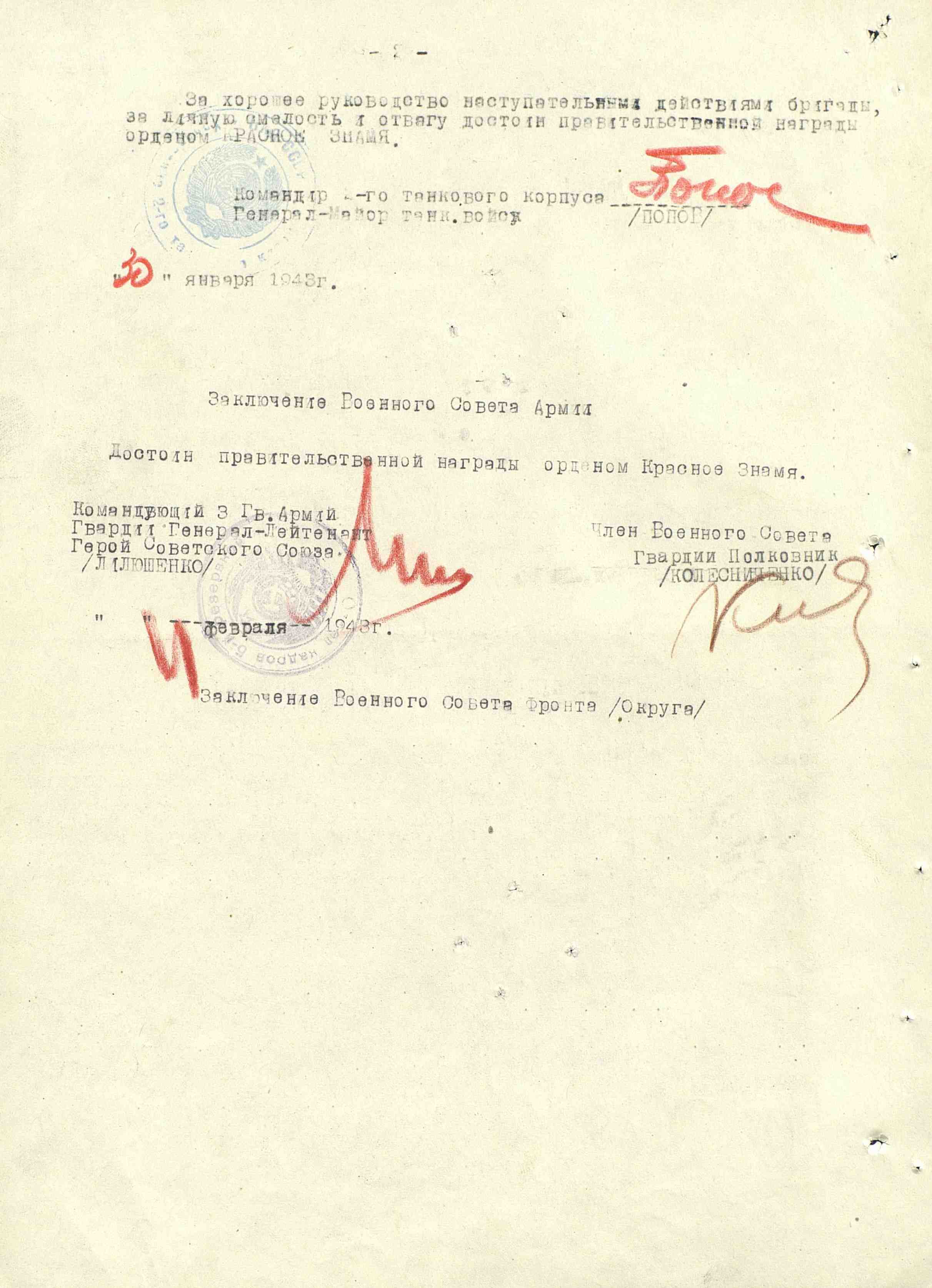 За хорошее руководство наступательными действиями бригады, за личную смелость и отвагу достоин правительственной награды орденом Красное Знамя.