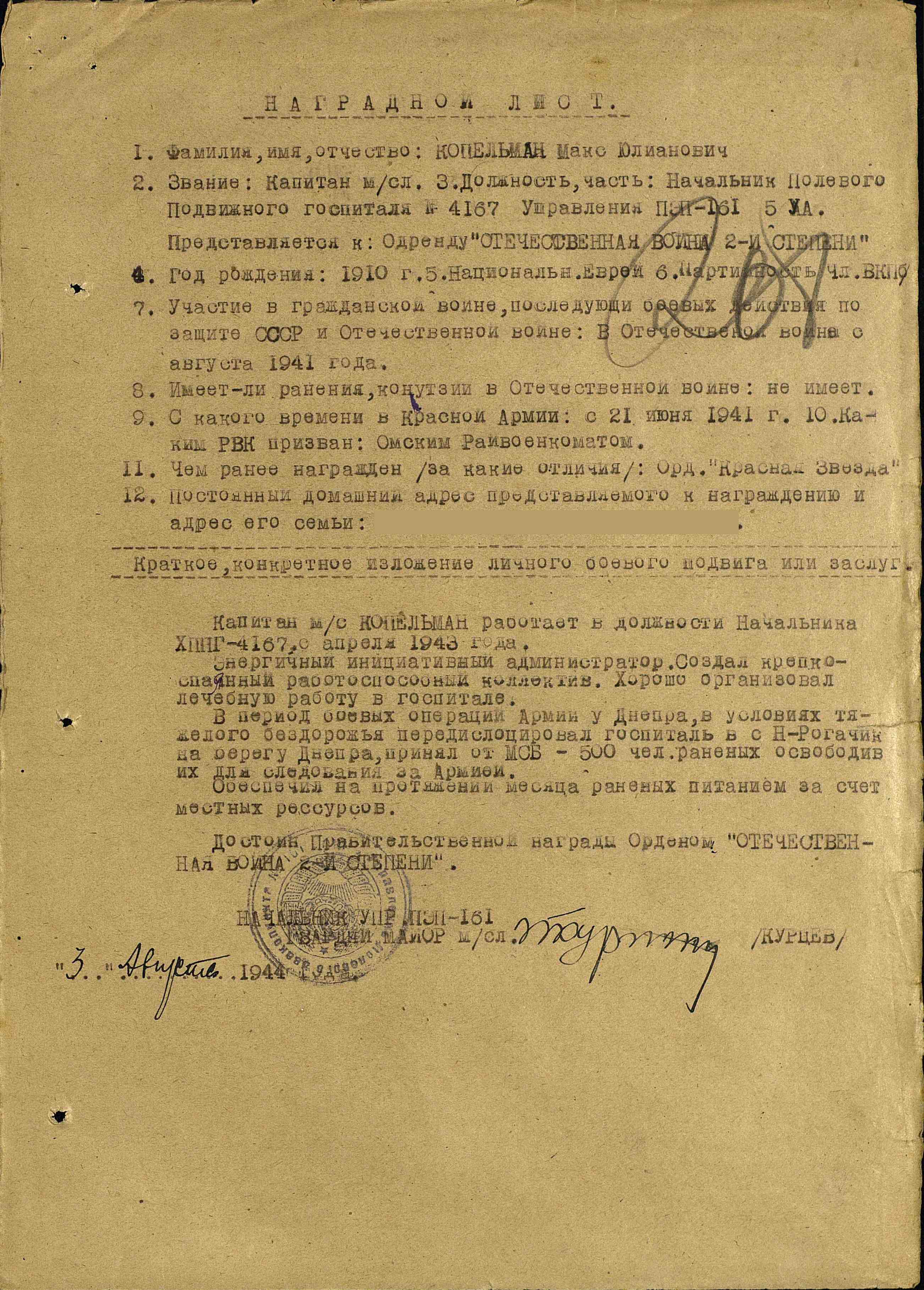 В период боевых операций Армии у Днепра, в условиях тяжелого бездорожья передислоцировал госпиталь в с Н-Рогачик на берегу Днепра, принял от МСБ-500 чел раненых освободив их для следования за Армией.