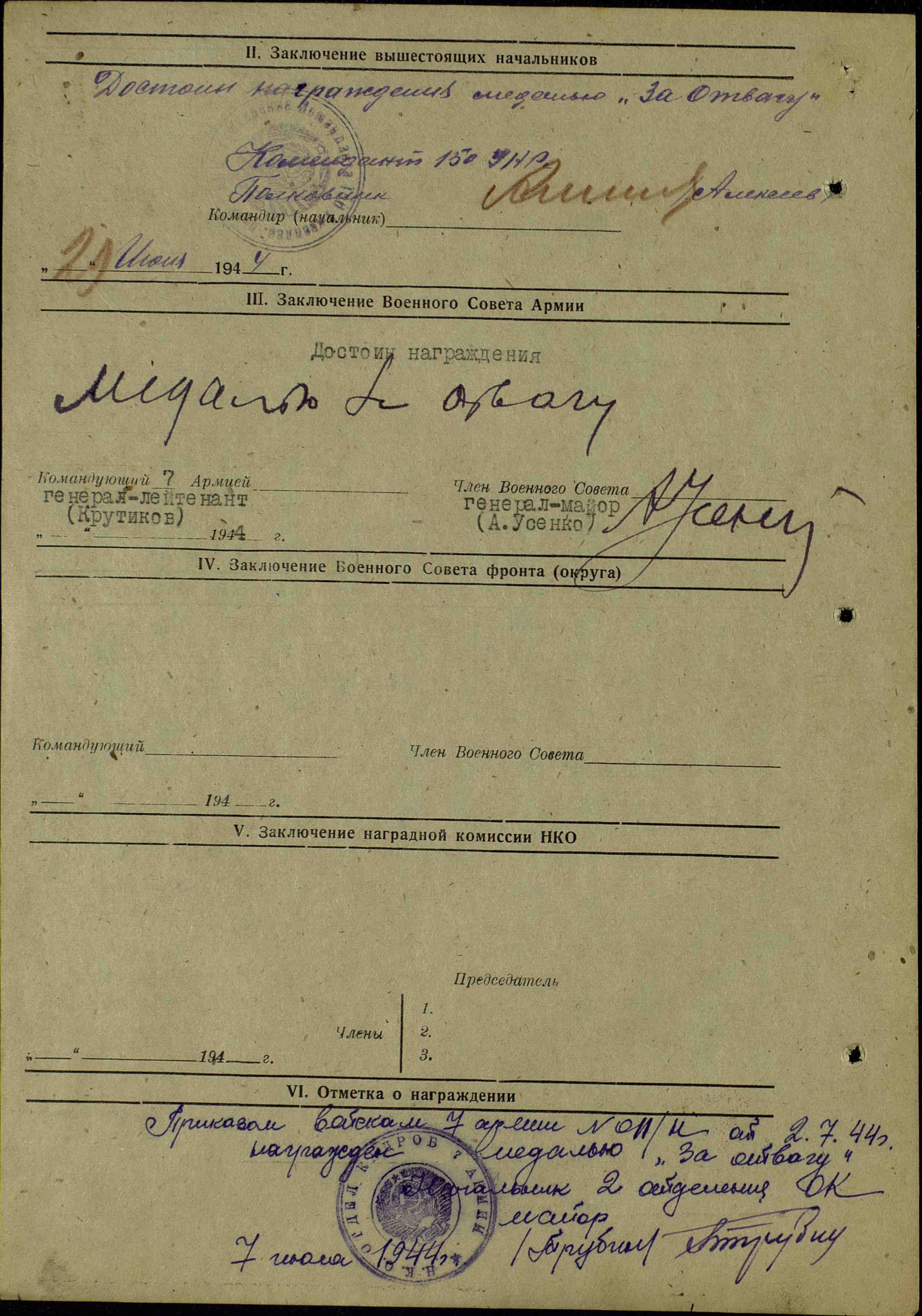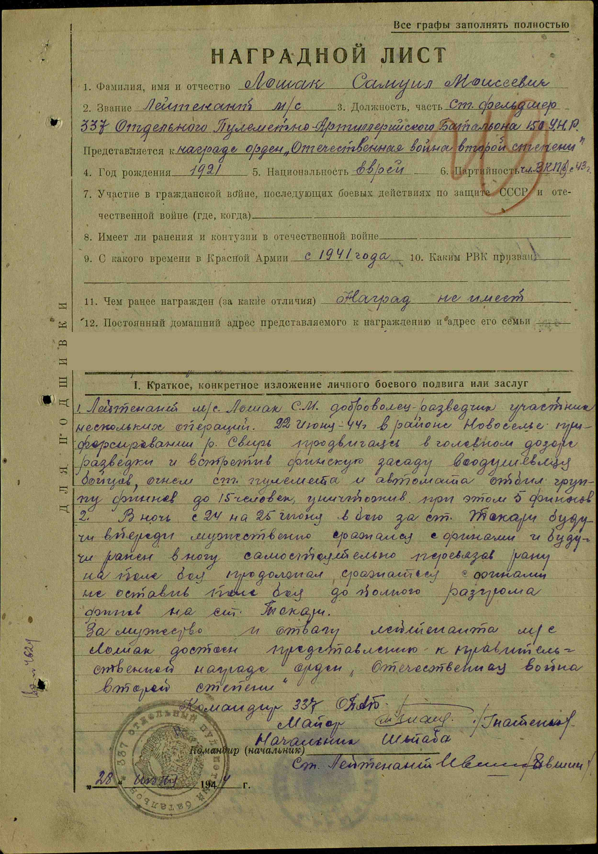 Старший фельдшер 337 отдельного пулеметно-артиллерийского батальона, 150 укреплённого района, 7 армии, Волховского фронта.