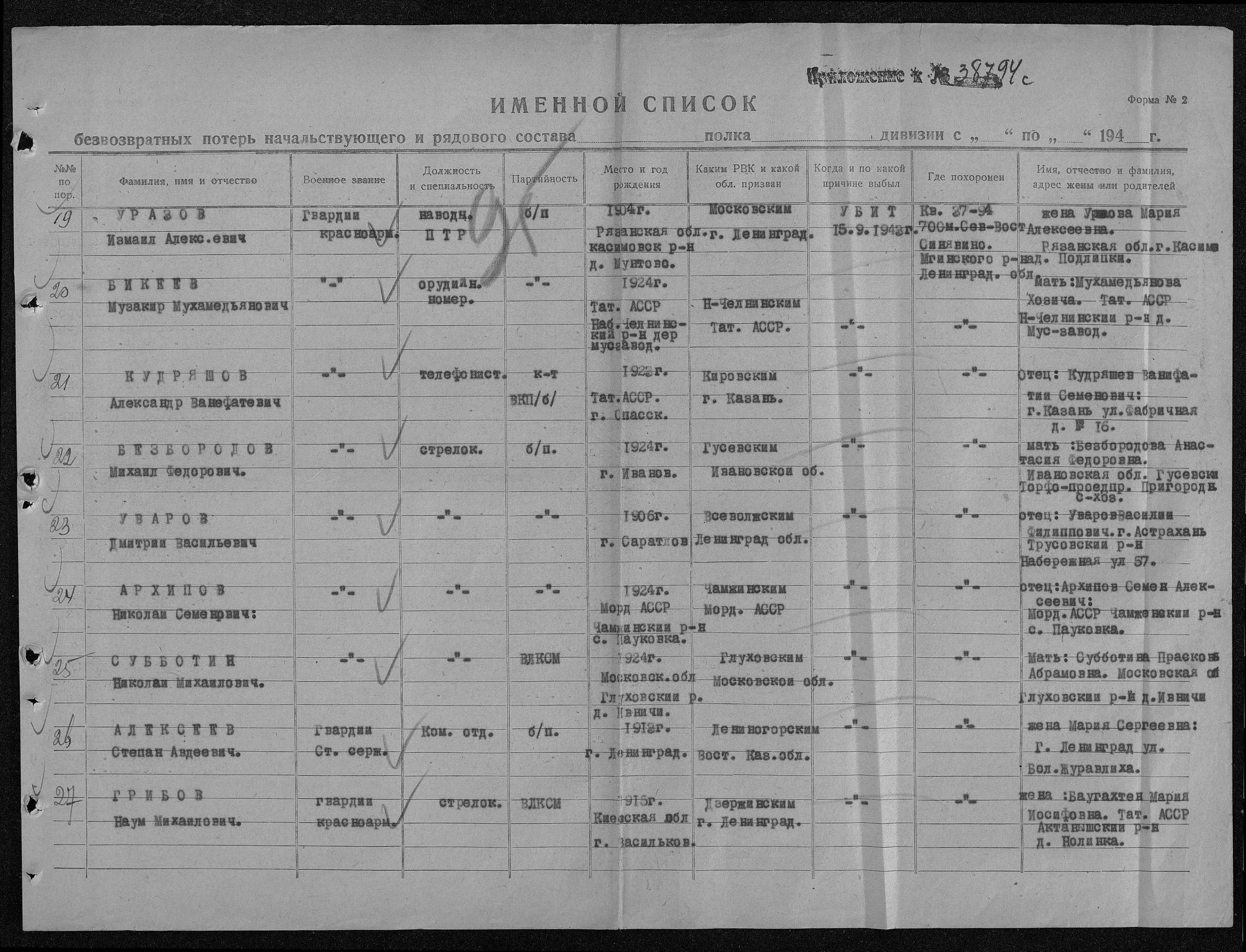 Похоронен в Ленинградской обл., Мгинский р-н, 37-94, п. Синявино, 700 м восточнее.