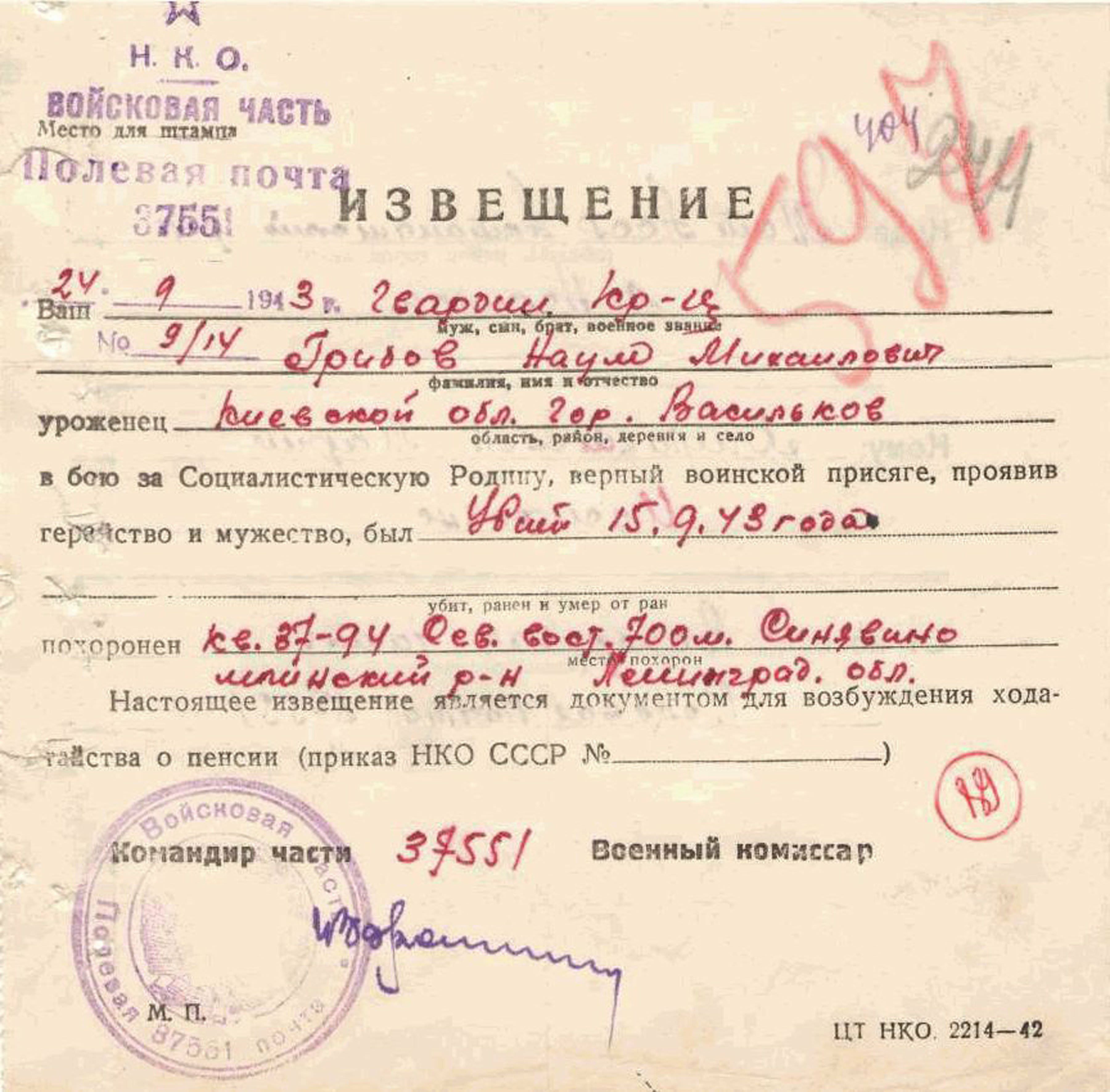Грибов Наум Михайлович родился в 1915 году в городе Василькове.