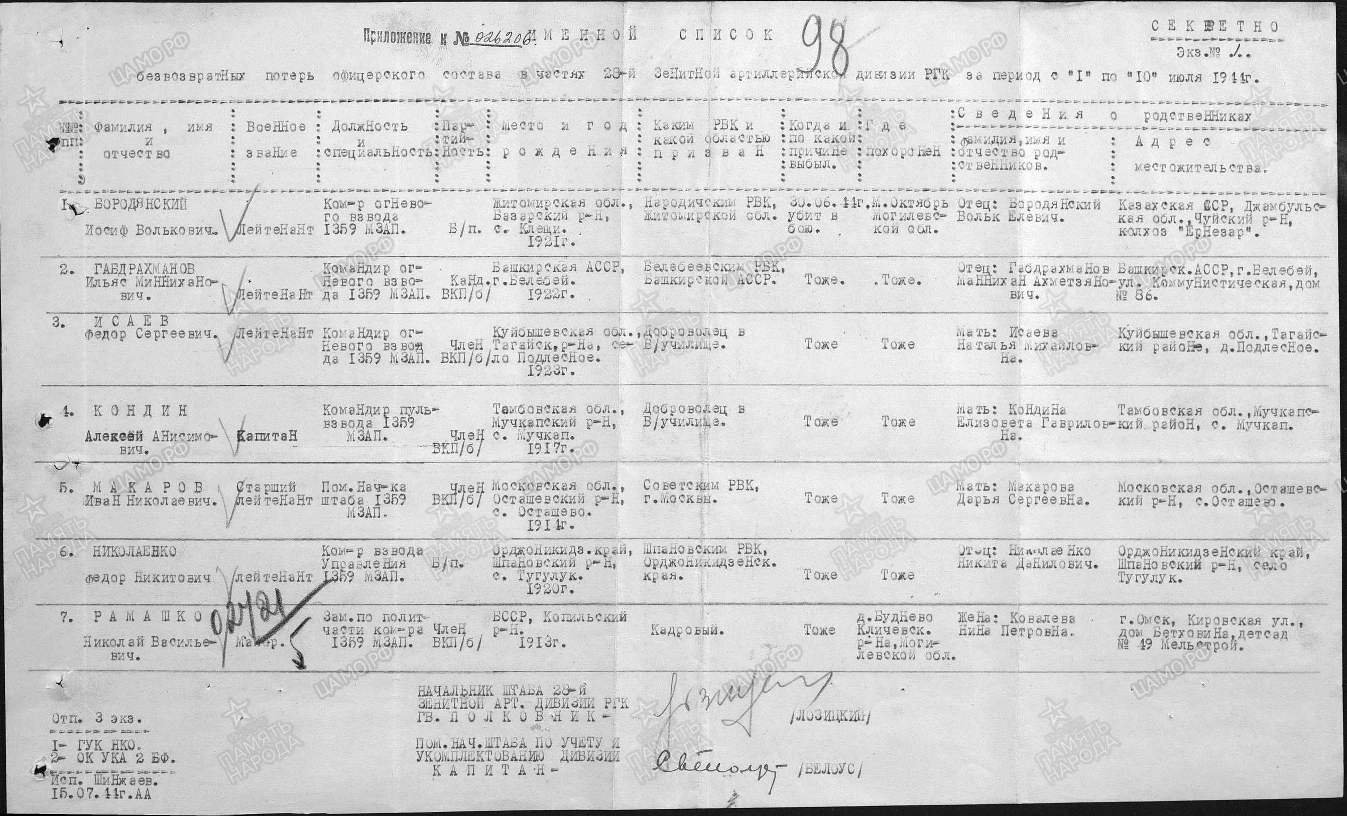 2. Именной список "Безвозвратных потерь офицерского состава 28 зенитно-артиллерийской дивизии РГК, 2 Белорусского фронта":
