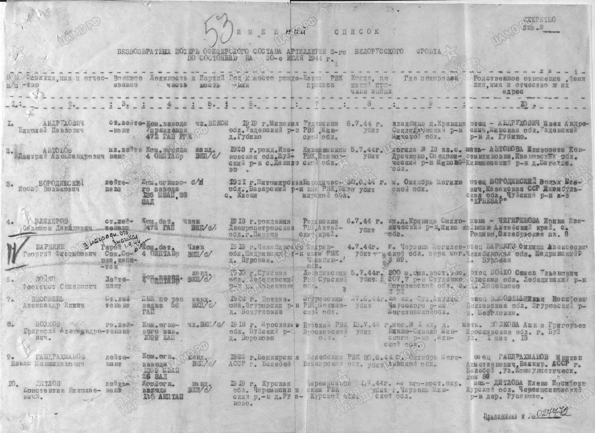 1. Именной список "Безвозвратных потерь офицерского состава артиллерии 2 Белорусского фронта":