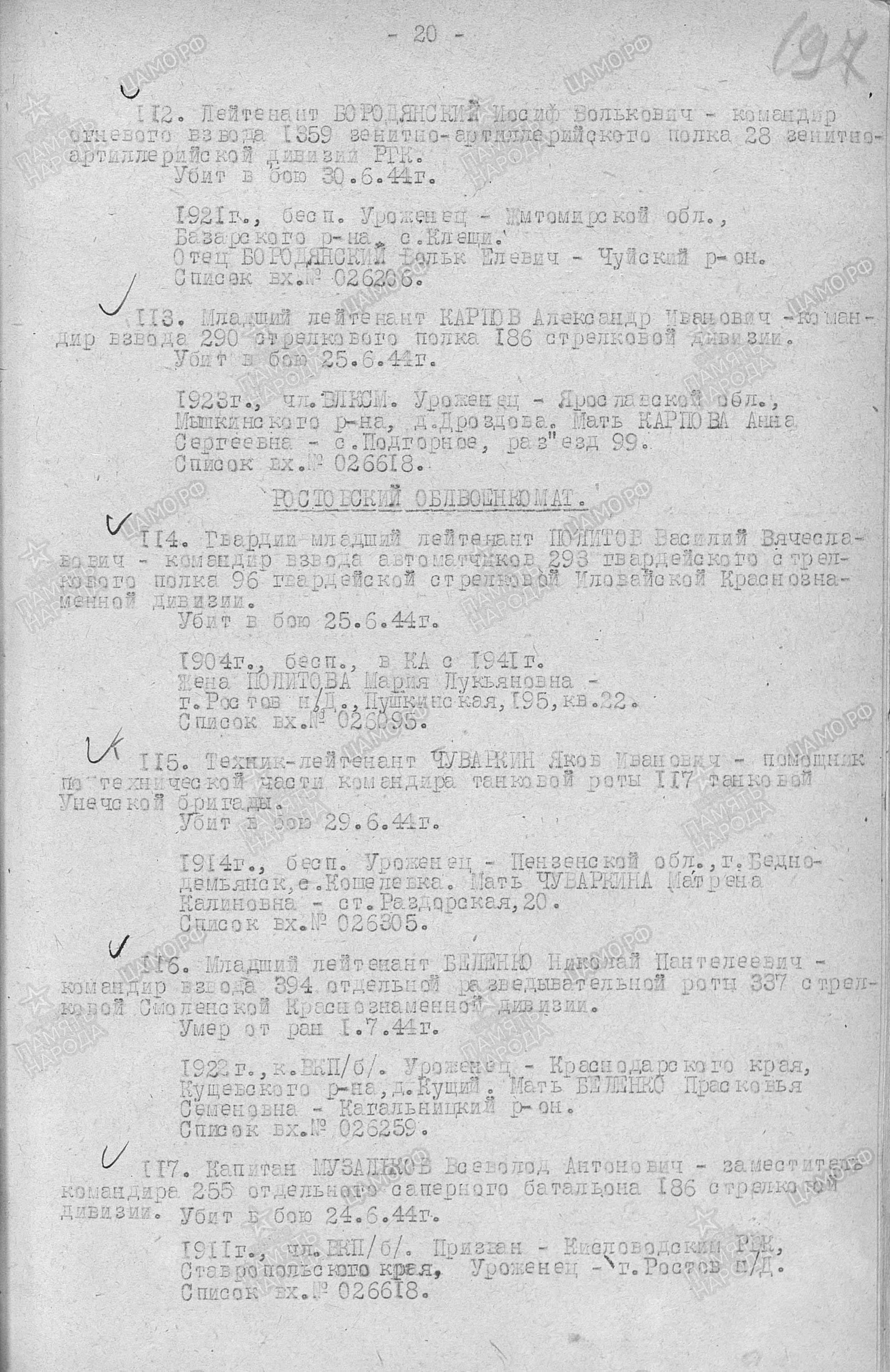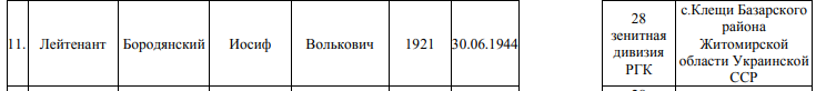 - №11, по списку, захороненных: Лейтенант БОРОДЯНСКИЙ ИОСИФ ВОЛЬКОВИЧ.
