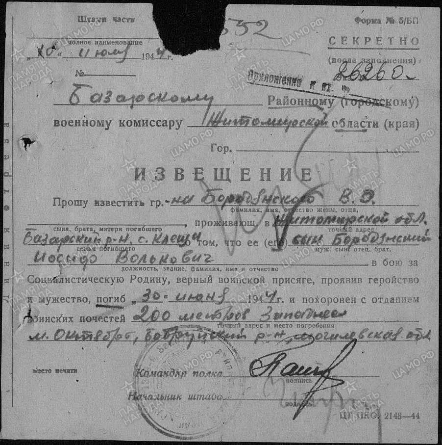Лейтенант БОРОДЯНСКИЙ ИОСИФ ВОЛЬКОВИЧ, 1921 года рождения, место рождения - СССР, Украинская ССР, Житомирская область, Базарский район, м. Клещи, еврей. В РККА призван Народичским РВК, Житомирской области, в 1941 году. В Великой Отечественной войне с 1941 года - Командир огневого взвода 1359 зенитно-артиллерийского полка, 28 зенитно-артиллерийской дивизии РГК, 2 Белорусского фронта. Ранения: нет. Боевые награды: нет. С Великой Отечественной войны не вернулся - убит, в бою, 30.06.1944 года. Извещение: Джамбульский Областной Военный Комиссарит, Казахская ССР, Джамбульская область, Чуйский район, колхоз "Ернезар", отец - Бородянский Вольк Элевич. Захоронен: Белорусская ССР, Могилевская область, м. Октябрь; в настоящее время: Белорусская ССР, Могилевская область, Бобруйский район, Ковалевский сельский совет, деревня Октярь, братское воинское захоронение; в настоящее время: Республика Беларусь, Могилёвская область, Бобруйский район, Ковалевский сельский совет, аг. Ковали, братское воинское захоронение. Вечная Слава и Память!